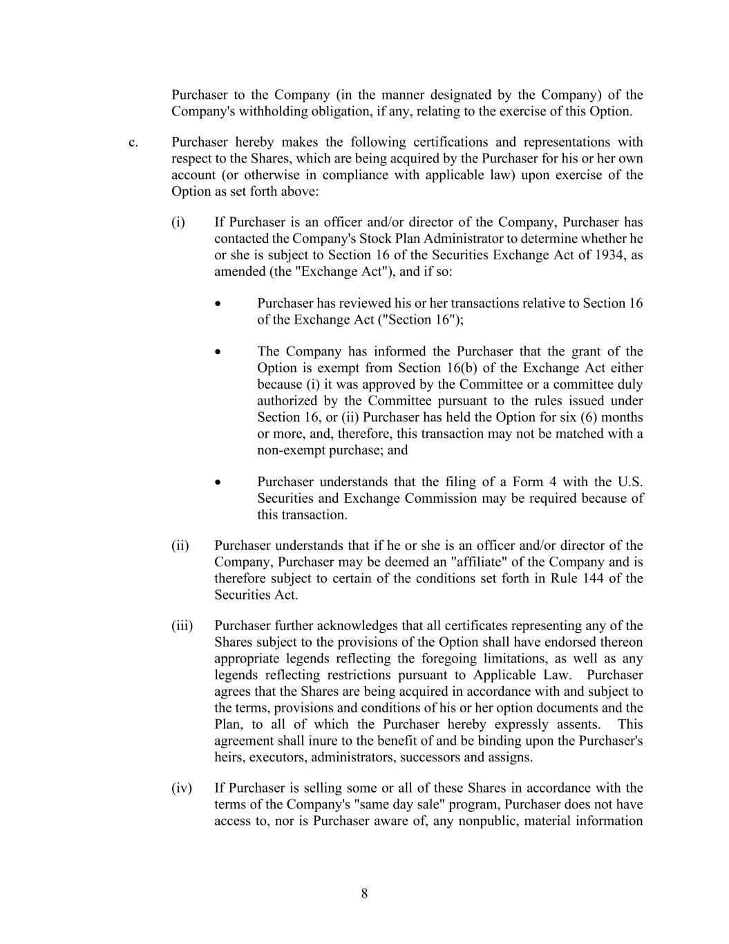 8 Purchaser to the Company (in the manner designated by the Company) of the Company's withholding obligation, if any, relating to the exercise of this Option. c. Purchaser hereby makes the following certifications and representations with respect to the Shares, which are being acquired by the Purchaser for his or her own account (or otherwise in compliance with applicable law) upon exercise of the Option as set forth above: (i) If Purchaser is an officer and/or director of the Company, Purchaser has contacted the Company's Stock Plan Administrator to determine whether he or she is subject to Section 16 of the Securities Exchange Act of 1934, as amended (the "Exchange Act"), and if so: • Purchaser has reviewed his or her transactions relative to Section 16 of the Exchange Act ("Section 16"); • The Company has informed the Purchaser that the grant of the Option is exempt from Section 16(b) of the Exchange Act either because (i) it was approved by the Committee or a committee duly authorized by the Committee pursuant to the rules issued under Section 16, or (ii) Purchaser has held the Option for six (6) months or more, and, therefore, this transaction may not be matched with a non-exempt purchase; and • Purchaser understands that the filing of a Form 4 with the U.S. Securities and Exchange Commission may be required because of this transaction. (ii) Purchaser understands that if he or she is an officer and/or director of the Company, Purchaser may be deemed an "affiliate" of the Company and is therefore subject to certain of the conditions set forth in Rule 144 of the Securities Act. (iii) Purchaser further acknowledges that all certificates representing any of the Shares subject to the provisions of the Option shall have endorsed thereon appropriate legends reflecting the foregoing limitations, as well as any legends reflecting restrictions pursuant to Applicable Law. Purchaser agrees that the Shares are being acquired in accordance with and subject to the terms, provisions and conditions of his or her option documents and the Plan, to all of which the Purchaser hereby expressly assents. This agreement shall inure to the benefit of and be binding upon the Purchaser's heirs, executors, administrators, successors and assigns. (iv) If Purchaser is selling some or all of these Shares in accordance with the terms of the Company's "same day sale" program, Purchaser does not have access to, nor is Purchaser aware of, any nonpublic, material information
