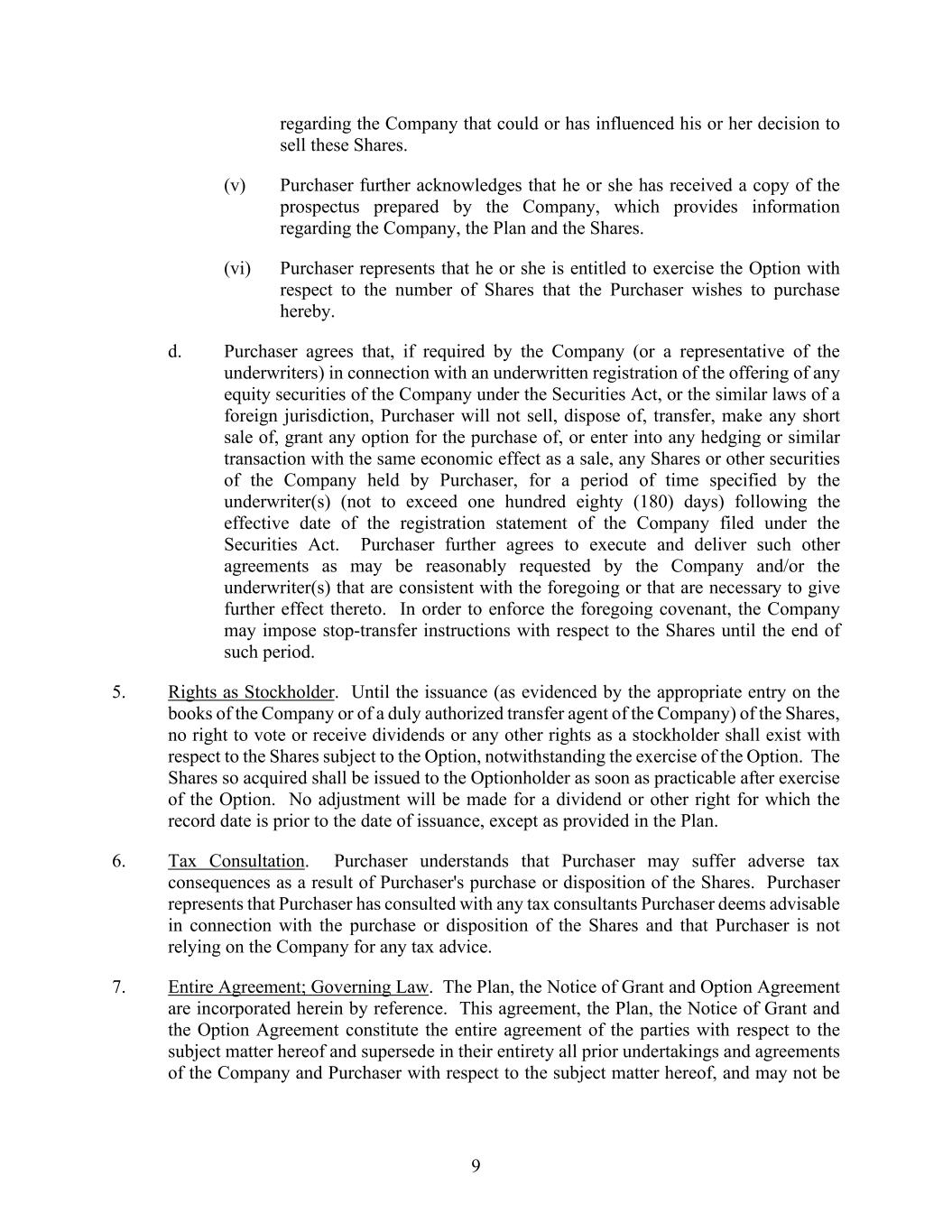 9 regarding the Company that could or has influenced his or her decision to sell these Shares. (v) Purchaser further acknowledges that he or she has received a copy of the prospectus prepared by the Company, which provides information regarding the Company, the Plan and the Shares. (vi) Purchaser represents that he or she is entitled to exercise the Option with respect to the number of Shares that the Purchaser wishes to purchase hereby. d. Purchaser agrees that, if required by the Company (or a representative of the underwriters) in connection with an underwritten registration of the offering of any equity securities of the Company under the Securities Act, or the similar laws of a foreign jurisdiction, Purchaser will not sell, dispose of, transfer, make any short sale of, grant any option for the purchase of, or enter into any hedging or similar transaction with the same economic effect as a sale, any Shares or other securities of the Company held by Purchaser, for a period of time specified by the underwriter(s) (not to exceed one hundred eighty (180) days) following the effective date of the registration statement of the Company filed under the Securities Act. Purchaser further agrees to execute and deliver such other agreements as may be reasonably requested by the Company and/or the underwriter(s) that are consistent with the foregoing or that are necessary to give further effect thereto. In order to enforce the foregoing covenant, the Company may impose stop-transfer instructions with respect to the Shares until the end of such period. 5. Rights as Stockholder. Until the issuance (as evidenced by the appropriate entry on the books of the Company or of a duly authorized transfer agent of the Company) of the Shares, no right to vote or receive dividends or any other rights as a stockholder shall exist with respect to the Shares subject to the Option, notwithstanding the exercise of the Option. The Shares so acquired shall be issued to the Optionholder as soon as practicable after exercise of the Option. No adjustment will be made for a dividend or other right for which the record date is prior to the date of issuance, except as provided in the Plan. 6. Tax Consultation. Purchaser understands that Purchaser may suffer adverse tax consequences as a result of Purchaser's purchase or disposition of the Shares. Purchaser represents that Purchaser has consulted with any tax consultants Purchaser deems advisable in connection with the purchase or disposition of the Shares and that Purchaser is not relying on the Company for any tax advice. 7. Entire Agreement; Governing Law. The Plan, the Notice of Grant and Option Agreement are incorporated herein by reference. This agreement, the Plan, the Notice of Grant and the Option Agreement constitute the entire agreement of the parties with respect to the subject matter hereof and supersede in their entirety all prior undertakings and agreements of the Company and Purchaser with respect to the subject matter hereof, and may not be