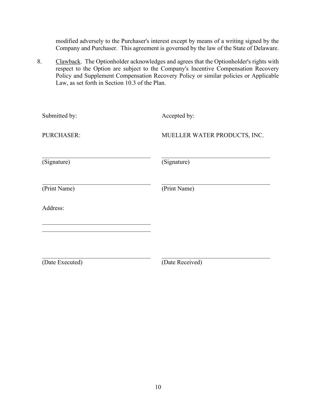 10 modified adversely to the Purchaser's interest except by means of a writing signed by the Company and Purchaser. This agreement is governed by the law of the State of Delaware. 8. Clawback. The Optionholder acknowledges and agrees that the Optionholder's rights with respect to the Option are subject to the Company's Incentive Compensation Recovery Policy and Supplement Compensation Recovery Policy or similar policies or Applicable Law, as set forth in Section 10.3 of the Plan. Submitted by: Accepted by: PURCHASER: MUELLER WATER PRODUCTS, INC. ___________________________________ (Signature) ___________________________________ (Signature) ___________________________________ (Print Name) ___________________________________ (Print Name) Address: ___________________________________ ___________________________________ ___________________________________ (Date Executed) ___________________________________ (Date Received)