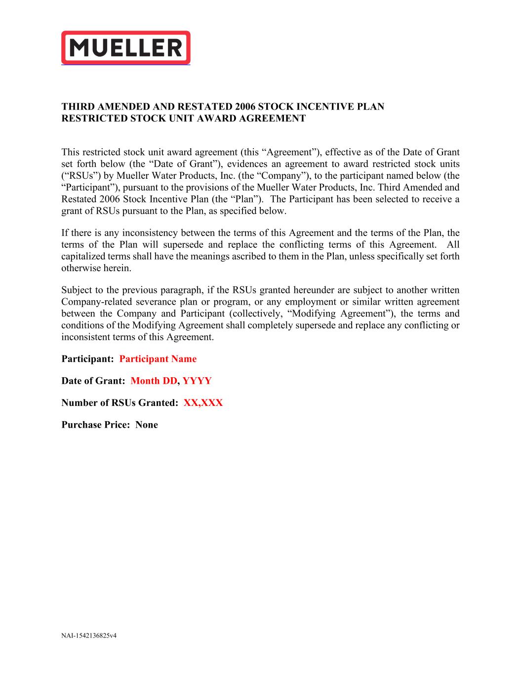 NAI-1542136825v4 THIRD AMENDED AND RESTATED 2006 STOCK INCENTIVE PLAN RESTRICTED STOCK UNIT AWARD AGREEMENT This restricted stock unit award agreement (this “Agreement”), effective as of the Date of Grant set forth below (the “Date of Grant”), evidences an agreement to award restricted stock units (“RSUs”) by Mueller Water Products, Inc. (the “Company”), to the participant named below (the “Participant”), pursuant to the provisions of the Mueller Water Products, Inc. Third Amended and Restated 2006 Stock Incentive Plan (the “Plan”). The Participant has been selected to receive a grant of RSUs pursuant to the Plan, as specified below. If there is any inconsistency between the terms of this Agreement and the terms of the Plan, the terms of the Plan will supersede and replace the conflicting terms of this Agreement. All capitalized terms shall have the meanings ascribed to them in the Plan, unless specifically set forth otherwise herein. Subject to the previous paragraph, if the RSUs granted hereunder are subject to another written Company-related severance plan or program, or any employment or similar written agreement between the Company and Participant (collectively, “Modifying Agreement”), the terms and conditions of the Modifying Agreement shall completely supersede and replace any conflicting or inconsistent terms of this Agreement. Participant: Participant Name Date of Grant: Month DD, YYYY Number of RSUs Granted: XX,XXX Purchase Price: None