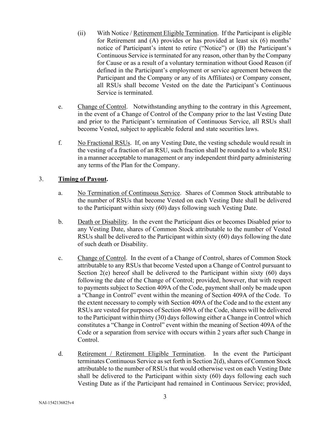 NAI-1542136825v4 3 (ii) With Notice / Retirement Eligible Termination. If the Participant is eligible for Retirement and (A) provides or has provided at least six (6) months’ notice of Participant’s intent to retire (“Notice”) or (B) the Participant’s Continuous Service is terminated for any reason, other than by the Company for Cause or as a result of a voluntary termination without Good Reason (if defined in the Participant’s employment or service agreement between the Participant and the Company or any of its Affiliates) or Company consent, all RSUs shall become Vested on the date the Participant’s Continuous Service is terminated. e. Change of Control. Notwithstanding anything to the contrary in this Agreement, in the event of a Change of Control of the Company prior to the last Vesting Date and prior to the Participant’s termination of Continuous Service, all RSUs shall become Vested, subject to applicable federal and state securities laws. f. No Fractional RSUs. If, on any Vesting Date, the vesting schedule would result in the vesting of a fraction of an RSU, such fraction shall be rounded to a whole RSU in a manner acceptable to management or any independent third party administering any terms of the Plan for the Company. 3. Timing of Payout. a. No Termination of Continuous Service. Shares of Common Stock attributable to the number of RSUs that become Vested on each Vesting Date shall be delivered to the Participant within sixty (60) days following such Vesting Date. b. Death or Disability. In the event the Participant dies or becomes Disabled prior to any Vesting Date, shares of Common Stock attributable to the number of Vested RSUs shall be delivered to the Participant within sixty (60) days following the date of such death or Disability. c. Change of Control. In the event of a Change of Control, shares of Common Stock attributable to any RSUs that become Vested upon a Change of Control pursuant to Section 2(e) hereof shall be delivered to the Participant within sixty (60) days following the date of the Change of Control; provided, however, that with respect to payments subject to Section 409A of the Code, payment shall only be made upon a “Change in Control” event within the meaning of Section 409A of the Code. To the extent necessary to comply with Section 409A of the Code and to the extent any RSUs are vested for purposes of Section 409A of the Code, shares will be delivered to the Participant within thirty (30) days following either a Change in Control which constitutes a “Change in Control” event within the meaning of Section 409A of the Code or a separation from service with occurs within 2 years after such Change in Control. d. Retirement / Retirement Eligible Termination. In the event the Participant terminates Continuous Service as set forth in Section 2(d), shares of Common Stock attributable to the number of RSUs that would otherwise vest on each Vesting Date shall be delivered to the Participant within sixty (60) days following each such Vesting Date as if the Participant had remained in Continuous Service; provided,