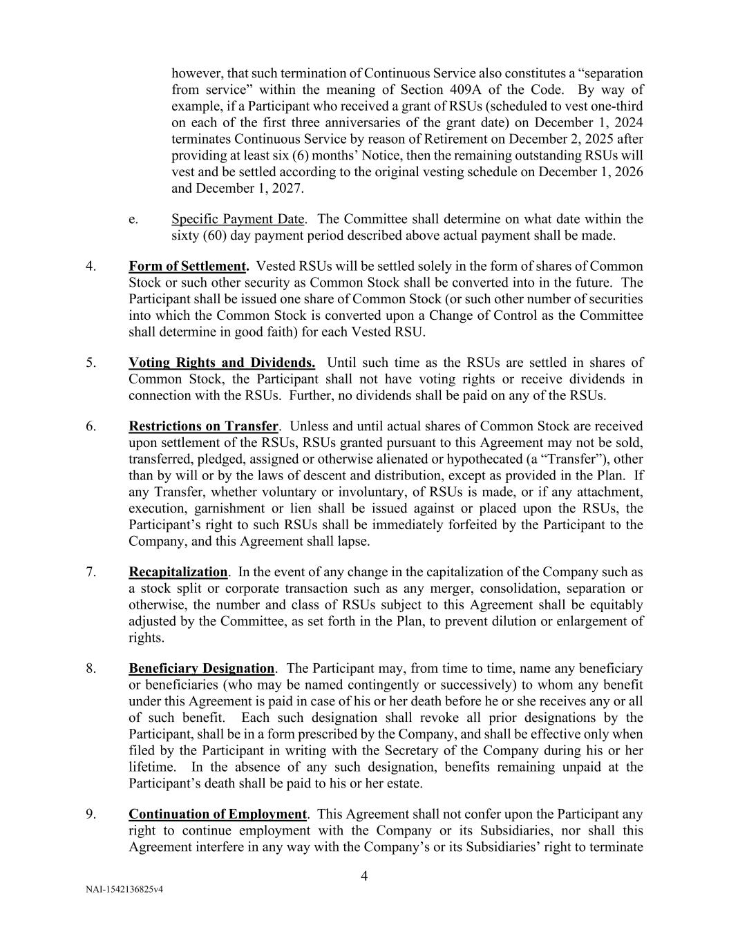 NAI-1542136825v4 4 however, that such termination of Continuous Service also constitutes a “separation from service” within the meaning of Section 409A of the Code. By way of example, if a Participant who received a grant of RSUs (scheduled to vest one-third on each of the first three anniversaries of the grant date) on December 1, 2024 terminates Continuous Service by reason of Retirement on December 2, 2025 after providing at least six (6) months’ Notice, then the remaining outstanding RSUs will vest and be settled according to the original vesting schedule on December 1, 2026 and December 1, 2027. e. Specific Payment Date. The Committee shall determine on what date within the sixty (60) day payment period described above actual payment shall be made. 4. Form of Settlement. Vested RSUs will be settled solely in the form of shares of Common Stock or such other security as Common Stock shall be converted into in the future. The Participant shall be issued one share of Common Stock (or such other number of securities into which the Common Stock is converted upon a Change of Control as the Committee shall determine in good faith) for each Vested RSU. 5. Voting Rights and Dividends. Until such time as the RSUs are settled in shares of Common Stock, the Participant shall not have voting rights or receive dividends in connection with the RSUs. Further, no dividends shall be paid on any of the RSUs. 6. Restrictions on Transfer. Unless and until actual shares of Common Stock are received upon settlement of the RSUs, RSUs granted pursuant to this Agreement may not be sold, transferred, pledged, assigned or otherwise alienated or hypothecated (a “Transfer”), other than by will or by the laws of descent and distribution, except as provided in the Plan. If any Transfer, whether voluntary or involuntary, of RSUs is made, or if any attachment, execution, garnishment or lien shall be issued against or placed upon the RSUs, the Participant’s right to such RSUs shall be immediately forfeited by the Participant to the Company, and this Agreement shall lapse. 7. Recapitalization. In the event of any change in the capitalization of the Company such as a stock split or corporate transaction such as any merger, consolidation, separation or otherwise, the number and class of RSUs subject to this Agreement shall be equitably adjusted by the Committee, as set forth in the Plan, to prevent dilution or enlargement of rights. 8. Beneficiary Designation. The Participant may, from time to time, name any beneficiary or beneficiaries (who may be named contingently or successively) to whom any benefit under this Agreement is paid in case of his or her death before he or she receives any or all of such benefit. Each such designation shall revoke all prior designations by the Participant, shall be in a form prescribed by the Company, and shall be effective only when filed by the Participant in writing with the Secretary of the Company during his or her lifetime. In the absence of any such designation, benefits remaining unpaid at the Participant’s death shall be paid to his or her estate. 9. Continuation of Employment. This Agreement shall not confer upon the Participant any right to continue employment with the Company or its Subsidiaries, nor shall this Agreement interfere in any way with the Company’s or its Subsidiaries’ right to terminate