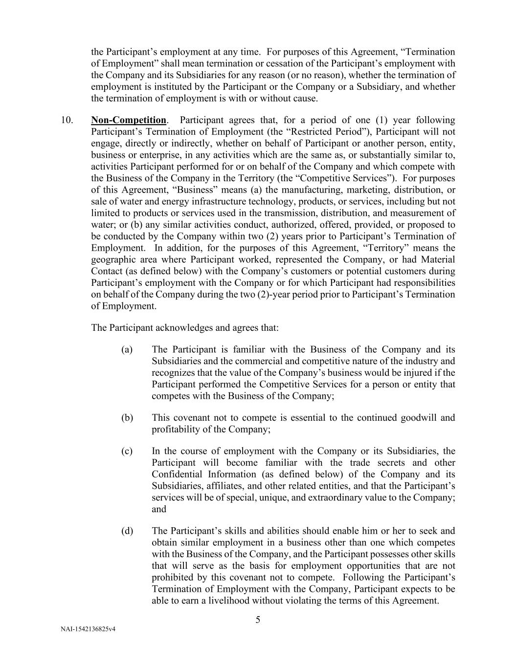 NAI-1542136825v4 5 the Participant’s employment at any time. For purposes of this Agreement, “Termination of Employment” shall mean termination or cessation of the Participant’s employment with the Company and its Subsidiaries for any reason (or no reason), whether the termination of employment is instituted by the Participant or the Company or a Subsidiary, and whether the termination of employment is with or without cause. 10. Non-Competition. Participant agrees that, for a period of one (1) year following Participant’s Termination of Employment (the “Restricted Period”), Participant will not engage, directly or indirectly, whether on behalf of Participant or another person, entity, business or enterprise, in any activities which are the same as, or substantially similar to, activities Participant performed for or on behalf of the Company and which compete with the Business of the Company in the Territory (the “Competitive Services”). For purposes of this Agreement, “Business” means (a) the manufacturing, marketing, distribution, or sale of water and energy infrastructure technology, products, or services, including but not limited to products or services used in the transmission, distribution, and measurement of water; or (b) any similar activities conduct, authorized, offered, provided, or proposed to be conducted by the Company within two (2) years prior to Participant’s Termination of Employment. In addition, for the purposes of this Agreement, “Territory” means the geographic area where Participant worked, represented the Company, or had Material Contact (as defined below) with the Company’s customers or potential customers during Participant’s employment with the Company or for which Participant had responsibilities on behalf of the Company during the two (2)-year period prior to Participant’s Termination of Employment. The Participant acknowledges and agrees that: (a) The Participant is familiar with the Business of the Company and its Subsidiaries and the commercial and competitive nature of the industry and recognizes that the value of the Company’s business would be injured if the Participant performed the Competitive Services for a person or entity that competes with the Business of the Company; (b) This covenant not to compete is essential to the continued goodwill and profitability of the Company; (c) In the course of employment with the Company or its Subsidiaries, the Participant will become familiar with the trade secrets and other Confidential Information (as defined below) of the Company and its Subsidiaries, affiliates, and other related entities, and that the Participant’s services will be of special, unique, and extraordinary value to the Company; and (d) The Participant’s skills and abilities should enable him or her to seek and obtain similar employment in a business other than one which competes with the Business of the Company, and the Participant possesses other skills that will serve as the basis for employment opportunities that are not prohibited by this covenant not to compete. Following the Participant’s Termination of Employment with the Company, Participant expects to be able to earn a livelihood without violating the terms of this Agreement.