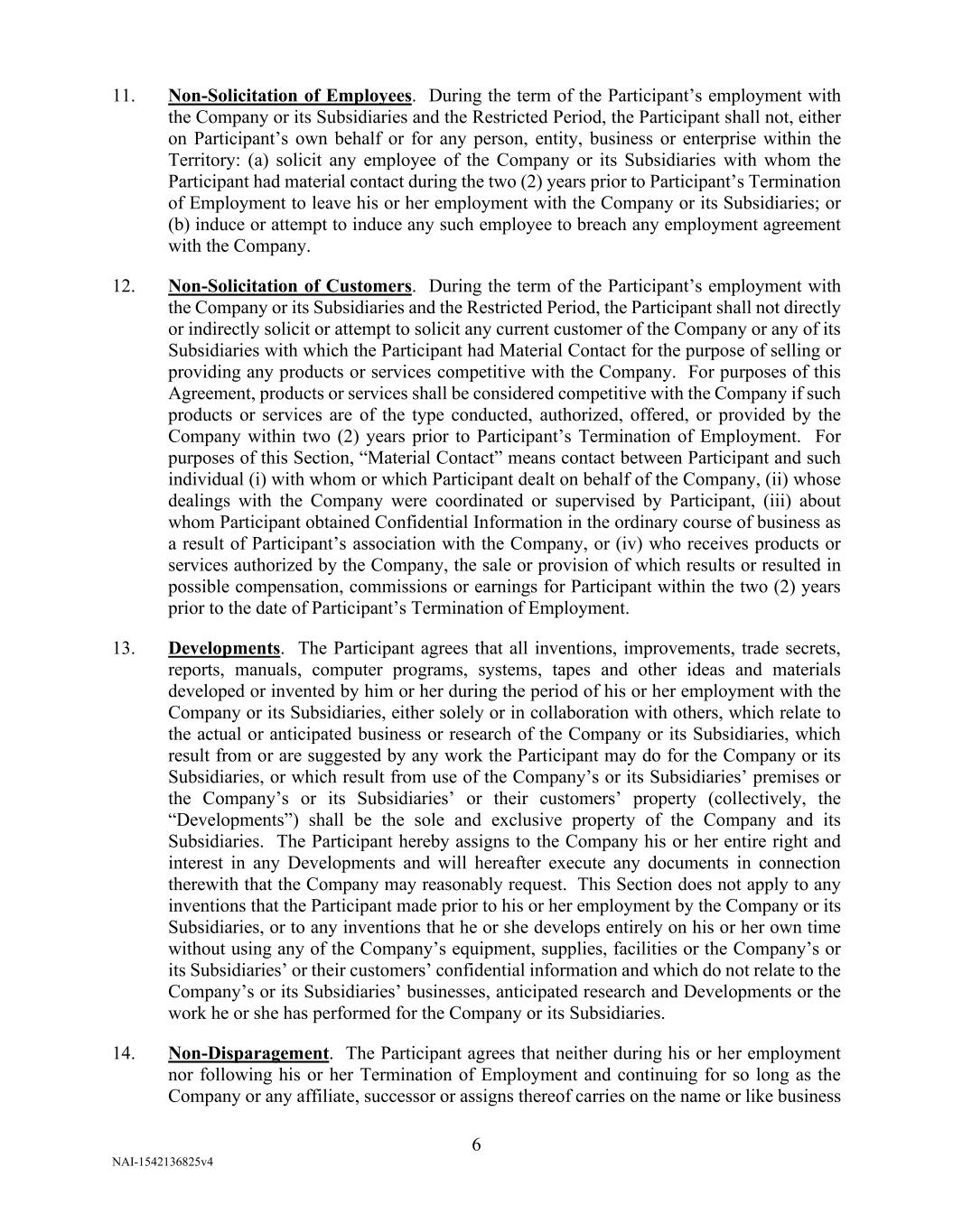 NAI-1542136825v4 6 11. Non-Solicitation of Employees. During the term of the Participant’s employment with the Company or its Subsidiaries and the Restricted Period, the Participant shall not, either on Participant’s own behalf or for any person, entity, business or enterprise within the Territory: (a) solicit any employee of the Company or its Subsidiaries with whom the Participant had material contact during the two (2) years prior to Participant’s Termination of Employment to leave his or her employment with the Company or its Subsidiaries; or (b) induce or attempt to induce any such employee to breach any employment agreement with the Company. 12. Non-Solicitation of Customers. During the term of the Participant’s employment with the Company or its Subsidiaries and the Restricted Period, the Participant shall not directly or indirectly solicit or attempt to solicit any current customer of the Company or any of its Subsidiaries with which the Participant had Material Contact for the purpose of selling or providing any products or services competitive with the Company. For purposes of this Agreement, products or services shall be considered competitive with the Company if such products or services are of the type conducted, authorized, offered, or provided by the Company within two (2) years prior to Participant’s Termination of Employment. For purposes of this Section, “Material Contact” means contact between Participant and such individual (i) with whom or which Participant dealt on behalf of the Company, (ii) whose dealings with the Company were coordinated or supervised by Participant, (iii) about whom Participant obtained Confidential Information in the ordinary course of business as a result of Participant’s association with the Company, or (iv) who receives products or services authorized by the Company, the sale or provision of which results or resulted in possible compensation, commissions or earnings for Participant within the two (2) years prior to the date of Participant’s Termination of Employment. 13. Developments. The Participant agrees that all inventions, improvements, trade secrets, reports, manuals, computer programs, systems, tapes and other ideas and materials developed or invented by him or her during the period of his or her employment with the Company or its Subsidiaries, either solely or in collaboration with others, which relate to the actual or anticipated business or research of the Company or its Subsidiaries, which result from or are suggested by any work the Participant may do for the Company or its Subsidiaries, or which result from use of the Company’s or its Subsidiaries’ premises or the Company’s or its Subsidiaries’ or their customers’ property (collectively, the “Developments”) shall be the sole and exclusive property of the Company and its Subsidiaries. The Participant hereby assigns to the Company his or her entire right and interest in any Developments and will hereafter execute any documents in connection therewith that the Company may reasonably request. This Section does not apply to any inventions that the Participant made prior to his or her employment by the Company or its Subsidiaries, or to any inventions that he or she develops entirely on his or her own time without using any of the Company’s equipment, supplies, facilities or the Company’s or its Subsidiaries’ or their customers’ confidential information and which do not relate to the Company’s or its Subsidiaries’ businesses, anticipated research and Developments or the work he or she has performed for the Company or its Subsidiaries. 14. Non-Disparagement. The Participant agrees that neither during his or her employment nor following his or her Termination of Employment and continuing for so long as the Company or any affiliate, successor or assigns thereof carries on the name or like business
