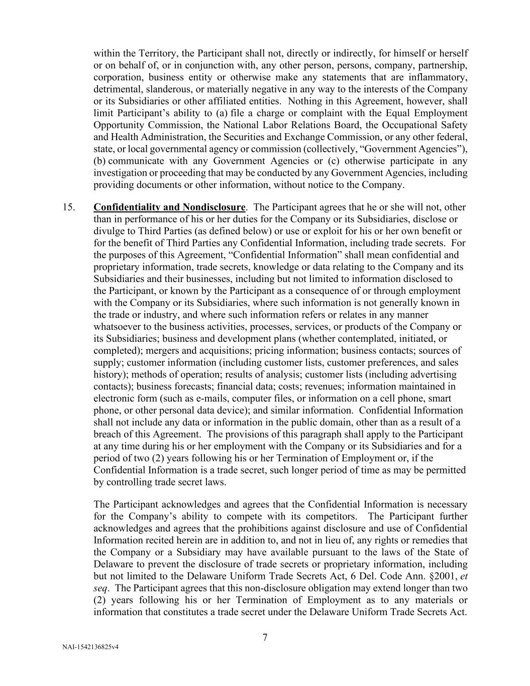 NAI-1542136825v4 7 within the Territory, the Participant shall not, directly or indirectly, for himself or herself or on behalf of, or in conjunction with, any other person, persons, company, partnership, corporation, business entity or otherwise make any statements that are inflammatory, detrimental, slanderous, or materially negative in any way to the interests of the Company or its Subsidiaries or other affiliated entities. Nothing in this Agreement, however, shall limit Participant’s ability to (a) file a charge or complaint with the Equal Employment Opportunity Commission, the National Labor Relations Board, the Occupational Safety and Health Administration, the Securities and Exchange Commission, or any other federal, state, or local governmental agency or commission (collectively, “Government Agencies”), (b) communicate with any Government Agencies or (c) otherwise participate in any investigation or proceeding that may be conducted by any Government Agencies, including providing documents or other information, without notice to the Company. 15. Confidentiality and Nondisclosure. The Participant agrees that he or she will not, other than in performance of his or her duties for the Company or its Subsidiaries, disclose or divulge to Third Parties (as defined below) or use or exploit for his or her own benefit or for the benefit of Third Parties any Confidential Information, including trade secrets. For the purposes of this Agreement, “Confidential Information” shall mean confidential and proprietary information, trade secrets, knowledge or data relating to the Company and its Subsidiaries and their businesses, including but not limited to information disclosed to the Participant, or known by the Participant as a consequence of or through employment with the Company or its Subsidiaries, where such information is not generally known in the trade or industry, and where such information refers or relates in any manner whatsoever to the business activities, processes, services, or products of the Company or its Subsidiaries; business and development plans (whether contemplated, initiated, or completed); mergers and acquisitions; pricing information; business contacts; sources of supply; customer information (including customer lists, customer preferences, and sales history); methods of operation; results of analysis; customer lists (including advertising contacts); business forecasts; financial data; costs; revenues; information maintained in electronic form (such as e-mails, computer files, or information on a cell phone, smart phone, or other personal data device); and similar information. Confidential Information shall not include any data or information in the public domain, other than as a result of a breach of this Agreement. The provisions of this paragraph shall apply to the Participant at any time during his or her employment with the Company or its Subsidiaries and for a period of two (2) years following his or her Termination of Employment or, if the Confidential Information is a trade secret, such longer period of time as may be permitted by controlling trade secret laws. The Participant acknowledges and agrees that the Confidential Information is necessary for the Company’s ability to compete with its competitors. The Participant further acknowledges and agrees that the prohibitions against disclosure and use of Confidential Information recited herein are in addition to, and not in lieu of, any rights or remedies that the Company or a Subsidiary may have available pursuant to the laws of the State of Delaware to prevent the disclosure of trade secrets or proprietary information, including but not limited to the Delaware Uniform Trade Secrets Act, 6 Del. Code Ann. §2001, et seq. The Participant agrees that this non-disclosure obligation may extend longer than two (2) years following his or her Termination of Employment as to any materials or information that constitutes a trade secret under the Delaware Uniform Trade Secrets Act.