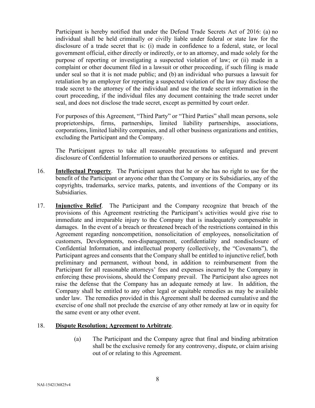 NAI-1542136825v4 8 Participant is hereby notified that under the Defend Trade Secrets Act of 2016: (a) no individual shall be held criminally or civilly liable under federal or state law for the disclosure of a trade secret that is: (i) made in confidence to a federal, state, or local government official, either directly or indirectly, or to an attorney, and made solely for the purpose of reporting or investigating a suspected violation of law; or (ii) made in a complaint or other document filed in a lawsuit or other proceeding, if such filing is made under seal so that it is not made public; and (b) an individual who pursues a lawsuit for retaliation by an employer for reporting a suspected violation of the law may disclose the trade secret to the attorney of the individual and use the trade secret information in the court proceeding, if the individual files any document containing the trade secret under seal, and does not disclose the trade secret, except as permitted by court order. For purposes of this Agreement, “Third Party” or “Third Parties” shall mean persons, sole proprietorships, firms, partnerships, limited liability partnerships, associations, corporations, limited liability companies, and all other business organizations and entities, excluding the Participant and the Company. The Participant agrees to take all reasonable precautions to safeguard and prevent disclosure of Confidential Information to unauthorized persons or entities. 16. Intellectual Property. The Participant agrees that he or she has no right to use for the benefit of the Participant or anyone other than the Company or its Subsidiaries, any of the copyrights, trademarks, service marks, patents, and inventions of the Company or its Subsidiaries. 17. Injunctive Relief. The Participant and the Company recognize that breach of the provisions of this Agreement restricting the Participant’s activities would give rise to immediate and irreparable injury to the Company that is inadequately compensable in damages. In the event of a breach or threatened breach of the restrictions contained in this Agreement regarding noncompetition, nonsolicitation of employees, nonsolicitation of customers, Developments, non-disparagement, confidentiality and nondisclosure of Confidential Information, and intellectual property (collectively, the “Covenants”), the Participant agrees and consents that the Company shall be entitled to injunctive relief, both preliminary and permanent, without bond, in addition to reimbursement from the Participant for all reasonable attorneys’ fees and expenses incurred by the Company in enforcing these provisions, should the Company prevail. The Participant also agrees not raise the defense that the Company has an adequate remedy at law. In addition, the Company shall be entitled to any other legal or equitable remedies as may be available under law. The remedies provided in this Agreement shall be deemed cumulative and the exercise of one shall not preclude the exercise of any other remedy at law or in equity for the same event or any other event. 18. Dispute Resolution; Agreement to Arbitrate. (a) The Participant and the Company agree that final and binding arbitration shall be the exclusive remedy for any controversy, dispute, or claim arising out of or relating to this Agreement.