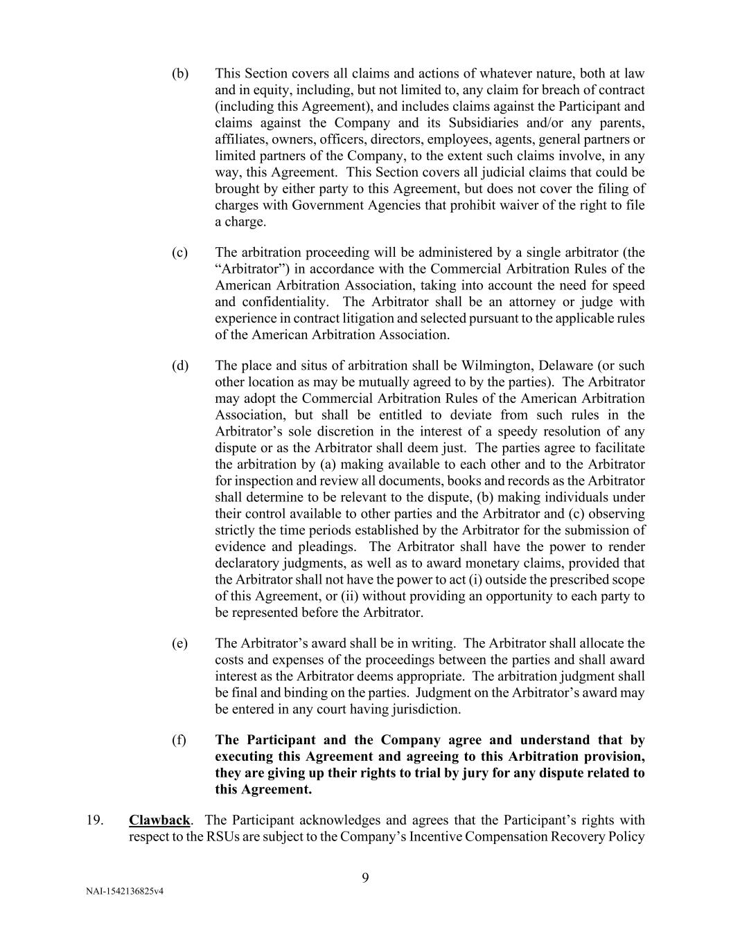 NAI-1542136825v4 9 (b) This Section covers all claims and actions of whatever nature, both at law and in equity, including, but not limited to, any claim for breach of contract (including this Agreement), and includes claims against the Participant and claims against the Company and its Subsidiaries and/or any parents, affiliates, owners, officers, directors, employees, agents, general partners or limited partners of the Company, to the extent such claims involve, in any way, this Agreement. This Section covers all judicial claims that could be brought by either party to this Agreement, but does not cover the filing of charges with Government Agencies that prohibit waiver of the right to file a charge. (c) The arbitration proceeding will be administered by a single arbitrator (the “Arbitrator”) in accordance with the Commercial Arbitration Rules of the American Arbitration Association, taking into account the need for speed and confidentiality. The Arbitrator shall be an attorney or judge with experience in contract litigation and selected pursuant to the applicable rules of the American Arbitration Association. (d) The place and situs of arbitration shall be Wilmington, Delaware (or such other location as may be mutually agreed to by the parties). The Arbitrator may adopt the Commercial Arbitration Rules of the American Arbitration Association, but shall be entitled to deviate from such rules in the Arbitrator’s sole discretion in the interest of a speedy resolution of any dispute or as the Arbitrator shall deem just. The parties agree to facilitate the arbitration by (a) making available to each other and to the Arbitrator for inspection and review all documents, books and records as the Arbitrator shall determine to be relevant to the dispute, (b) making individuals under their control available to other parties and the Arbitrator and (c) observing strictly the time periods established by the Arbitrator for the submission of evidence and pleadings. The Arbitrator shall have the power to render declaratory judgments, as well as to award monetary claims, provided that the Arbitrator shall not have the power to act (i) outside the prescribed scope of this Agreement, or (ii) without providing an opportunity to each party to be represented before the Arbitrator. (e) The Arbitrator’s award shall be in writing. The Arbitrator shall allocate the costs and expenses of the proceedings between the parties and shall award interest as the Arbitrator deems appropriate. The arbitration judgment shall be final and binding on the parties. Judgment on the Arbitrator’s award may be entered in any court having jurisdiction. (f) The Participant and the Company agree and understand that by executing this Agreement and agreeing to this Arbitration provision, they are giving up their rights to trial by jury for any dispute related to this Agreement. 19. Clawback. The Participant acknowledges and agrees that the Participant’s rights with respect to the RSUs are subject to the Company’s Incentive Compensation Recovery Policy