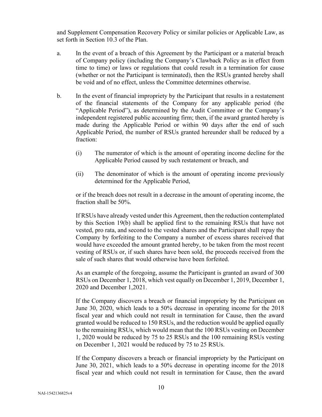 NAI-1542136825v4 10 and Supplement Compensation Recovery Policy or similar policies or Applicable Law, as set forth in Section 10.3 of the Plan. a. In the event of a breach of this Agreement by the Participant or a material breach of Company policy (including the Company’s Clawback Policy as in effect from time to time) or laws or regulations that could result in a termination for cause (whether or not the Participant is terminated), then the RSUs granted hereby shall be void and of no effect, unless the Committee determines otherwise. b. In the event of financial impropriety by the Participant that results in a restatement of the financial statements of the Company for any applicable period (the “Applicable Period”), as determined by the Audit Committee or the Company’s independent registered public accounting firm; then, if the award granted hereby is made during the Applicable Period or within 90 days after the end of such Applicable Period, the number of RSUs granted hereunder shall be reduced by a fraction: (i) The numerator of which is the amount of operating income decline for the Applicable Period caused by such restatement or breach, and (ii) The denominator of which is the amount of operating income previously determined for the Applicable Period, or if the breach does not result in a decrease in the amount of operating income, the fraction shall be 50%. If RSUs have already vested under this Agreement, then the reduction contemplated by this Section 19(b) shall be applied first to the remaining RSUs that have not vested, pro rata, and second to the vested shares and the Participant shall repay the Company by forfeiting to the Company a number of excess shares received that would have exceeded the amount granted hereby, to be taken from the most recent vesting of RSUs or, if such shares have been sold, the proceeds received from the sale of such shares that would otherwise have been forfeited. As an example of the foregoing, assume the Participant is granted an award of 300 RSUs on December 1, 2018, which vest equally on December 1, 2019, December 1, 2020 and December 1,2021. If the Company discovers a breach or financial impropriety by the Participant on June 30, 2020, which leads to a 50% decrease in operating income for the 2018 fiscal year and which could not result in termination for Cause, then the award granted would be reduced to 150 RSUs, and the reduction would be applied equally to the remaining RSUs, which would mean that the 100 RSUs vesting on December 1, 2020 would be reduced by 75 to 25 RSUs and the 100 remaining RSUs vesting on December 1, 2021 would be reduced by 75 to 25 RSUs. If the Company discovers a breach or financial impropriety by the Participant on June 30, 2021, which leads to a 50% decrease in operating income for the 2018 fiscal year and which could not result in termination for Cause, then the award