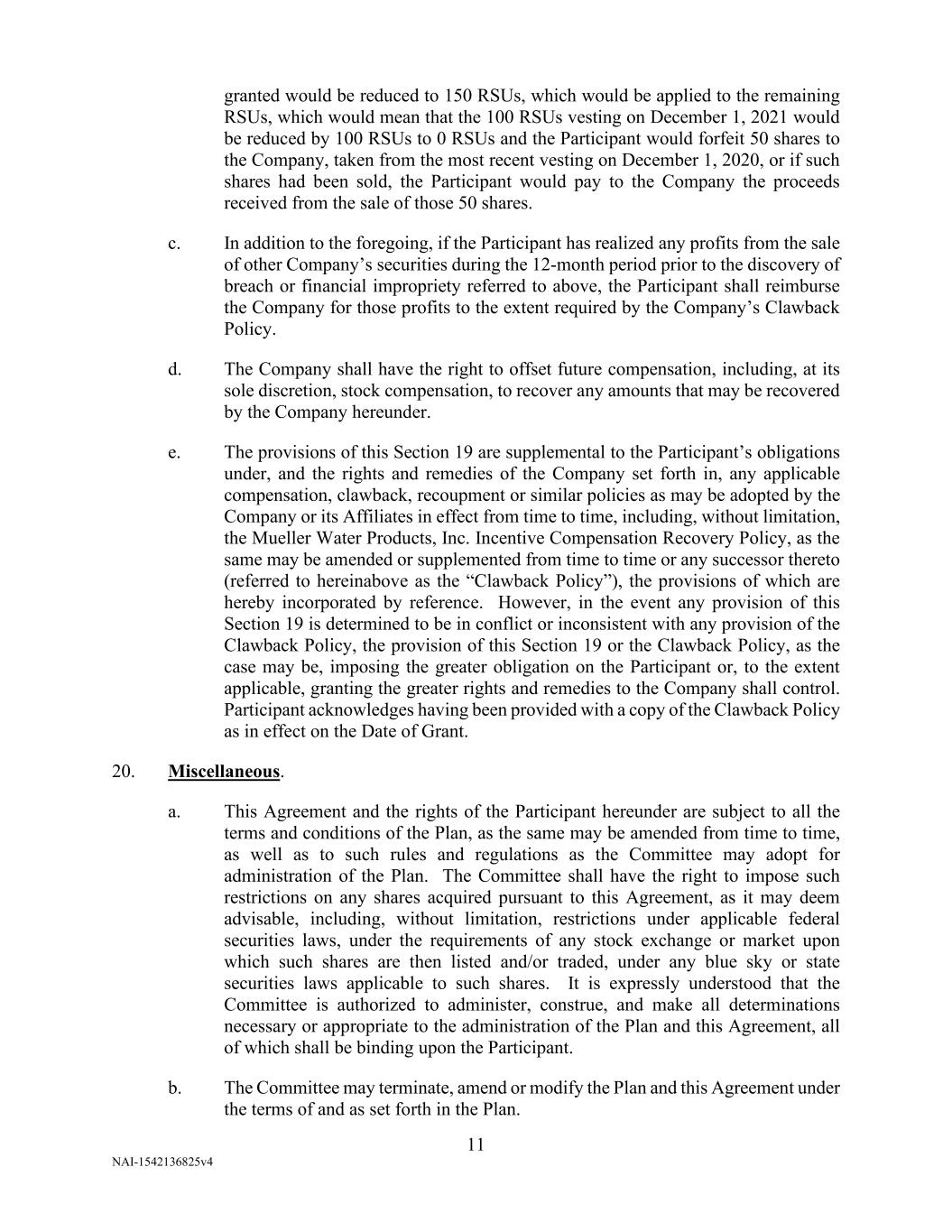 NAI-1542136825v4 11 granted would be reduced to 150 RSUs, which would be applied to the remaining RSUs, which would mean that the 100 RSUs vesting on December 1, 2021 would be reduced by 100 RSUs to 0 RSUs and the Participant would forfeit 50 shares to the Company, taken from the most recent vesting on December 1, 2020, or if such shares had been sold, the Participant would pay to the Company the proceeds received from the sale of those 50 shares. c. In addition to the foregoing, if the Participant has realized any profits from the sale of other Company’s securities during the 12-month period prior to the discovery of breach or financial impropriety referred to above, the Participant shall reimburse the Company for those profits to the extent required by the Company’s Clawback Policy. d. The Company shall have the right to offset future compensation, including, at its sole discretion, stock compensation, to recover any amounts that may be recovered by the Company hereunder. e. The provisions of this Section 19 are supplemental to the Participant’s obligations under, and the rights and remedies of the Company set forth in, any applicable compensation, clawback, recoupment or similar policies as may be adopted by the Company or its Affiliates in effect from time to time, including, without limitation, the Mueller Water Products, Inc. Incentive Compensation Recovery Policy, as the same may be amended or supplemented from time to time or any successor thereto (referred to hereinabove as the “Clawback Policy”), the provisions of which are hereby incorporated by reference. However, in the event any provision of this Section 19 is determined to be in conflict or inconsistent with any provision of the Clawback Policy, the provision of this Section 19 or the Clawback Policy, as the case may be, imposing the greater obligation on the Participant or, to the extent applicable, granting the greater rights and remedies to the Company shall control. Participant acknowledges having been provided with a copy of the Clawback Policy as in effect on the Date of Grant. 20. Miscellaneous. a. This Agreement and the rights of the Participant hereunder are subject to all the terms and conditions of the Plan, as the same may be amended from time to time, as well as to such rules and regulations as the Committee may adopt for administration of the Plan. The Committee shall have the right to impose such restrictions on any shares acquired pursuant to this Agreement, as it may deem advisable, including, without limitation, restrictions under applicable federal securities laws, under the requirements of any stock exchange or market upon which such shares are then listed and/or traded, under any blue sky or state securities laws applicable to such shares. It is expressly understood that the Committee is authorized to administer, construe, and make all determinations necessary or appropriate to the administration of the Plan and this Agreement, all of which shall be binding upon the Participant. b. The Committee may terminate, amend or modify the Plan and this Agreement under the terms of and as set forth in the Plan.