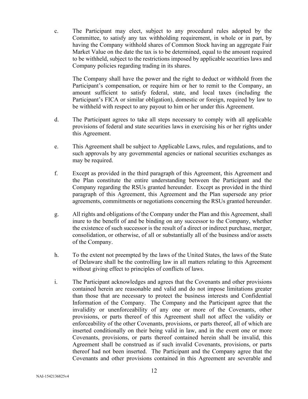 NAI-1542136825v4 12 c. The Participant may elect, subject to any procedural rules adopted by the Committee, to satisfy any tax withholding requirement, in whole or in part, by having the Company withhold shares of Common Stock having an aggregate Fair Market Value on the date the tax is to be determined, equal to the amount required to be withheld, subject to the restrictions imposed by applicable securities laws and Company policies regarding trading in its shares. The Company shall have the power and the right to deduct or withhold from the Participant’s compensation, or require him or her to remit to the Company, an amount sufficient to satisfy federal, state, and local taxes (including the Participant’s FICA or similar obligation), domestic or foreign, required by law to be withheld with respect to any payout to him or her under this Agreement. d. The Participant agrees to take all steps necessary to comply with all applicable provisions of federal and state securities laws in exercising his or her rights under this Agreement. e. This Agreement shall be subject to Applicable Laws, rules, and regulations, and to such approvals by any governmental agencies or national securities exchanges as may be required. f. Except as provided in the third paragraph of this Agreement, this Agreement and the Plan constitute the entire understanding between the Participant and the Company regarding the RSUs granted hereunder. Except as provided in the third paragraph of this Agreement, this Agreement and the Plan supersede any prior agreements, commitments or negotiations concerning the RSUs granted hereunder. g. All rights and obligations of the Company under the Plan and this Agreement, shall inure to the benefit of and be binding on any successor to the Company, whether the existence of such successor is the result of a direct or indirect purchase, merger, consolidation, or otherwise, of all or substantially all of the business and/or assets of the Company. h. To the extent not preempted by the laws of the United States, the laws of the State of Delaware shall be the controlling law in all matters relating to this Agreement without giving effect to principles of conflicts of laws. i. The Participant acknowledges and agrees that the Covenants and other provisions contained herein are reasonable and valid and do not impose limitations greater than those that are necessary to protect the business interests and Confidential Information of the Company. The Company and the Participant agree that the invalidity or unenforceability of any one or more of the Covenants, other provisions, or parts thereof of this Agreement shall not affect the validity or enforceability of the other Covenants, provisions, or parts thereof, all of which are inserted conditionally on their being valid in law, and in the event one or more Covenants, provisions, or parts thereof contained herein shall be invalid, this Agreement shall be construed as if such invalid Covenants, provisions, or parts thereof had not been inserted. The Participant and the Company agree that the Covenants and other provisions contained in this Agreement are severable and