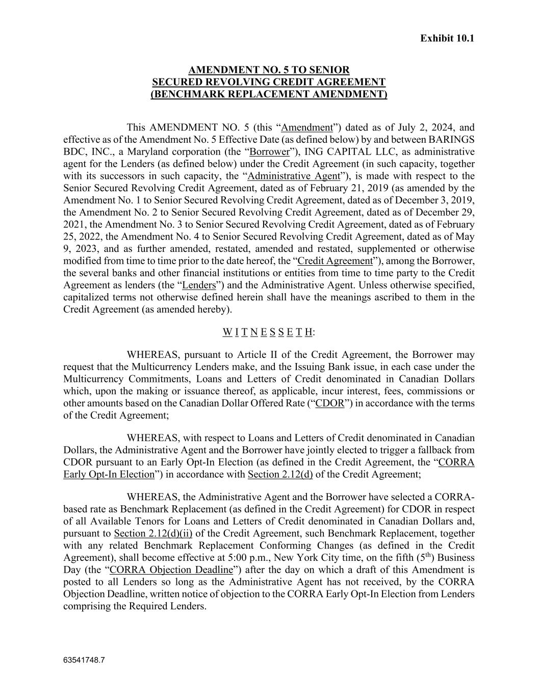 Exhibit 10.1 63541748.7 AMENDMENT NO. 5 TO SENIOR SECURED REVOLVING CREDIT AGREEMENT (BENCHMARK REPLACEMENT AMENDMENT) This AMENDMENT NO. 5 (this “Amendment”) dated as of July 2, 2024, and effective as of the Amendment No. 5 Effective Date (as defined below) by and between BARINGS BDC, INC., a Maryland corporation (the “Borrower”), ING CAPITAL LLC, as administrative agent for the Lenders (as defined below) under the Credit Agreement (in such capacity, together with its successors in such capacity, the “Administrative Agent”), is made with respect to the Senior Secured Revolving Credit Agreement, dated as of February 21, 2019 (as amended by the Amendment No. 1 to Senior Secured Revolving Credit Agreement, dated as of December 3, 2019, the Amendment No. 2 to Senior Secured Revolving Credit Agreement, dated as of December 29, 2021, the Amendment No. 3 to Senior Secured Revolving Credit Agreement, dated as of February 25, 2022, the Amendment No. 4 to Senior Secured Revolving Credit Agreement, dated as of May 9, 2023, and as further amended, restated, amended and restated, supplemented or otherwise modified from time to time prior to the date hereof, the “Credit Agreement”), among the Borrower, the several banks and other financial institutions or entities from time to time party to the Credit Agreement as lenders (the “Lenders”) and the Administrative Agent. Unless otherwise specified, capitalized terms not otherwise defined herein shall have the meanings ascribed to them in the Credit Agreement (as amended hereby). W I T N E S S E T H: WHEREAS, pursuant to Article II of the Credit Agreement, the Borrower may request that the Multicurrency Lenders make, and the Issuing Bank issue, in each case under the Multicurrency Commitments, Loans and Letters of Credit denominated in Canadian Dollars which, upon the making or issuance thereof, as applicable, incur interest, fees, commissions or other amounts based on the Canadian Dollar Offered Rate (“CDOR”) in accordance with the terms of the Credit Agreement; WHEREAS, with respect to Loans and Letters of Credit denominated in Canadian Dollars, the Administrative Agent and the Borrower have jointly elected to trigger a fallback from CDOR pursuant to an Early Opt-In Election (as defined in the Credit Agreement, the “CORRA Early Opt-In Election”) in accordance with Section 2.12(d) of the Credit Agreement; WHEREAS, the Administrative Agent and the Borrower have selected a CORRA- based rate as Benchmark Replacement (as defined in the Credit Agreement) for CDOR in respect of all Available Tenors for Loans and Letters of Credit denominated in Canadian Dollars and, pursuant to Section 2.12(d)(ii) of the Credit Agreement, such Benchmark Replacement, together with any related Benchmark Replacement Conforming Changes (as defined in the Credit Agreement), shall become effective at 5:00 p.m., New York City time, on the fifth (5th) Business Day (the “CORRA Objection Deadline”) after the day on which a draft of this Amendment is posted to all Lenders so long as the Administrative Agent has not received, by the CORRA Objection Deadline, written notice of objection to the CORRA Early Opt-In Election from Lenders comprising the Required Lenders.