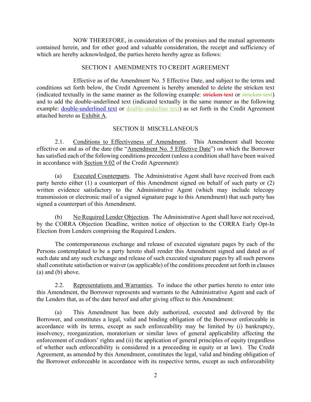 2 NOW THEREFORE, in consideration of the promises and the mutual agreements contained herein, and for other good and valuable consideration, the receipt and sufficiency of which are hereby acknowledged, the parties hereto hereby agree as follows: SECTION I AMENDMENTS TO CREDIT AGREEMENT Effective as of the Amendment No. 5 Effective Date, and subject to the terms and conditions set forth below, the Credit Agreement is hereby amended to delete the stricken text (indicated textually in the same manner as the following example: stricken text or stricken text) and to add the double-underlined text (indicated textually in the same manner as the following example: double-underlined text or double-underline text) as set forth in the Credit Agreement attached hereto as Exhibit A. SECTION II MISCELLANEOUS 2.1. Conditions to Effectiveness of Amendment. This Amendment shall become effective on and as of the date (the “Amendment No. 5 Effective Date”) on which the Borrower has satisfied each of the following conditions precedent (unless a condition shall have been waived in accordance with Section 9.02 of the Credit Agreement): (a) Executed Counterparts. The Administrative Agent shall have received from each party hereto either (1) a counterpart of this Amendment signed on behalf of such party or (2) written evidence satisfactory to the Administrative Agent (which may include telecopy transmission or electronic mail of a signed signature page to this Amendment) that such party has signed a counterpart of this Amendment. (b) No Required Lender Objection. The Administrative Agent shall have not received, by the CORRA Objection Deadline, written notice of objection to the CORRA Early Opt-In Election from Lenders comprising the Required Lenders. The contemporaneous exchange and release of executed signature pages by each of the Persons contemplated to be a party hereto shall render this Amendment signed and dated as of such date and any such exchange and release of such executed signature pages by all such persons shall constitute satisfaction or waiver (as applicable) of the conditions precedent set forth in clauses (a) and (b) above. 2.2. Representations and Warranties. To induce the other parties hereto to enter into this Amendment, the Borrower represents and warrants to the Administrative Agent and each of the Lenders that, as of the date hereof and after giving effect to this Amendment: (a) This Amendment has been duly authorized, executed and delivered by the Borrower, and constitutes a legal, valid and binding obligation of the Borrower enforceable in accordance with its terms, except as such enforceability may be limited by (i) bankruptcy, insolvency, reorganization, moratorium or similar laws of general applicability affecting the enforcement of creditors’ rights and (ii) the application of general principles of equity (regardless of whether such enforceability is considered in a proceeding in equity or at law). The Credit Agreement, as amended by this Amendment, constitutes the legal, valid and binding obligation of the Borrower enforceable in accordance with its respective terms, except as such enforceability