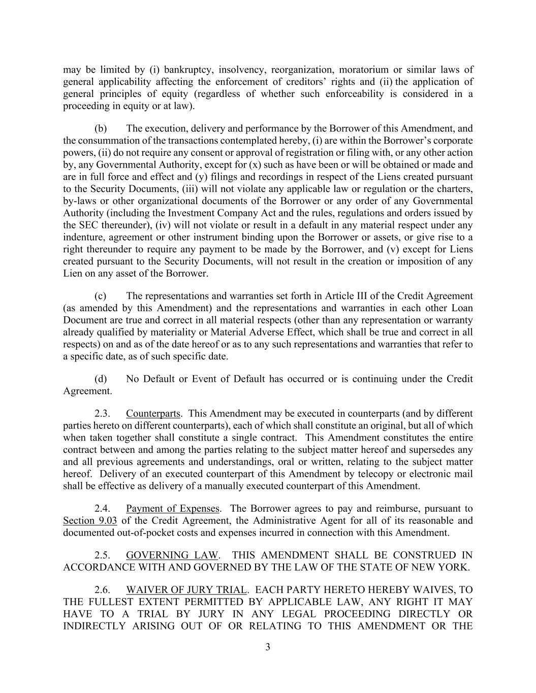 3 may be limited by (i) bankruptcy, insolvency, reorganization, moratorium or similar laws of general applicability affecting the enforcement of creditors’ rights and (ii) the application of general principles of equity (regardless of whether such enforceability is considered in a proceeding in equity or at law). (b) The execution, delivery and performance by the Borrower of this Amendment, and the consummation of the transactions contemplated hereby, (i) are within the Borrower’s corporate powers, (ii) do not require any consent or approval of registration or filing with, or any other action by, any Governmental Authority, except for (x) such as have been or will be obtained or made and are in full force and effect and (y) filings and recordings in respect of the Liens created pursuant to the Security Documents, (iii) will not violate any applicable law or regulation or the charters, by-laws or other organizational documents of the Borrower or any order of any Governmental Authority (including the Investment Company Act and the rules, regulations and orders issued by the SEC thereunder), (iv) will not violate or result in a default in any material respect under any indenture, agreement or other instrument binding upon the Borrower or assets, or give rise to a right thereunder to require any payment to be made by the Borrower, and (v) except for Liens created pursuant to the Security Documents, will not result in the creation or imposition of any Lien on any asset of the Borrower. (c) The representations and warranties set forth in Article III of the Credit Agreement (as amended by this Amendment) and the representations and warranties in each other Loan Document are true and correct in all material respects (other than any representation or warranty already qualified by materiality or Material Adverse Effect, which shall be true and correct in all respects) on and as of the date hereof or as to any such representations and warranties that refer to a specific date, as of such specific date. (d) No Default or Event of Default has occurred or is continuing under the Credit Agreement. 2.3. Counterparts. This Amendment may be executed in counterparts (and by different parties hereto on different counterparts), each of which shall constitute an original, but all of which when taken together shall constitute a single contract. This Amendment constitutes the entire contract between and among the parties relating to the subject matter hereof and supersedes any and all previous agreements and understandings, oral or written, relating to the subject matter hereof. Delivery of an executed counterpart of this Amendment by telecopy or electronic mail shall be effective as delivery of a manually executed counterpart of this Amendment. 2.4. Payment of Expenses. The Borrower agrees to pay and reimburse, pursuant to Section 9.03 of the Credit Agreement, the Administrative Agent for all of its reasonable and documented out-of-pocket costs and expenses incurred in connection with this Amendment. 2.5. GOVERNING LAW. THIS AMENDMENT SHALL BE CONSTRUED IN ACCORDANCE WITH AND GOVERNED BY THE LAW OF THE STATE OF NEW YORK. 2.6. WAIVER OF JURY TRIAL. EACH PARTY HERETO HEREBY WAIVES, TO THE FULLEST EXTENT PERMITTED BY APPLICABLE LAW, ANY RIGHT IT MAY HAVE TO A TRIAL BY JURY IN ANY LEGAL PROCEEDING DIRECTLY OR INDIRECTLY ARISING OUT OF OR RELATING TO THIS AMENDMENT OR THE