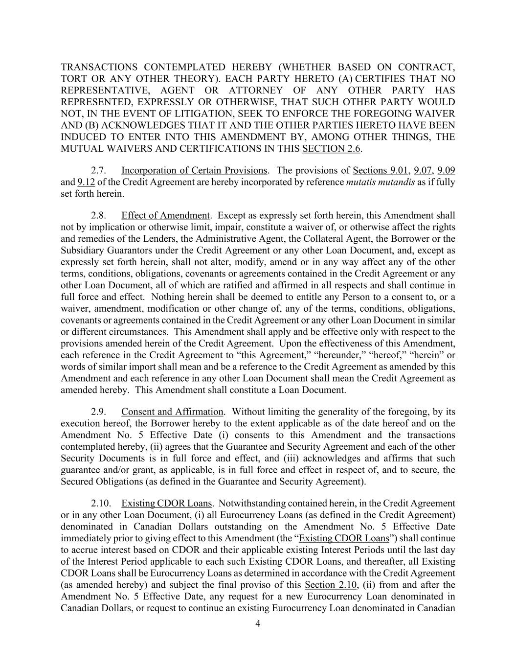 4 TRANSACTIONS CONTEMPLATED HEREBY (WHETHER BASED ON CONTRACT, TORT OR ANY OTHER THEORY). EACH PARTY HERETO (A) CERTIFIES THAT NO REPRESENTATIVE, AGENT OR ATTORNEY OF ANY OTHER PARTY HAS REPRESENTED, EXPRESSLY OR OTHERWISE, THAT SUCH OTHER PARTY WOULD NOT, IN THE EVENT OF LITIGATION, SEEK TO ENFORCE THE FOREGOING WAIVER AND (B) ACKNOWLEDGES THAT IT AND THE OTHER PARTIES HERETO HAVE BEEN INDUCED TO ENTER INTO THIS AMENDMENT BY, AMONG OTHER THINGS, THE MUTUAL WAIVERS AND CERTIFICATIONS IN THIS SECTION 2.6. 2.7. Incorporation of Certain Provisions. The provisions of Sections 9.01, 9.07, 9.09 and 9.12 of the Credit Agreement are hereby incorporated by reference mutatis mutandis as if fully set forth herein. 2.8. Effect of Amendment. Except as expressly set forth herein, this Amendment shall not by implication or otherwise limit, impair, constitute a waiver of, or otherwise affect the rights and remedies of the Lenders, the Administrative Agent, the Collateral Agent, the Borrower or the Subsidiary Guarantors under the Credit Agreement or any other Loan Document, and, except as expressly set forth herein, shall not alter, modify, amend or in any way affect any of the other terms, conditions, obligations, covenants or agreements contained in the Credit Agreement or any other Loan Document, all of which are ratified and affirmed in all respects and shall continue in full force and effect. Nothing herein shall be deemed to entitle any Person to a consent to, or a waiver, amendment, modification or other change of, any of the terms, conditions, obligations, covenants or agreements contained in the Credit Agreement or any other Loan Document in similar or different circumstances. This Amendment shall apply and be effective only with respect to the provisions amended herein of the Credit Agreement. Upon the effectiveness of this Amendment, each reference in the Credit Agreement to “this Agreement,” “hereunder,” “hereof,” “herein” or words of similar import shall mean and be a reference to the Credit Agreement as amended by this Amendment and each reference in any other Loan Document shall mean the Credit Agreement as amended hereby. This Amendment shall constitute a Loan Document. 2.9. Consent and Affirmation. Without limiting the generality of the foregoing, by its execution hereof, the Borrower hereby to the extent applicable as of the date hereof and on the Amendment No. 5 Effective Date (i) consents to this Amendment and the transactions contemplated hereby, (ii) agrees that the Guarantee and Security Agreement and each of the other Security Documents is in full force and effect, and (iii) acknowledges and affirms that such guarantee and/or grant, as applicable, is in full force and effect in respect of, and to secure, the Secured Obligations (as defined in the Guarantee and Security Agreement). 2.10. Existing CDOR Loans. Notwithstanding contained herein, in the Credit Agreement or in any other Loan Document, (i) all Eurocurrency Loans (as defined in the Credit Agreement) denominated in Canadian Dollars outstanding on the Amendment No. 5 Effective Date immediately prior to giving effect to this Amendment (the “Existing CDOR Loans”) shall continue to accrue interest based on CDOR and their applicable existing Interest Periods until the last day of the Interest Period applicable to each such Existing CDOR Loans, and thereafter, all Existing CDOR Loans shall be Eurocurrency Loans as determined in accordance with the Credit Agreement (as amended hereby) and subject the final proviso of this Section 2.10, (ii) from and after the Amendment No. 5 Effective Date, any request for a new Eurocurrency Loan denominated in Canadian Dollars, or request to continue an existing Eurocurrency Loan denominated in Canadian