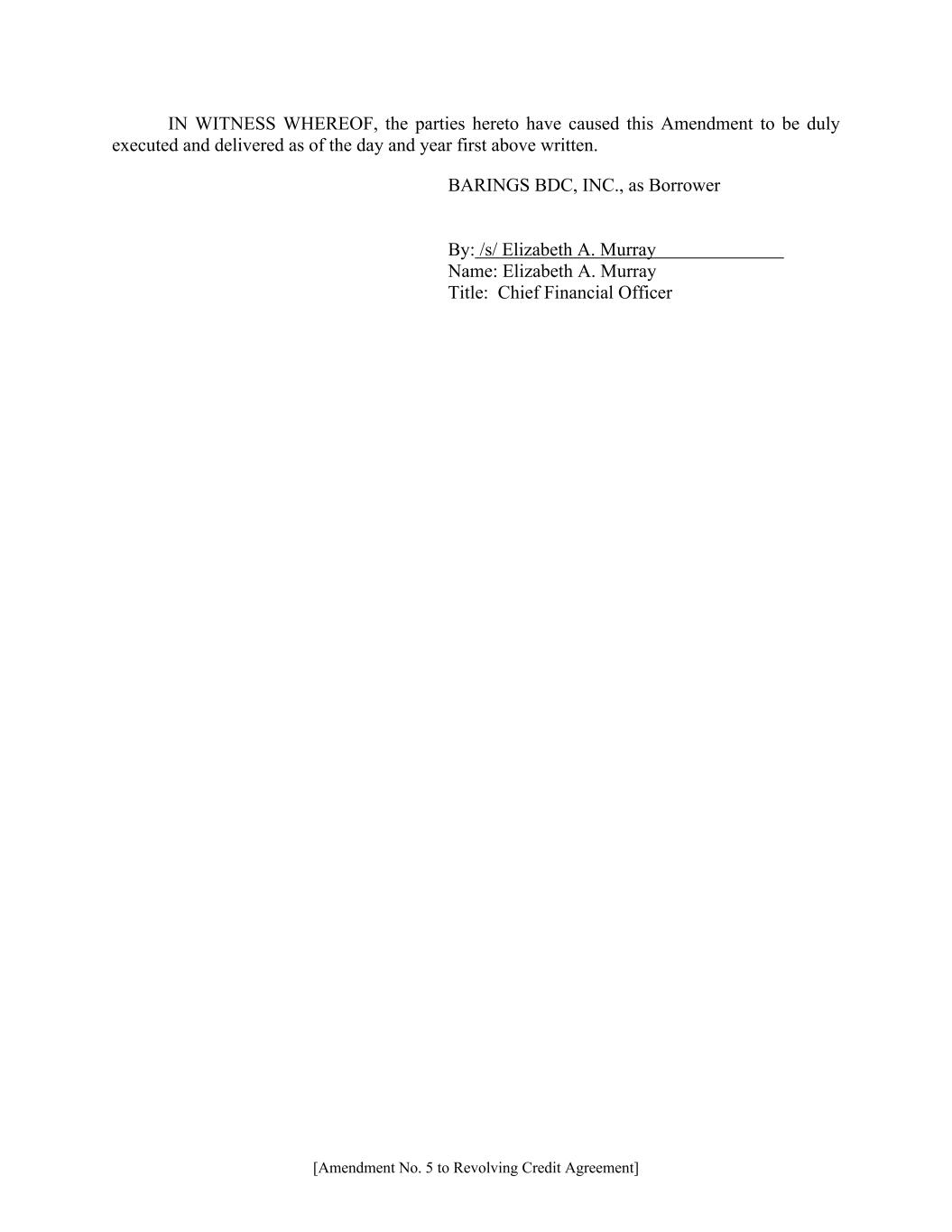 [Amendment No. 5 to Revolving Credit Agreement] IN WITNESS WHEREOF, the parties hereto have caused this Amendment to be duly executed and delivered as of the day and year first above written. BARINGS BDC, INC., as Borrower By: /s/ Elizabeth A. Murray Name: Elizabeth A. Murray Title: Chief Financial Officer