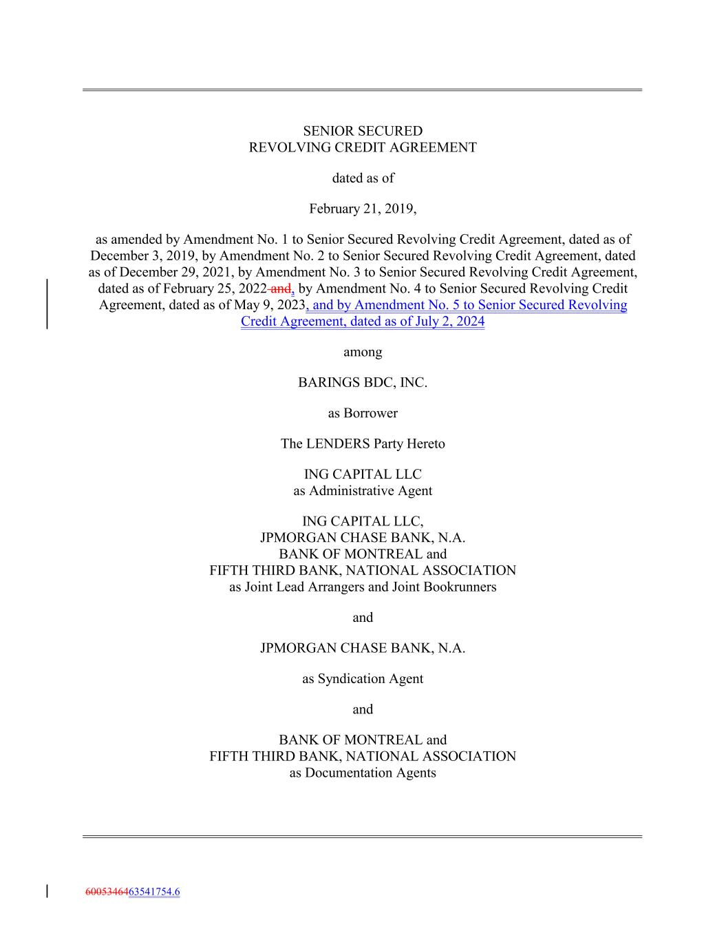 SENIOR SECURED REVOLVING CREDIT AGREEMENT dated as of February 21, 2019, as amended by Amendment No. 1 to Senior Secured Revolving Credit Agreement, dated as of December 3, 2019, by Amendment No. 2 to Senior Secured Revolving Credit Agreement, dated as of December 29, 2021, by Amendment No. 3 to Senior Secured Revolving Credit Agreement, dated as of February 25, 2022 and, by Amendment No. 4 to Senior Secured Revolving Credit Agreement, dated as of May 9, 2023, and by Amendment No. 5 to Senior Secured Revolving Credit Agreement, dated as of July 2, 2024 among BARINGS BDC, INC. as Borrower The LENDERS Party Hereto ING CAPITAL LLC as Administrative Agent ING CAPITAL LLC, JPMORGAN CHASE BANK, N.A. BANK OF MONTREAL and FIFTH THIRD BANK, NATIONAL ASSOCIATION as Joint Lead Arrangers and Joint Bookrunners and JPMORGAN CHASE BANK, N.A. as Syndication Agent and BANK OF MONTREAL and FIFTH THIRD BANK, NATIONAL ASSOCIATION as Documentation Agents 6005346463541754.6