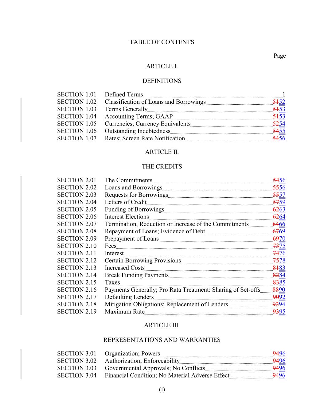 TABLE OF CONTENTS Page ARTICLE I. DEFINITIONS SECTION 1.01 Defined Terms 1 SECTION 1.02 Classification of Loans and Borrowings 5152 SECTION 1.03 Terms Generally 5153 SECTION 1.04 Accounting Terms; GAAP 5153 SECTION 1.05 Currencies; Currency Equivalents 5254 SECTION 1.06 Outstanding Indebtedness 5455 SECTION 1.07 Rates; Screen Rate Notification 5456 ARTICLE II. THE CREDITS SECTION 2.01 The Commitments 5456 SECTION 2.02 Loans and Borrowings 5556 SECTION 2.03 Requests for Borrowings 5557 SECTION 2.04 Letters of Credit 5759 SECTION 2.05 Funding of Borrowings 6263 SECTION 2.06 Interest Elections 6264 SECTION 2.07 Termination, Reduction or Increase of the Commitments 6466 SECTION 2.08 Repayment of Loans; Evidence of Debt 6769 SECTION 2.09 Prepayment of Loans 6970 SECTION 2.10 Fees 7375 SECTION 2.11 Interest 7476 SECTION 2.12 Certain Borrowing Provisions 7578 SECTION 2.13 Increased Costs 8183 SECTION 2.14 Break Funding Payments 8284 SECTION 2.15 Taxes 8385 SECTION 2.16 Payments Generally; Pro Rata Treatment: Sharing of Set-offs 8890 SECTION 2.17 Defaulting Lenders 9092 SECTION 2.18 Mitigation Obligations; Replacement of Lenders 9294 SECTION 2.19 Maximum Rate 9395 ARTICLE III. REPRESENTATIONS AND WARRANTIES SECTION 3.01 Organization; Powers 9496 SECTION 3.02 Authorization; Enforceability 9496 SECTION 3.03 Governmental Approvals; No Conflicts 9496 SECTION 3.04 Financial Condition; No Material Adverse Effect 9496 (i)