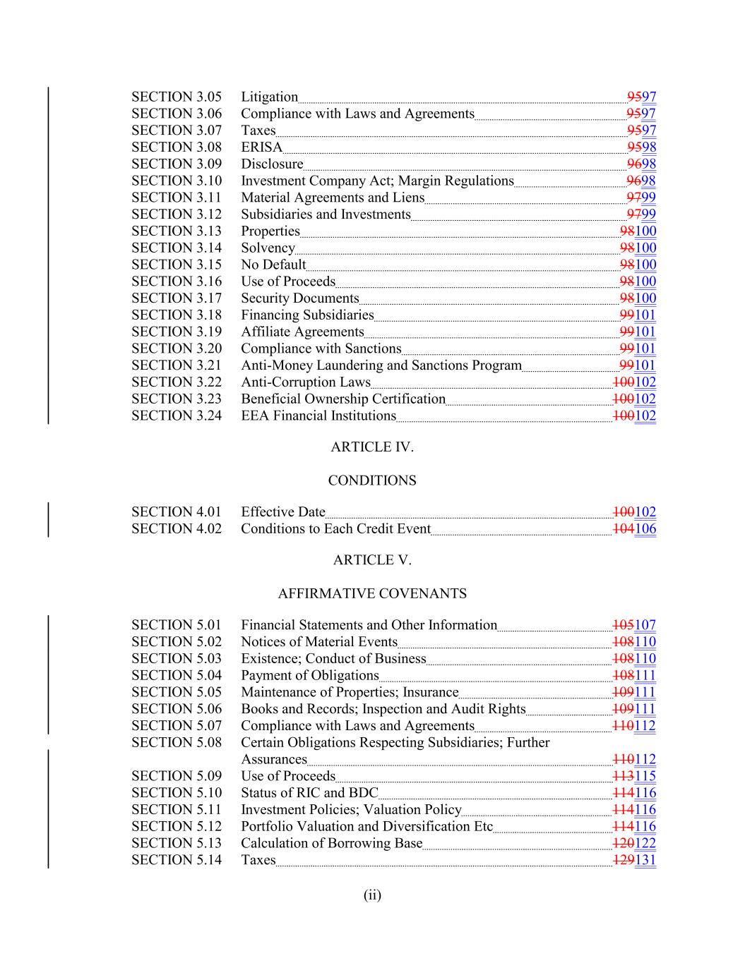 SECTION 3.05 Litigation 9597 SECTION 3.06 Compliance with Laws and Agreements 9597 SECTION 3.07 Taxes 9597 SECTION 3.08 ERISA 9598 SECTION 3.09 Disclosure 9698 SECTION 3.10 Investment Company Act; Margin Regulations 9698 SECTION 3.11 Material Agreements and Liens 9799 SECTION 3.12 Subsidiaries and Investments 9799 SECTION 3.13 Properties 98100 SECTION 3.14 Solvency 98100 SECTION 3.15 No Default 98100 SECTION 3.16 Use of Proceeds 98100 SECTION 3.17 Security Documents 98100 SECTION 3.18 Financing Subsidiaries 99101 SECTION 3.19 Affiliate Agreements 99101 SECTION 3.20 Compliance with Sanctions 99101 SECTION 3.21 Anti-Money Laundering and Sanctions Program 99101 SECTION 3.22 Anti-Corruption Laws 100102 SECTION 3.23 Beneficial Ownership Certification 100102 SECTION 3.24 EEA Financial Institutions 100102 ARTICLE IV. CONDITIONS SECTION 4.01 Effective Date 100102 SECTION 4.02 Conditions to Each Credit Event 104106 ARTICLE V. AFFIRMATIVE COVENANTS SECTION 5.01 Financial Statements and Other Information 105107 SECTION 5.02 Notices of Material Events 108110 SECTION 5.03 Existence; Conduct of Business 108110 SECTION 5.04 Payment of Obligations 108111 SECTION 5.05 Maintenance of Properties; Insurance 109111 SECTION 5.06 Books and Records; Inspection and Audit Rights 109111 SECTION 5.07 Compliance with Laws and Agreements 110112 SECTION 5.08 Certain Obligations Respecting Subsidiaries; Further Assurances 110112 SECTION 5.09 Use of Proceeds 113115 SECTION 5.10 Status of RIC and BDC 114116 SECTION 5.11 Investment Policies; Valuation Policy 114116 SECTION 5.12 Portfolio Valuation and Diversification Etc 114116 SECTION 5.13 Calculation of Borrowing Base 120122 SECTION 5.14 Taxes 129131 (ii)