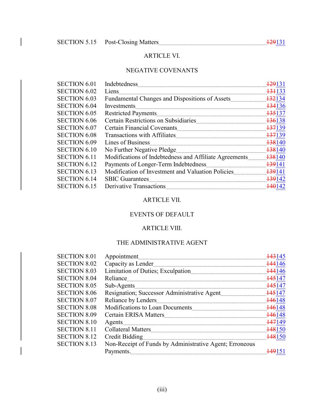 SECTION 5.15 Post-Closing Matters 129131 ARTICLE VI. NEGATIVE COVENANTS SECTION 6.01 Indebtedness 129131 SECTION 6.02 Liens 131133 SECTION 6.03 Fundamental Changes and Dispositions of Assets 132134 SECTION 6.04 Investments 134136 SECTION 6.05 Restricted Payments 135137 SECTION 6.06 Certain Restrictions on Subsidiaries 136138 SECTION 6.07 Certain Financial Covenants 137139 SECTION 6.08 Transactions with Affiliates 137139 SECTION 6.09 Lines of Business 138140 SECTION 6.10 No Further Negative Pledge 138140 SECTION 6.11 Modifications of Indebtedness and Affiliate Agreements 138140 SECTION 6.12 Payments of Longer-Term Indebtedness 139141 SECTION 6.13 Modification of Investment and Valuation Policies 139141 SECTION 6.14 SBIC Guarantees 139142 SECTION 6.15 Derivative Transactions 140142 ARTICLE VII. EVENTS OF DEFAULT ARTICLE VIII. THE ADMINISTRATIVE AGENT SECTION 8.01 Appointment 143145 SECTION 8.02 Capacity as Lender 144146 SECTION 8.03 Limitation of Duties; Exculpation 144146 SECTION 8.04 Reliance 145147 SECTION 8.05 Sub-Agents 145147 SECTION 8.06 Resignation; Successor Administrative Agent 145147 SECTION 8.07 Reliance by Lenders 146148 SECTION 8.08 Modifications to Loan Documents 146148 SECTION 8.09 Certain ERISA Matters 146148 SECTION 8.10 Agents 147149 SECTION 8.11 Collateral Matters 148150 SECTION 8.12 Credit Bidding 148150 SECTION 8.13 Non-Receipt of Funds by Administrative Agent; Erroneous Payments. 149151 (iii)