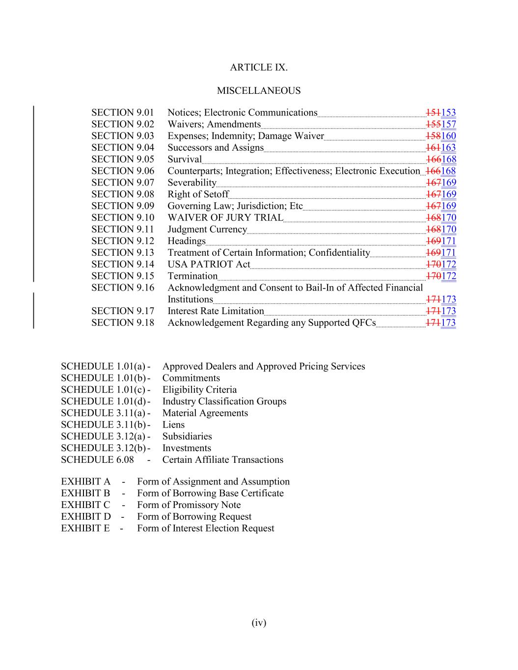 ARTICLE IX. MISCELLANEOUS SECTION 9.01 Notices; Electronic Communications 151153 SECTION 9.02 Waivers; Amendments 155157 SECTION 9.03 Expenses; Indemnity; Damage Waiver 158160 SECTION 9.04 Successors and Assigns 161163 SECTION 9.05 Survival 166168 SECTION 9.06 Counterparts; Integration; Effectiveness; Electronic Execution 166168 SECTION 9.07 Severability 167169 SECTION 9.08 Right of Setoff 167169 SECTION 9.09 Governing Law; Jurisdiction; Etc 167169 SECTION 9.10 WAIVER OF JURY TRIAL 168170 SECTION 9.11 Judgment Currency 168170 SECTION 9.12 Headings 169171 SECTION 9.13 Treatment of Certain Information; Confidentiality 169171 SECTION 9.14 USA PATRIOT Act 170172 SECTION 9.15 Termination 170172 SECTION 9.16 Acknowledgment and Consent to Bail-In of Affected Financial Institutions 171173 SECTION 9.17 Interest Rate Limitation 171173 SECTION 9.18 Acknowledgement Regarding any Supported QFCs 171173 SCHEDULE 1.01(a) - Approved Dealers and Approved Pricing Services SCHEDULE 1.01(b) - Commitments SCHEDULE 1.01(c) - Eligibility Criteria SCHEDULE 1.01(d) - Industry Classification Groups SCHEDULE 3.11(a) - Material Agreements SCHEDULE 3.11(b) - Liens SCHEDULE 3.12(a) - Subsidiaries SCHEDULE 3.12(b) - Investments SCHEDULE 6.08 - Certain Affiliate Transactions EXHIBIT A - Form of Assignment and Assumption EXHIBIT B - Form of Borrowing Base Certificate EXHIBIT C - Form of Promissory Note EXHIBIT D - Form of Borrowing Request EXHIBIT E - Form of Interest Election Request (iv)