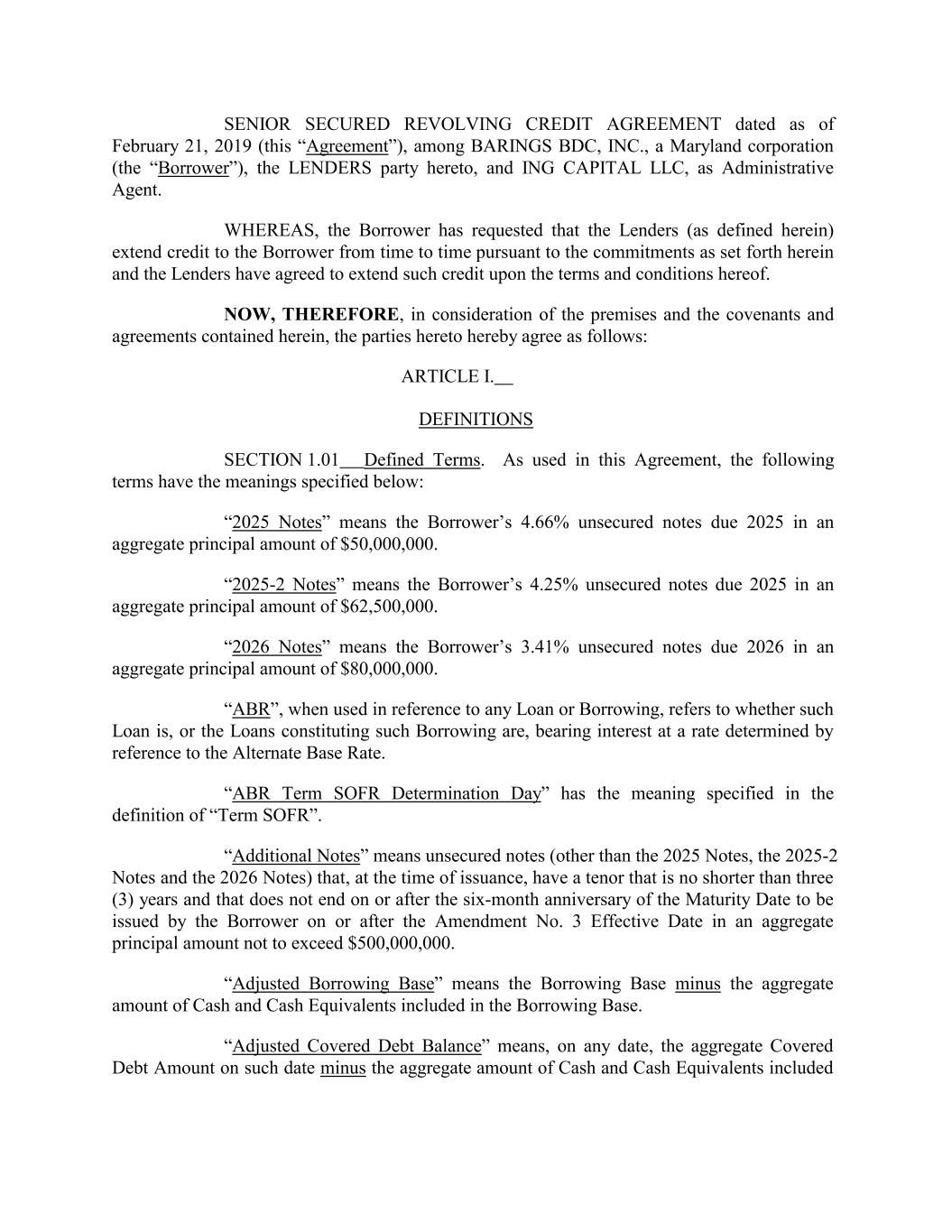 SENIOR SECURED REVOLVING CREDIT AGREEMENT dated as of February 21, 2019 (this “Agreement”), among BARINGS BDC, INC., a Maryland corporation (the “Borrower”), the LENDERS party hereto, and ING CAPITAL LLC, as Administrative Agent. WHEREAS, the Borrower has requested that the Lenders (as defined herein) extend credit to the Borrower from time to time pursuant to the commitments as set forth herein and the Lenders have agreed to extend such credit upon the terms and conditions hereof. NOW, THEREFORE, in consideration of the premises and the covenants and agreements contained herein, the parties hereto hereby agree as follows: ARTICLE I. DEFINITIONS SECTION 1.01 Defined Terms. As used in this Agreement, the following terms have the meanings specified below: “2025 Notes” means the Borrower’s 4.66% unsecured notes due 2025 in an aggregate principal amount of $50,000,000. “2025-2 Notes” means the Borrower’s 4.25% unsecured notes due 2025 in an aggregate principal amount of $62,500,000. “2026 Notes” means the Borrower’s 3.41% unsecured notes due 2026 in an aggregate principal amount of $80,000,000. “ABR”, when used in reference to any Loan or Borrowing, refers to whether such Loan is, or the Loans constituting such Borrowing are, bearing interest at a rate determined by reference to the Alternate Base Rate. “ABR Term SOFR Determination Day” has the meaning specified in the definition of “Term SOFR”. “Additional Notes” means unsecured notes (other than the 2025 Notes, the 2025-2 Notes and the 2026 Notes) that, at the time of issuance, have a tenor that is no shorter than three (3) years and that does not end on or after the six-month anniversary of the Maturity Date to be issued by the Borrower on or after the Amendment No. 3 Effective Date in an aggregate principal amount not to exceed $500,000,000. “Adjusted Borrowing Base” means the Borrowing Base minus the aggregate amount of Cash and Cash Equivalents included in the Borrowing Base. “Adjusted Covered Debt Balance” means, on any date, the aggregate Covered Debt Amount on such date minus the aggregate amount of Cash and Cash Equivalents included