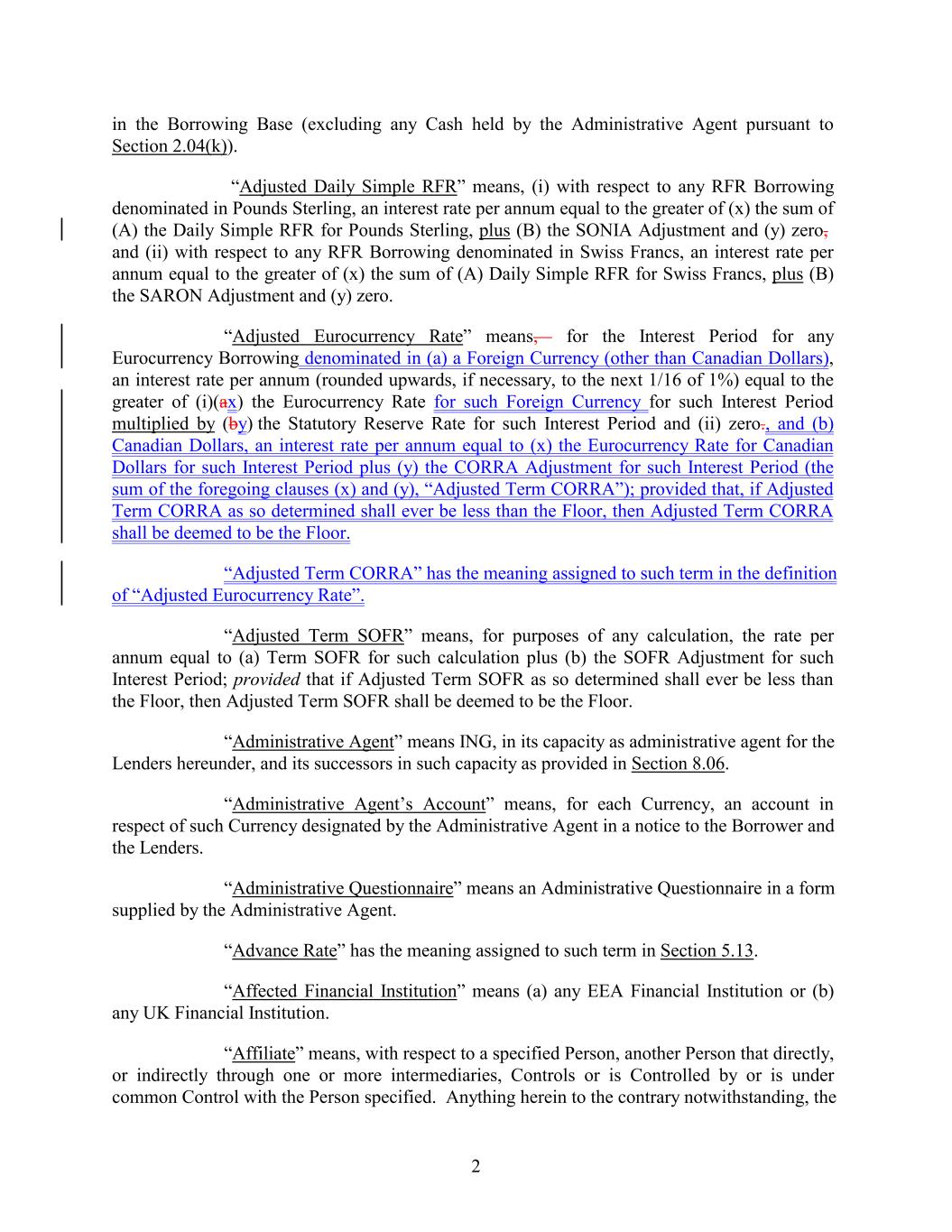 in the Borrowing Base (excluding any Cash held by the Administrative Agent pursuant to Section 2.04(k)). “Adjusted Daily Simple RFR” means, (i) with respect to any RFR Borrowing denominated in Pounds Sterling, an interest rate per annum equal to the greater of (x) the sum of (A) the Daily Simple RFR for Pounds Sterling, plus (B) the SONIA Adjustment and (y) zero, and (ii) with respect to any RFR Borrowing denominated in Swiss Francs, an interest rate per annum equal to the greater of (x) the sum of (A) Daily Simple RFR for Swiss Francs, plus (B) the SARON Adjustment and (y) zero. “Adjusted Eurocurrency Rate” means, for the Interest Period for any Eurocurrency Borrowing denominated in (a) a Foreign Currency (other than Canadian Dollars), an interest rate per annum (rounded upwards, if necessary, to the next 1/16 of 1%) equal to the greater of (i)(ax) the Eurocurrency Rate for such Foreign Currency for such Interest Period multiplied by (by) the Statutory Reserve Rate for such Interest Period and (ii) zero., and (b) Canadian Dollars, an interest rate per annum equal to (x) the Eurocurrency Rate for Canadian Dollars for such Interest Period plus (y) the CORRA Adjustment for such Interest Period (the sum of the foregoing clauses (x) and (y), “Adjusted Term CORRA”); provided that, if Adjusted Term CORRA as so determined shall ever be less than the Floor, then Adjusted Term CORRA shall be deemed to be the Floor. “Adjusted Term CORRA” has the meaning assigned to such term in the definition of “Adjusted Eurocurrency Rate”. “Adjusted Term SOFR” means, for purposes of any calculation, the rate per annum equal to (a) Term SOFR for such calculation plus (b) the SOFR Adjustment for such Interest Period; provided that if Adjusted Term SOFR as so determined shall ever be less than the Floor, then Adjusted Term SOFR shall be deemed to be the Floor. “Administrative Agent” means ING, in its capacity as administrative agent for the Lenders hereunder, and its successors in such capacity as provided in Section 8.06. “Administrative Agent’s Account” means, for each Currency, an account in respect of such Currency designated by the Administrative Agent in a notice to the Borrower and the Lenders. “Administrative Questionnaire” means an Administrative Questionnaire in a form supplied by the Administrative Agent. “Advance Rate” has the meaning assigned to such term in Section 5.13. “Affected Financial Institution” means (a) any EEA Financial Institution or (b) any UK Financial Institution. “Affiliate” means, with respect to a specified Person, another Person that directly, or indirectly through one or more intermediaries, Controls or is Controlled by or is under common Control with the Person specified. Anything herein to the contrary notwithstanding, the 2