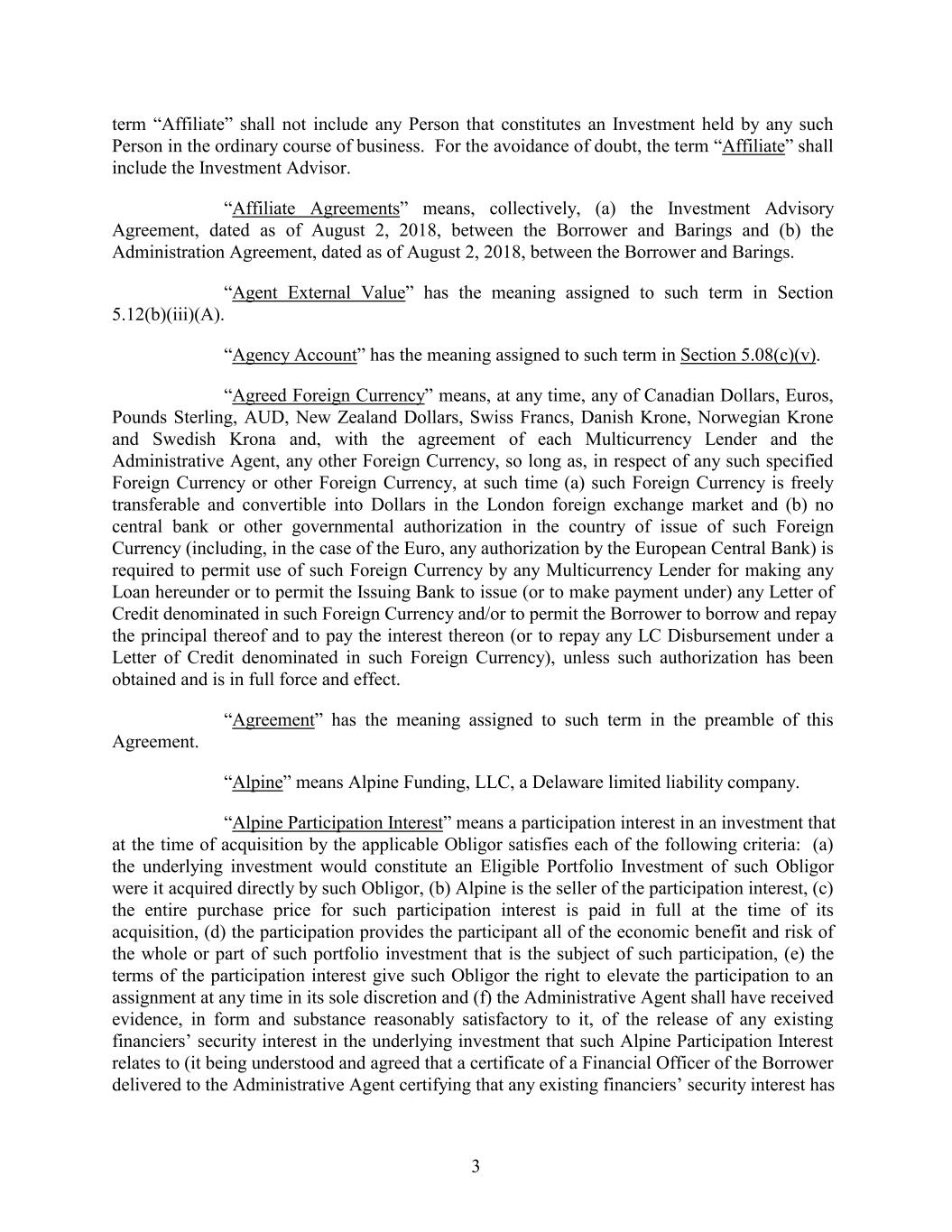 term “Affiliate” shall not include any Person that constitutes an Investment held by any such Person in the ordinary course of business. For the avoidance of doubt, the term “Affiliate” shall include the Investment Advisor. “Affiliate Agreements” means, collectively, (a) the Investment Advisory Agreement, dated as of August 2, 2018, between the Borrower and Barings and (b) the Administration Agreement, dated as of August 2, 2018, between the Borrower and Barings. “Agent External Value” has the meaning assigned to such term in Section 5.12(b)(iii)(A). “Agency Account” has the meaning assigned to such term in Section 5.08(c)(v). “Agreed Foreign Currency” means, at any time, any of Canadian Dollars, Euros, Pounds Sterling, AUD, New Zealand Dollars, Swiss Francs, Danish Krone, Norwegian Krone and Swedish Krona and, with the agreement of each Multicurrency Lender and the Administrative Agent, any other Foreign Currency, so long as, in respect of any such specified Foreign Currency or other Foreign Currency, at such time (a) such Foreign Currency is freely transferable and convertible into Dollars in the London foreign exchange market and (b) no central bank or other governmental authorization in the country of issue of such Foreign Currency (including, in the case of the Euro, any authorization by the European Central Bank) is required to permit use of such Foreign Currency by any Multicurrency Lender for making any Loan hereunder or to permit the Issuing Bank to issue (or to make payment under) any Letter of Credit denominated in such Foreign Currency and/or to permit the Borrower to borrow and repay the principal thereof and to pay the interest thereon (or to repay any LC Disbursement under a Letter of Credit denominated in such Foreign Currency), unless such authorization has been obtained and is in full force and effect. “Agreement” has the meaning assigned to such term in the preamble of this Agreement. “Alpine” means Alpine Funding, LLC, a Delaware limited liability company. “Alpine Participation Interest” means a participation interest in an investment that at the time of acquisition by the applicable Obligor satisfies each of the following criteria: (a) the underlying investment would constitute an Eligible Portfolio Investment of such Obligor were it acquired directly by such Obligor, (b) Alpine is the seller of the participation interest, (c) the entire purchase price for such participation interest is paid in full at the time of its acquisition, (d) the participation provides the participant all of the economic benefit and risk of the whole or part of such portfolio investment that is the subject of such participation, (e) the terms of the participation interest give such Obligor the right to elevate the participation to an assignment at any time in its sole discretion and (f) the Administrative Agent shall have received evidence, in form and substance reasonably satisfactory to it, of the release of any existing financiers’ security interest in the underlying investment that such Alpine Participation Interest relates to (it being understood and agreed that a certificate of a Financial Officer of the Borrower delivered to the Administrative Agent certifying that any existing financiers’ security interest has 3