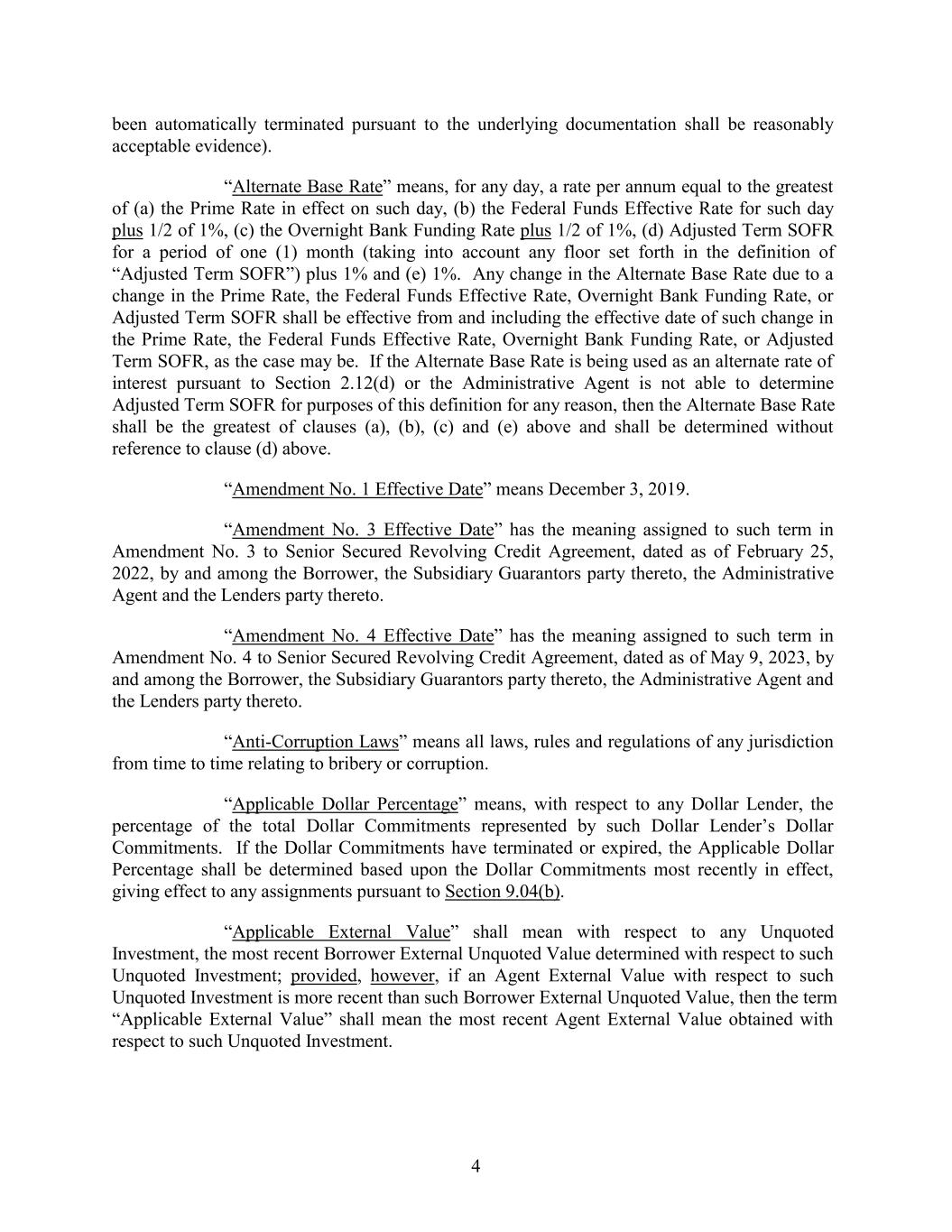 been automatically terminated pursuant to the underlying documentation shall be reasonably acceptable evidence). “Alternate Base Rate” means, for any day, a rate per annum equal to the greatest of (a) the Prime Rate in effect on such day, (b) the Federal Funds Effective Rate for such day plus 1/2 of 1%, (c) the Overnight Bank Funding Rate plus 1/2 of 1%, (d) Adjusted Term SOFR for a period of one (1) month (taking into account any floor set forth in the definition of “Adjusted Term SOFR”) plus 1% and (e) 1%. Any change in the Alternate Base Rate due to a change in the Prime Rate, the Federal Funds Effective Rate, Overnight Bank Funding Rate, or Adjusted Term SOFR shall be effective from and including the effective date of such change in the Prime Rate, the Federal Funds Effective Rate, Overnight Bank Funding Rate, or Adjusted Term SOFR, as the case may be. If the Alternate Base Rate is being used as an alternate rate of interest pursuant to Section 2.12(d) or the Administrative Agent is not able to determine Adjusted Term SOFR for purposes of this definition for any reason, then the Alternate Base Rate shall be the greatest of clauses (a), (b), (c) and (e) above and shall be determined without reference to clause (d) above. “Amendment No. 1 Effective Date” means December 3, 2019. “Amendment No. 3 Effective Date” has the meaning assigned to such term in Amendment No. 3 to Senior Secured Revolving Credit Agreement, dated as of February 25, 2022, by and among the Borrower, the Subsidiary Guarantors party thereto, the Administrative Agent and the Lenders party thereto. “Amendment No. 4 Effective Date” has the meaning assigned to such term in Amendment No. 4 to Senior Secured Revolving Credit Agreement, dated as of May 9, 2023, by and among the Borrower, the Subsidiary Guarantors party thereto, the Administrative Agent and the Lenders party thereto. “Anti-Corruption Laws” means all laws, rules and regulations of any jurisdiction from time to time relating to bribery or corruption. “Applicable Dollar Percentage” means, with respect to any Dollar Lender, the percentage of the total Dollar Commitments represented by such Dollar Lender’s Dollar Commitments. If the Dollar Commitments have terminated or expired, the Applicable Dollar Percentage shall be determined based upon the Dollar Commitments most recently in effect, giving effect to any assignments pursuant to Section 9.04(b). “Applicable External Value” shall mean with respect to any Unquoted Investment, the most recent Borrower External Unquoted Value determined with respect to such Unquoted Investment; provided, however, if an Agent External Value with respect to such Unquoted Investment is more recent than such Borrower External Unquoted Value, then the term “Applicable External Value” shall mean the most recent Agent External Value obtained with respect to such Unquoted Investment. 4