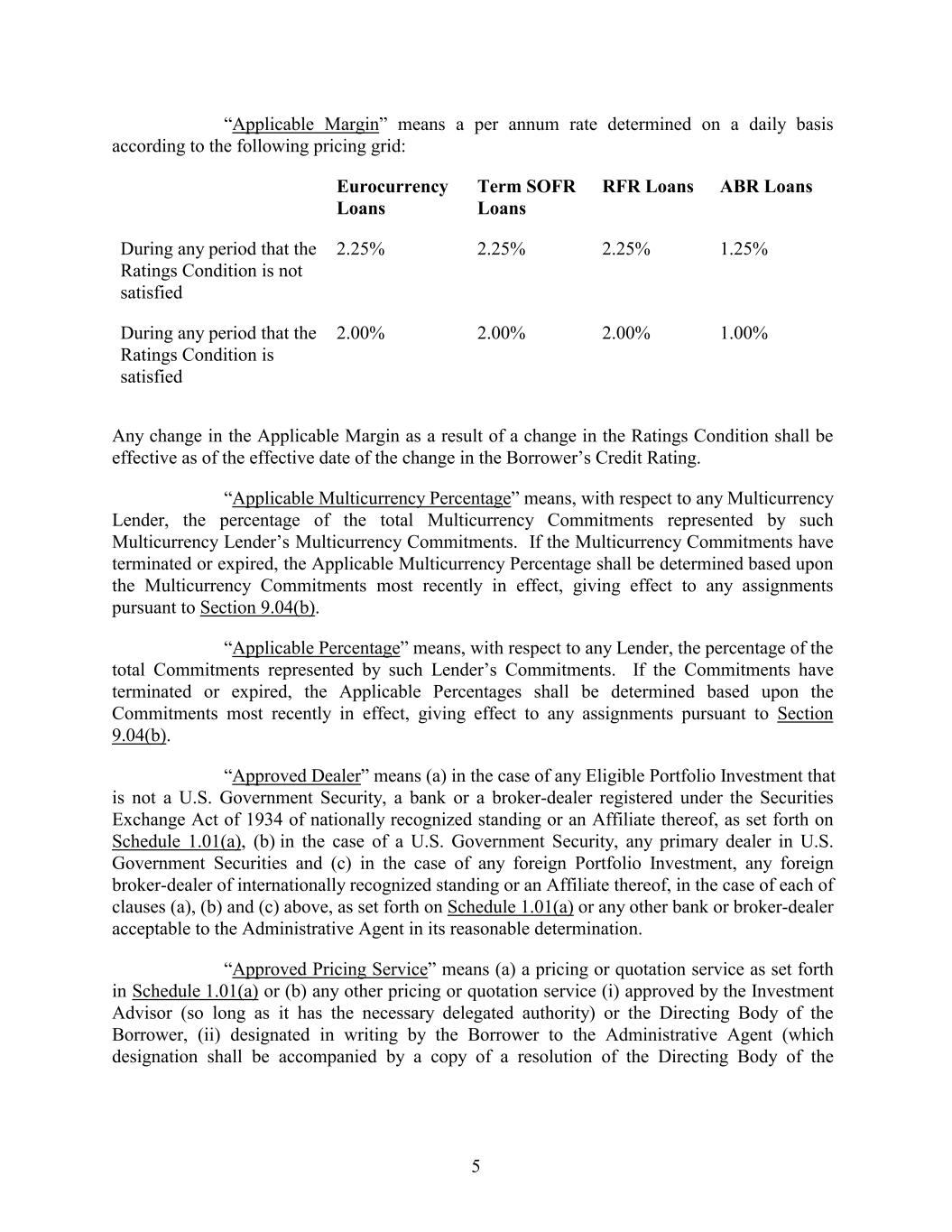 5 2.25% “Applicable Margin” means a per annum rate determined on a daily basis according to the following pricing grid: 2.25% Term SOFR Loans 2.25% 1.25% RFR Loans During any period that the Ratings Condition is satisfied ABR Loans 2.00% 2.00% 2.00% 1.00% During any period that the Ratings Condition is not satisfied Any change in the Applicable Margin as a result of a change in the Ratings Condition shall be effective as of the effective date of the change in the Borrower’s Credit Rating. “Applicable Multicurrency Percentage” means, with respect to any Multicurrency Lender, the percentage of the total Multicurrency Commitments represented by such Multicurrency Lender’s Multicurrency Commitments. If the Multicurrency Commitments have terminated or expired, the Applicable Multicurrency Percentage shall be determined based upon the Multicurrency Commitments most recently in effect, giving effect to any assignments pursuant to Section 9.04(b). “Applicable Percentage” means, with respect to any Lender, the percentage of the total Commitments represented by such Lender’s Commitments. If the Commitments have terminated or expired, the Applicable Percentages shall be determined based upon the Commitments most recently in effect, giving effect to any assignments pursuant to Section 9.04(b). “Approved Dealer” means (a) in the case of any Eligible Portfolio Investment that is not a U.S. Government Security, a bank or a broker-dealer registered under the Securities Exchange Act of 1934 of nationally recognized standing or an Affiliate thereof, as set forth on Schedule 1.01(a), (b) in the case of a U.S. Government Security, any primary dealer in U.S. Government Securities and (c) in the case of any foreign Portfolio Investment, any foreign broker-dealer of internationally recognized standing or an Affiliate thereof, in the case of each of clauses (a), (b) and (c) above, as set forth on Schedule 1.01(a) or any other bank or broker-dealer acceptable to the Administrative Agent in its reasonable determination. “Approved Pricing Service” means (a) a pricing or quotation service as set forth in Schedule 1.01(a) or (b) any other pricing or quotation service (i) approved by the Investment Advisor (so long as it has the necessary delegated authority) or the Directing Body of the Borrower, (ii) designated in writing by the Borrower to the Administrative Agent (which designation shall be accompanied by a copy of a resolution of the Directing Body of the Eurocurrency Loans