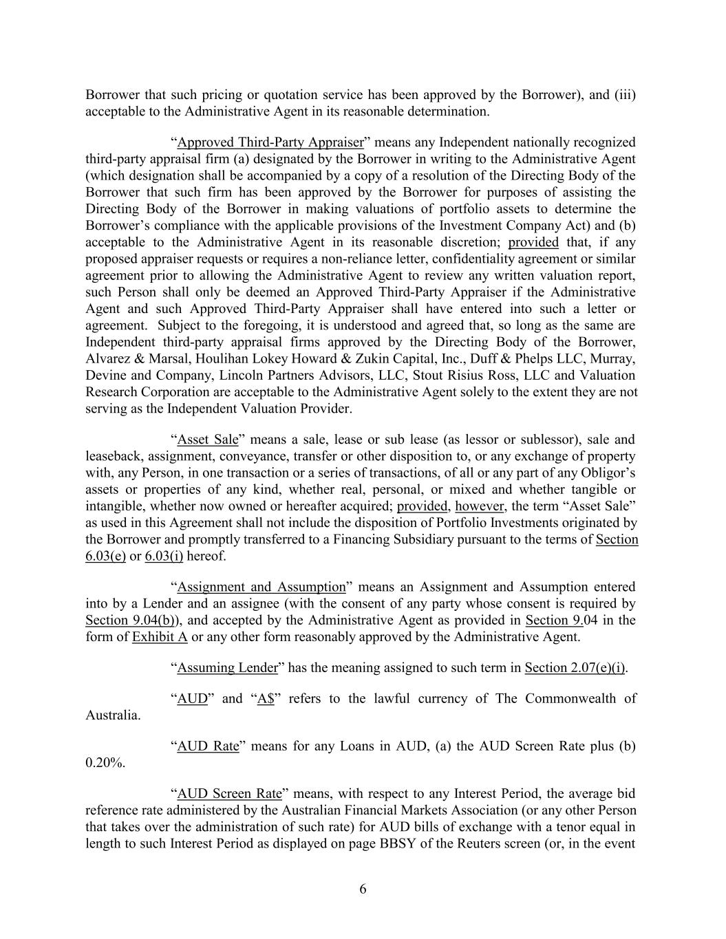 Borrower that such pricing or quotation service has been approved by the Borrower), and (iii) acceptable to the Administrative Agent in its reasonable determination. “Approved Third-Party Appraiser” means any Independent nationally recognized third-party appraisal firm (a) designated by the Borrower in writing to the Administrative Agent (which designation shall be accompanied by a copy of a resolution of the Directing Body of the Borrower that such firm has been approved by the Borrower for purposes of assisting the Directing Body of the Borrower in making valuations of portfolio assets to determine the Borrower’s compliance with the applicable provisions of the Investment Company Act) and (b) acceptable to the Administrative Agent in its reasonable discretion; provided that, if any proposed appraiser requests or requires a non-reliance letter, confidentiality agreement or similar agreement prior to allowing the Administrative Agent to review any written valuation report, such Person shall only be deemed an Approved Third-Party Appraiser if the Administrative Agent and such Approved Third-Party Appraiser shall have entered into such a letter or agreement. Subject to the foregoing, it is understood and agreed that, so long as the same are Independent third-party appraisal firms approved by the Directing Body of the Borrower, Alvarez & Marsal, Houlihan Lokey Howard & Zukin Capital, Inc., Duff & Phelps LLC, Murray, Devine and Company, Lincoln Partners Advisors, LLC, Stout Risius Ross, LLC and Valuation Research Corporation are acceptable to the Administrative Agent solely to the extent they are not serving as the Independent Valuation Provider. “Asset Sale” means a sale, lease or sub lease (as lessor or sublessor), sale and leaseback, assignment, conveyance, transfer or other disposition to, or any exchange of property with, any Person, in one transaction or a series of transactions, of all or any part of any Obligor’s assets or properties of any kind, whether real, personal, or mixed and whether tangible or intangible, whether now owned or hereafter acquired; provided, however, the term “Asset Sale” as used in this Agreement shall not include the disposition of Portfolio Investments originated by the Borrower and promptly transferred to a Financing Subsidiary pursuant to the terms of Section 6.03(e) or 6.03(i) hereof. “Assignment and Assumption” means an Assignment and Assumption entered into by a Lender and an assignee (with the consent of any party whose consent is required by Section 9.04(b)), and accepted by the Administrative Agent as provided in Section 9.04 in the form of Exhibit A or any other form reasonably approved by the Administrative Agent. “Assuming Lender” has the meaning assigned to such term in Section 2.07(e)(i). “AUD” and “A$” refers to the lawful currency of The Commonwealth of Australia. “AUD Rate” means for any Loans in AUD, (a) the AUD Screen Rate plus (b) 0.20%. “AUD Screen Rate” means, with respect to any Interest Period, the average bid reference rate administered by the Australian Financial Markets Association (or any other Person that takes over the administration of such rate) for AUD bills of exchange with a tenor equal in length to such Interest Period as displayed on page BBSY of the Reuters screen (or, in the event 6