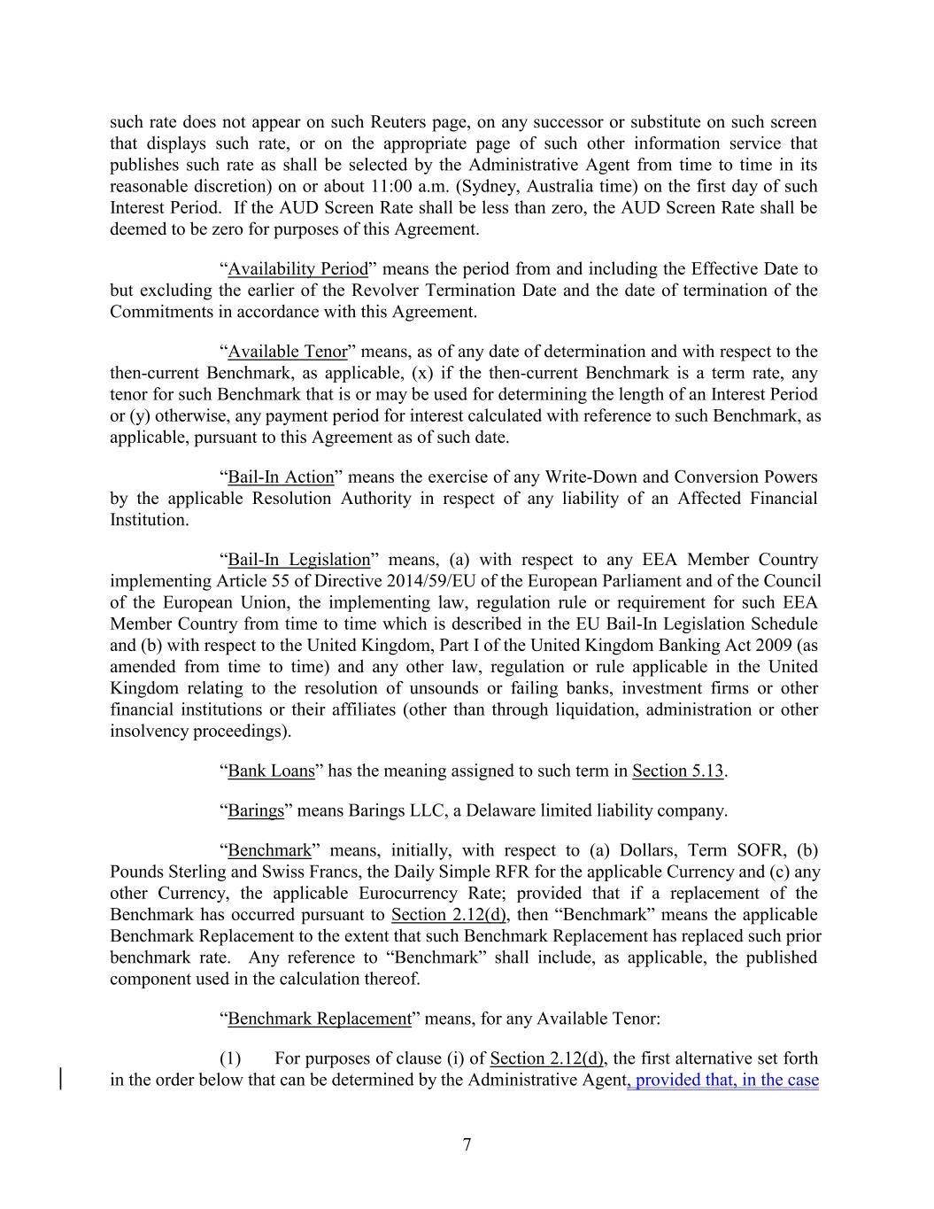 such rate does not appear on such Reuters page, on any successor or substitute on such screen that displays such rate, or on the appropriate page of such other information service that publishes such rate as shall be selected by the Administrative Agent from time to time in its reasonable discretion) on or about 11:00 a.m. (Sydney, Australia time) on the first day of such Interest Period. If the AUD Screen Rate shall be less than zero, the AUD Screen Rate shall be deemed to be zero for purposes of this Agreement. “Availability Period” means the period from and including the Effective Date to but excluding the earlier of the Revolver Termination Date and the date of termination of the Commitments in accordance with this Agreement. “Available Tenor” means, as of any date of determination and with respect to the then-current Benchmark, as applicable, (x) if the then-current Benchmark is a term rate, any tenor for such Benchmark that is or may be used for determining the length of an Interest Period or (y) otherwise, any payment period for interest calculated with reference to such Benchmark, as applicable, pursuant to this Agreement as of such date. “Bail-In Action” means the exercise of any Write-Down and Conversion Powers by the applicable Resolution Authority in respect of any liability of an Affected Financial Institution. “Bail-In Legislation” means, (a) with respect to any EEA Member Country implementing Article 55 of Directive 2014/59/EU of the European Parliament and of the Council of the European Union, the implementing law, regulation rule or requirement for such EEA Member Country from time to time which is described in the EU Bail-In Legislation Schedule and (b) with respect to the United Kingdom, Part I of the United Kingdom Banking Act 2009 (as amended from time to time) and any other law, regulation or rule applicable in the United Kingdom relating to the resolution of unsounds or failing banks, investment firms or other financial institutions or their affiliates (other than through liquidation, administration or other insolvency proceedings). “Bank Loans” has the meaning assigned to such term in Section 5.13. “Barings” means Barings LLC, a Delaware limited liability company. “Benchmark” means, initially, with respect to (a) Dollars, Term SOFR, (b) Pounds Sterling and Swiss Francs, the Daily Simple RFR for the applicable Currency and (c) any other Currency, the applicable Eurocurrency Rate; provided that if a replacement of the Benchmark has occurred pursuant to Section 2.12(d), then “Benchmark” means the applicable Benchmark Replacement to the extent that such Benchmark Replacement has replaced such prior benchmark rate. Any reference to “Benchmark” shall include, as applicable, the published component used in the calculation thereof. “Benchmark Replacement” means, for any Available Tenor: (1) For purposes of clause (i) of Section 2.12(d), the first alternative set forth in the order below that can be determined by the Administrative Agent, provided that, in the case 7