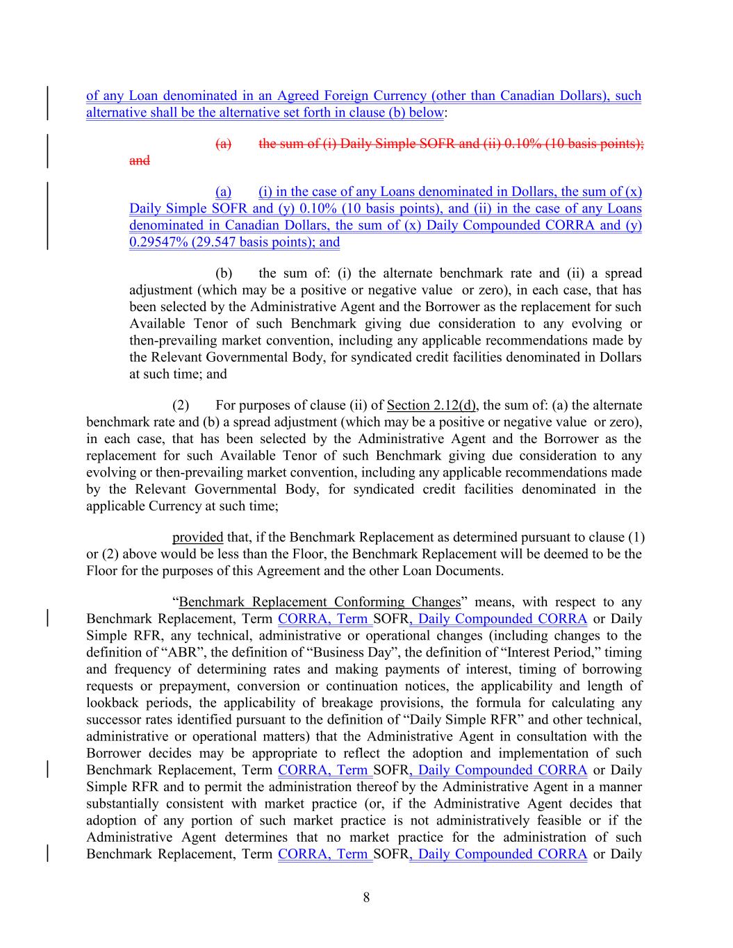 of any Loan denominated in an Agreed Foreign Currency (other than Canadian Dollars), such alternative shall be the alternative set forth in clause (b) below: (a) the sum of (i) Daily Simple SOFR and (ii) 0.10% (10 basis points); and (a) (i) in the case of any Loans denominated in Dollars, the sum of (x) Daily Simple SOFR and (y) 0.10% (10 basis points), and (ii) in the case of any Loans denominated in Canadian Dollars, the sum of (x) Daily Compounded CORRA and (y) 0.29547% (29.547 basis points); and (b) the sum of: (i) the alternate benchmark rate and (ii) a spread adjustment (which may be a positive or negative value or zero), in each case, that has been selected by the Administrative Agent and the Borrower as the replacement for such Available Tenor of such Benchmark giving due consideration to any evolving or then-prevailing market convention, including any applicable recommendations made by the Relevant Governmental Body, for syndicated credit facilities denominated in Dollars at such time; and (2) For purposes of clause (ii) of Section 2.12(d), the sum of: (a) the alternate benchmark rate and (b) a spread adjustment (which may be a positive or negative value or zero), in each case, that has been selected by the Administrative Agent and the Borrower as the replacement for such Available Tenor of such Benchmark giving due consideration to any evolving or then-prevailing market convention, including any applicable recommendations made by the Relevant Governmental Body, for syndicated credit facilities denominated in the applicable Currency at such time; provided that, if the Benchmark Replacement as determined pursuant to clause (1) or (2) above would be less than the Floor, the Benchmark Replacement will be deemed to be the Floor for the purposes of this Agreement and the other Loan Documents. “Benchmark Replacement Conforming Changes” means, with respect to any Benchmark Replacement, Term CORRA, Term SOFR, Daily Compounded CORRA or Daily Simple RFR, any technical, administrative or operational changes (including changes to the definition of “ABR”, the definition of “Business Day”, the definition of “Interest Period,” timing and frequency of determining rates and making payments of interest, timing of borrowing requests or prepayment, conversion or continuation notices, the applicability and length of lookback periods, the applicability of breakage provisions, the formula for calculating any successor rates identified pursuant to the definition of “Daily Simple RFR” and other technical, administrative or operational matters) that the Administrative Agent in consultation with the Borrower decides may be appropriate to reflect the adoption and implementation of such Benchmark Replacement, Term CORRA, Term SOFR, Daily Compounded CORRA or Daily Simple RFR and to permit the administration thereof by the Administrative Agent in a manner substantially consistent with market practice (or, if the Administrative Agent decides that adoption of any portion of such market practice is not administratively feasible or if the Administrative Agent determines that no market practice for the administration of such Benchmark Replacement, Term CORRA, Term SOFR, Daily Compounded CORRA or Daily 8