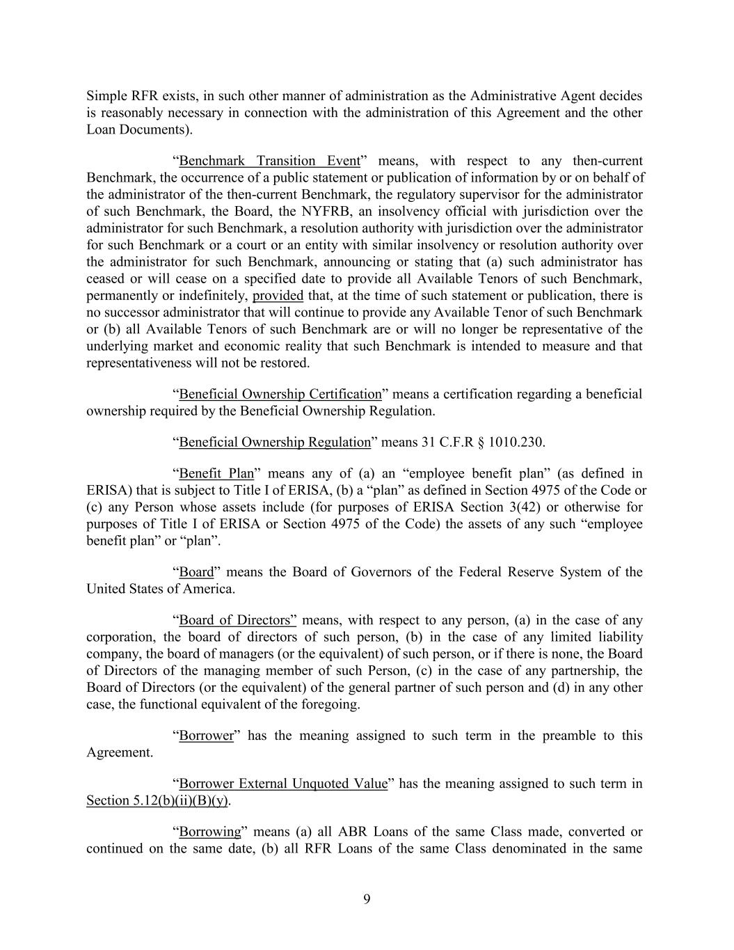 Simple RFR exists, in such other manner of administration as the Administrative Agent decides is reasonably necessary in connection with the administration of this Agreement and the other Loan Documents). “Benchmark Transition Event” means, with respect to any then-current Benchmark, the occurrence of a public statement or publication of information by or on behalf of the administrator of the then-current Benchmark, the regulatory supervisor for the administrator of such Benchmark, the Board, the NYFRB, an insolvency official with jurisdiction over the administrator for such Benchmark, a resolution authority with jurisdiction over the administrator for such Benchmark or a court or an entity with similar insolvency or resolution authority over the administrator for such Benchmark, announcing or stating that (a) such administrator has ceased or will cease on a specified date to provide all Available Tenors of such Benchmark, permanently or indefinitely, provided that, at the time of such statement or publication, there is no successor administrator that will continue to provide any Available Tenor of such Benchmark or (b) all Available Tenors of such Benchmark are or will no longer be representative of the underlying market and economic reality that such Benchmark is intended to measure and that representativeness will not be restored. “Beneficial Ownership Certification” means a certification regarding a beneficial ownership required by the Beneficial Ownership Regulation. “Beneficial Ownership Regulation” means 31 C.F.R § 1010.230. “Benefit Plan” means any of (a) an “employee benefit plan” (as defined in ERISA) that is subject to Title I of ERISA, (b) a “plan” as defined in Section 4975 of the Code or (c) any Person whose assets include (for purposes of ERISA Section 3(42) or otherwise for purposes of Title I of ERISA or Section 4975 of the Code) the assets of any such “employee benefit plan” or “plan”. “Board” means the Board of Governors of the Federal Reserve System of the United States of America. “Board of Directors” means, with respect to any person, (a) in the case of any corporation, the board of directors of such person, (b) in the case of any limited liability company, the board of managers (or the equivalent) of such person, or if there is none, the Board of Directors of the managing member of such Person, (c) in the case of any partnership, the Board of Directors (or the equivalent) of the general partner of such person and (d) in any other case, the functional equivalent of the foregoing. “Borrower” has the meaning assigned to such term in the preamble to this Agreement. “Borrower External Unquoted Value” has the meaning assigned to such term in Section 5.12(b)(ii)(B)(y). “Borrowing” means (a) all ABR Loans of the same Class made, converted or continued on the same date, (b) all RFR Loans of the same Class denominated in the same 9