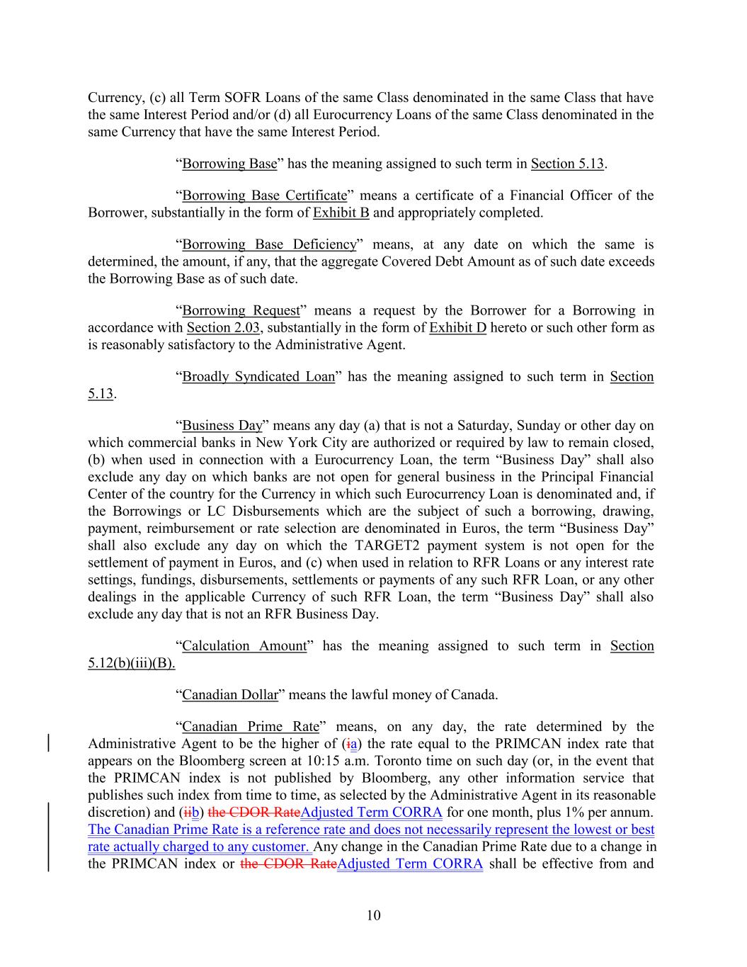 Currency, (c) all Term SOFR Loans of the same Class denominated in the same Class that have the same Interest Period and/or (d) all Eurocurrency Loans of the same Class denominated in the same Currency that have the same Interest Period. “Borrowing Base” has the meaning assigned to such term in Section 5.13. “Borrowing Base Certificate” means a certificate of a Financial Officer of the Borrower, substantially in the form of Exhibit B and appropriately completed. “Borrowing Base Deficiency” means, at any date on which the same is determined, the amount, if any, that the aggregate Covered Debt Amount as of such date exceeds the Borrowing Base as of such date. “Borrowing Request” means a request by the Borrower for a Borrowing in accordance with Section 2.03, substantially in the form of Exhibit D hereto or such other form as is reasonably satisfactory to the Administrative Agent. “Broadly Syndicated Loan” has the meaning assigned to such term in Section 5.13. “Business Day” means any day (a) that is not a Saturday, Sunday or other day on which commercial banks in New York City are authorized or required by law to remain closed, (b) when used in connection with a Eurocurrency Loan, the term “Business Day” shall also exclude any day on which banks are not open for general business in the Principal Financial Center of the country for the Currency in which such Eurocurrency Loan is denominated and, if the Borrowings or LC Disbursements which are the subject of such a borrowing, drawing, payment, reimbursement or rate selection are denominated in Euros, the term “Business Day” shall also exclude any day on which the TARGET2 payment system is not open for the settlement of payment in Euros, and (c) when used in relation to RFR Loans or any interest rate settings, fundings, disbursements, settlements or payments of any such RFR Loan, or any other dealings in the applicable Currency of such RFR Loan, the term “Business Day” shall also exclude any day that is not an RFR Business Day. “Calculation Amount” has the meaning assigned to such term in Section 5.12(b)(iii)(B). “Canadian Dollar” means the lawful money of Canada. “Canadian Prime Rate” means, on any day, the rate determined by the Administrative Agent to be the higher of (ia) the rate equal to the PRIMCAN index rate that appears on the Bloomberg screen at 10:15 a.m. Toronto time on such day (or, in the event that the PRIMCAN index is not published by Bloomberg, any other information service that publishes such index from time to time, as selected by the Administrative Agent in its reasonable discretion) and (iib) the CDOR RateAdjusted Term CORRA for one month, plus 1% per annum. The Canadian Prime Rate is a reference rate and does not necessarily represent the lowest or best rate actually charged to any customer. Any change in the Canadian Prime Rate due to a change in the PRIMCAN index or the CDOR RateAdjusted Term CORRA shall be effective from and 10