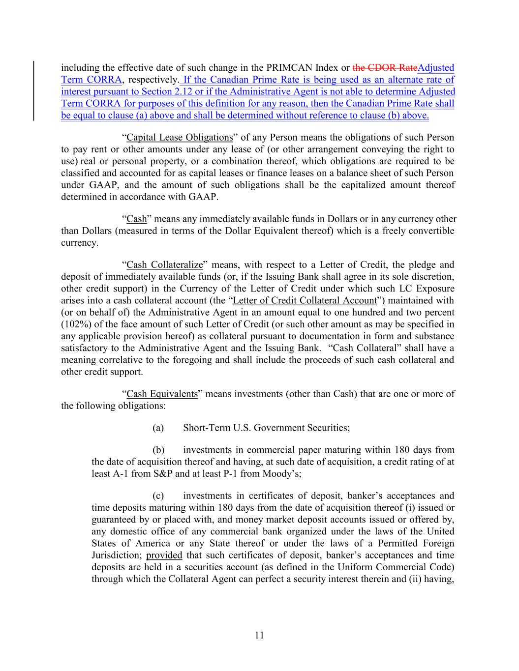 including the effective date of such change in the PRIMCAN Index or the CDOR RateAdjusted Term CORRA, respectively. If the Canadian Prime Rate is being used as an alternate rate of interest pursuant to Section 2.12 or if the Administrative Agent is not able to determine Adjusted Term CORRA for purposes of this definition for any reason, then the Canadian Prime Rate shall be equal to clause (a) above and shall be determined without reference to clause (b) above. “Capital Lease Obligations” of any Person means the obligations of such Person to pay rent or other amounts under any lease of (or other arrangement conveying the right to use) real or personal property, or a combination thereof, which obligations are required to be classified and accounted for as capital leases or finance leases on a balance sheet of such Person under GAAP, and the amount of such obligations shall be the capitalized amount thereof determined in accordance with GAAP. “Cash” means any immediately available funds in Dollars or in any currency other than Dollars (measured in terms of the Dollar Equivalent thereof) which is a freely convertible currency. “Cash Collateralize” means, with respect to a Letter of Credit, the pledge and deposit of immediately available funds (or, if the Issuing Bank shall agree in its sole discretion, other credit support) in the Currency of the Letter of Credit under which such LC Exposure arises into a cash collateral account (the “Letter of Credit Collateral Account”) maintained with (or on behalf of) the Administrative Agent in an amount equal to one hundred and two percent (102%) of the face amount of such Letter of Credit (or such other amount as may be specified in any applicable provision hereof) as collateral pursuant to documentation in form and substance satisfactory to the Administrative Agent and the Issuing Bank. “Cash Collateral” shall have a meaning correlative to the foregoing and shall include the proceeds of such cash collateral and other credit support. “Cash Equivalents” means investments (other than Cash) that are one or more of the following obligations: (a) Short-Term U.S. Government Securities; (b) investments in commercial paper maturing within 180 days from the date of acquisition thereof and having, at such date of acquisition, a credit rating of at least A-1 from S&P and at least P-1 from Moody’s; (c) investments in certificates of deposit, banker’s acceptances and time deposits maturing within 180 days from the date of acquisition thereof (i) issued or guaranteed by or placed with, and money market deposit accounts issued or offered by, any domestic office of any commercial bank organized under the laws of the United States of America or any State thereof or under the laws of a Permitted Foreign Jurisdiction; provided that such certificates of deposit, banker’s acceptances and time deposits are held in a securities account (as defined in the Uniform Commercial Code) through which the Collateral Agent can perfect a security interest therein and (ii) having, 11