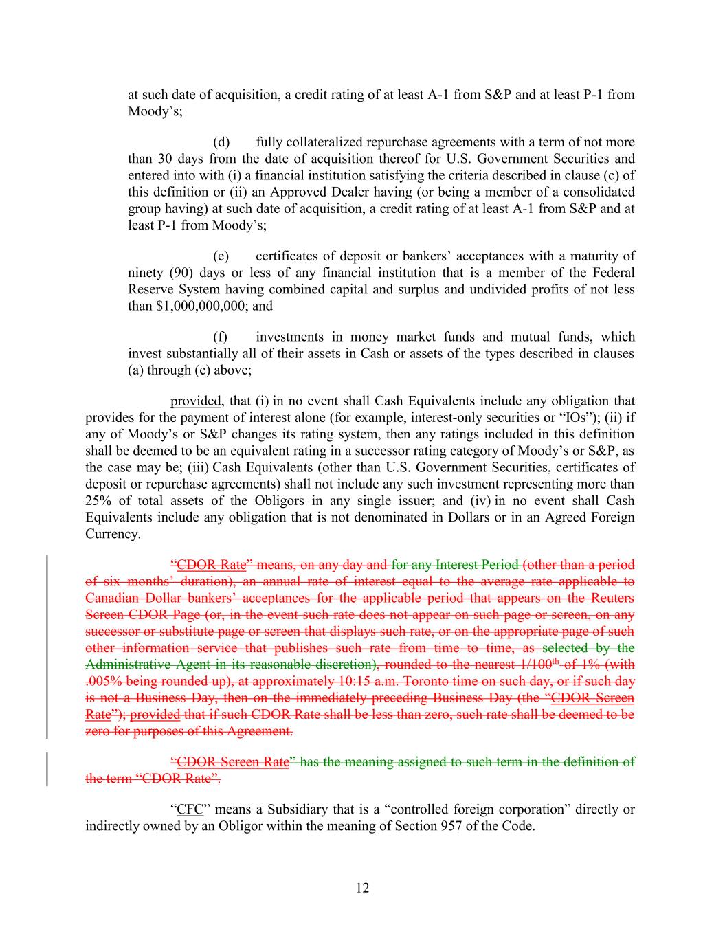at such date of acquisition, a credit rating of at least A-1 from S&P and at least P-1 from Moody’s; (d) fully collateralized repurchase agreements with a term of not more than 30 days from the date of acquisition thereof for U.S. Government Securities and entered into with (i) a financial institution satisfying the criteria described in clause (c) of this definition or (ii) an Approved Dealer having (or being a member of a consolidated group having) at such date of acquisition, a credit rating of at least A-1 from S&P and at least P-1 from Moody’s; (e) certificates of deposit or bankers’ acceptances with a maturity of ninety (90) days or less of any financial institution that is a member of the Federal Reserve System having combined capital and surplus and undivided profits of not less than $1,000,000,000; and (f) investments in money market funds and mutual funds, which invest substantially all of their assets in Cash or assets of the types described in clauses (a) through (e) above; provided, that (i) in no event shall Cash Equivalents include any obligation that provides for the payment of interest alone (for example, interest-only securities or “IOs”); (ii) if any of Moody’s or S&P changes its rating system, then any ratings included in this definition shall be deemed to be an equivalent rating in a successor rating category of Moody’s or S&P, as the case may be; (iii) Cash Equivalents (other than U.S. Government Securities, certificates of deposit or repurchase agreements) shall not include any such investment representing more than 25% of total assets of the Obligors in any single issuer; and (iv) in no event shall Cash Equivalents include any obligation that is not denominated in Dollars or in an Agreed Foreign Currency. “CDOR Rate” means, on any day and for any Interest Period (other than a period of six months’ duration), an annual rate of interest equal to the average rate applicable to Canadian Dollar bankers’ acceptances for the applicable period that appears on the Reuters Screen CDOR Page (or, in the event such rate does not appear on such page or screen, on any successor or substitute page or screen that displays such rate, or on the appropriate page of such other information service that publishes such rate from time to time, as selected by the Administrative Agent in its reasonable discretion), rounded to the nearest 1/100th of 1% (with .005% being rounded up), at approximately 10:15 a.m. Toronto time on such day, or if such day is not a Business Day, then on the immediately preceding Business Day (the “CDOR Screen Rate”); provided that if such CDOR Rate shall be less than zero, such rate shall be deemed to be zero for purposes of this Agreement. “CDOR Screen Rate” has the meaning assigned to such term in the definition of the term “CDOR Rate”. “CFC” means a Subsidiary that is a “controlled foreign corporation” directly or indirectly owned by an Obligor within the meaning of Section 957 of the Code. 12