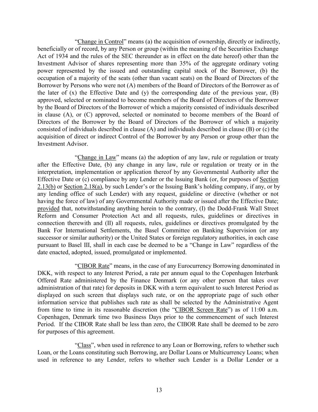 “Change in Control” means (a) the acquisition of ownership, directly or indirectly, beneficially or of record, by any Person or group (within the meaning of the Securities Exchange Act of 1934 and the rules of the SEC thereunder as in effect on the date hereof) other than the Investment Advisor of shares representing more than 35% of the aggregate ordinary voting power represented by the issued and outstanding capital stock of the Borrower, (b) the occupation of a majority of the seats (other than vacant seats) on the Board of Directors of the Borrower by Persons who were not (A) members of the Board of Directors of the Borrower as of the later of (x) the Effective Date and (y) the corresponding date of the previous year, (B) approved, selected or nominated to become members of the Board of Directors of the Borrower by the Board of Directors of the Borrower of which a majority consisted of individuals described in clause (A), or (C) approved, selected or nominated to become members of the Board of Directors of the Borrower by the Board of Directors of the Borrower of which a majority consisted of individuals described in clause (A) and individuals described in clause (B) or (c) the acquisition of direct or indirect Control of the Borrower by any Person or group other than the Investment Advisor. “Change in Law” means (a) the adoption of any law, rule or regulation or treaty after the Effective Date, (b) any change in any law, rule or regulation or treaty or in the interpretation, implementation or application thereof by any Governmental Authority after the Effective Date or (c) compliance by any Lender or the Issuing Bank (or, for purposes of Section 2.13(b) or Section 2.18(a), by such Lender’s or the Issuing Bank’s holding company, if any, or by any lending office of such Lender) with any request, guideline or directive (whether or not having the force of law) of any Governmental Authority made or issued after the Effective Date; provided that, notwithstanding anything herein to the contrary, (I) the Dodd-Frank Wall Street Reform and Consumer Protection Act and all requests, rules, guidelines or directives in connection therewith and (II) all requests, rules, guidelines or directives promulgated by the Bank For International Settlements, the Basel Committee on Banking Supervision (or any successor or similar authority) or the United States or foreign regulatory authorities, in each case pursuant to Basel III, shall in each case be deemed to be a “Change in Law” regardless of the date enacted, adopted, issued, promulgated or implemented. “CIBOR Rate” means, in the case of any Eurocurrency Borrowing denominated in DKK, with respect to any Interest Period, a rate per annum equal to the Copenhagen Interbank Offered Rate administered by the Finance Denmark (or any other person that takes over administration of that rate) for deposits in DKK with a term equivalent to such Interest Period as displayed on such screen that displays such rate, or on the appropriate page of such other information service that publishes such rate as shall be selected by the Administrative Agent from time to time in its reasonable discretion (the “CIBOR Screen Rate”) as of 11:00 a.m. Copenhagen, Denmark time two Business Days prior to the commencement of such Interest Period. If the CIBOR Rate shall be less than zero, the CIBOR Rate shall be deemed to be zero for purposes of this agreement. “Class”, when used in reference to any Loan or Borrowing, refers to whether such Loan, or the Loans constituting such Borrowing, are Dollar Loans or Multicurrency Loans; when used in reference to any Lender, refers to whether such Lender is a Dollar Lender or a 13