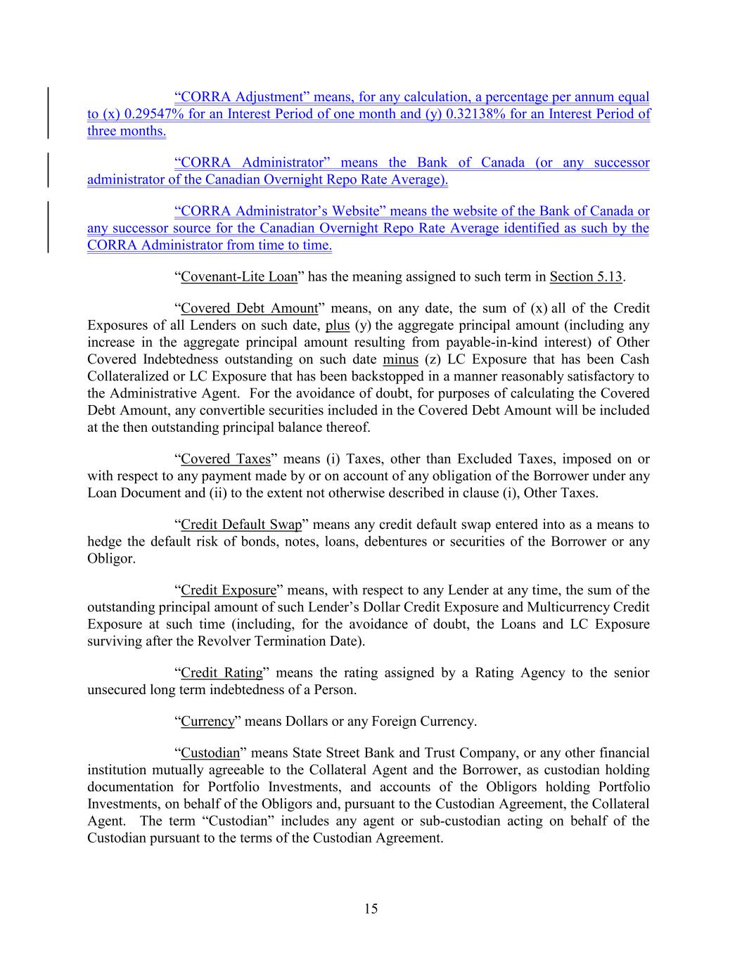 “CORRA Adjustment” means, for any calculation, a percentage per annum equal to (x) 0.29547% for an Interest Period of one month and (y) 0.32138% for an Interest Period of three months. “CORRA Administrator” means the Bank of Canada (or any successor administrator of the Canadian Overnight Repo Rate Average). “CORRA Administrator’s Website” means the website of the Bank of Canada or any successor source for the Canadian Overnight Repo Rate Average identified as such by the CORRA Administrator from time to time. “Covenant-Lite Loan” has the meaning assigned to such term in Section 5.13. “Covered Debt Amount” means, on any date, the sum of (x) all of the Credit Exposures of all Lenders on such date, plus (y) the aggregate principal amount (including any increase in the aggregate principal amount resulting from payable-in-kind interest) of Other Covered Indebtedness outstanding on such date minus (z) LC Exposure that has been Cash Collateralized or LC Exposure that has been backstopped in a manner reasonably satisfactory to the Administrative Agent. For the avoidance of doubt, for purposes of calculating the Covered Debt Amount, any convertible securities included in the Covered Debt Amount will be included at the then outstanding principal balance thereof. “Covered Taxes” means (i) Taxes, other than Excluded Taxes, imposed on or with respect to any payment made by or on account of any obligation of the Borrower under any Loan Document and (ii) to the extent not otherwise described in clause (i), Other Taxes. “Credit Default Swap” means any credit default swap entered into as a means to hedge the default risk of bonds, notes, loans, debentures or securities of the Borrower or any Obligor. “Credit Exposure” means, with respect to any Lender at any time, the sum of the outstanding principal amount of such Lender’s Dollar Credit Exposure and Multicurrency Credit Exposure at such time (including, for the avoidance of doubt, the Loans and LC Exposure surviving after the Revolver Termination Date). “Credit Rating” means the rating assigned by a Rating Agency to the senior unsecured long term indebtedness of a Person. “Currency” means Dollars or any Foreign Currency. “Custodian” means State Street Bank and Trust Company, or any other financial institution mutually agreeable to the Collateral Agent and the Borrower, as custodian holding documentation for Portfolio Investments, and accounts of the Obligors holding Portfolio Investments, on behalf of the Obligors and, pursuant to the Custodian Agreement, the Collateral Agent. The term “Custodian” includes any agent or sub-custodian acting on behalf of the Custodian pursuant to the terms of the Custodian Agreement. 15