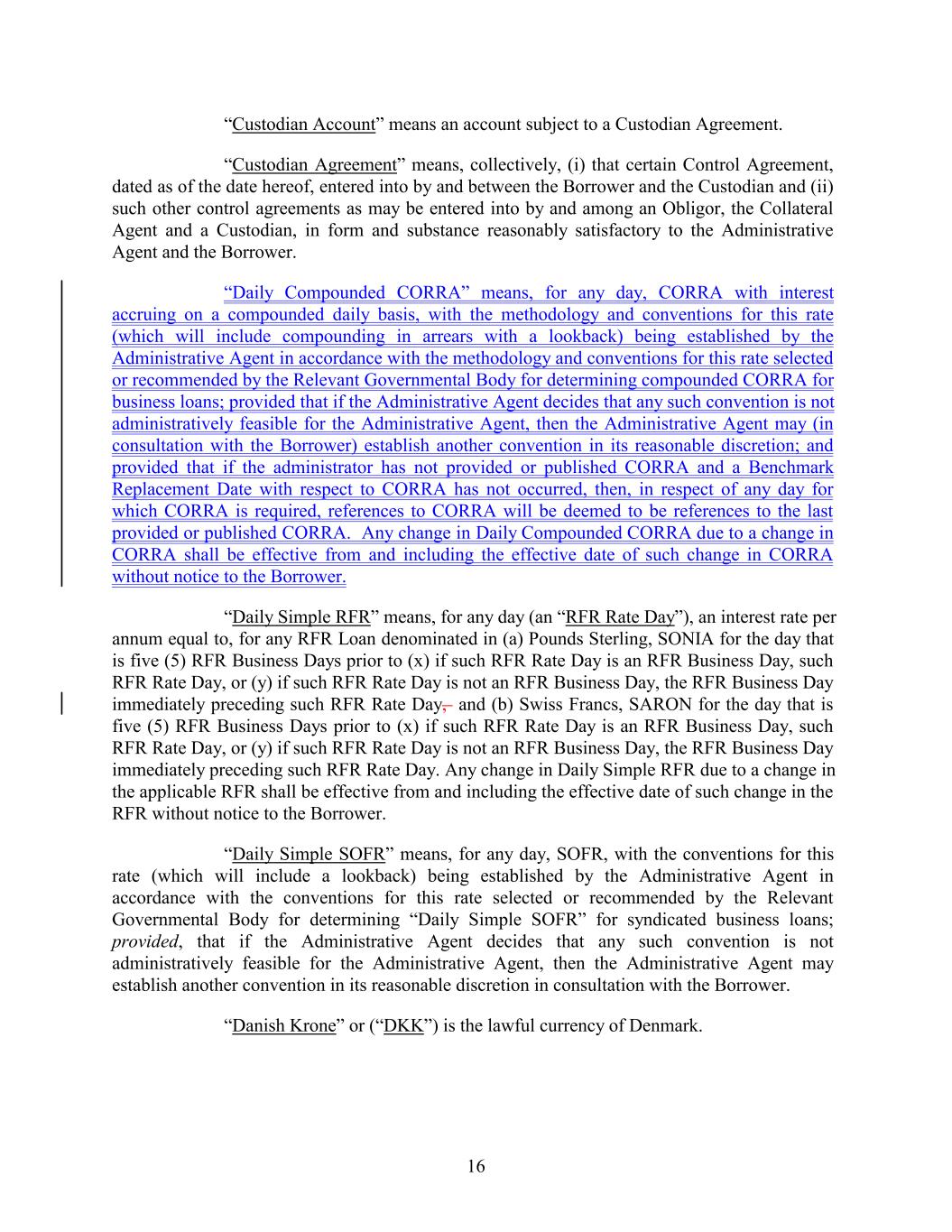 “Custodian Account” means an account subject to a Custodian Agreement. “Custodian Agreement” means, collectively, (i) that certain Control Agreement, dated as of the date hereof, entered into by and between the Borrower and the Custodian and (ii) such other control agreements as may be entered into by and among an Obligor, the Collateral Agent and a Custodian, in form and substance reasonably satisfactory to the Administrative Agent and the Borrower. “Daily Compounded CORRA” means, for any day, CORRA with interest accruing on a compounded daily basis, with the methodology and conventions for this rate (which will include compounding in arrears with a lookback) being established by the Administrative Agent in accordance with the methodology and conventions for this rate selected or recommended by the Relevant Governmental Body for determining compounded CORRA for business loans; provided that if the Administrative Agent decides that any such convention is not administratively feasible for the Administrative Agent, then the Administrative Agent may (in consultation with the Borrower) establish another convention in its reasonable discretion; and provided that if the administrator has not provided or published CORRA and a Benchmark Replacement Date with respect to CORRA has not occurred, then, in respect of any day for which CORRA is required, references to CORRA will be deemed to be references to the last provided or published CORRA. Any change in Daily Compounded CORRA due to a change in CORRA shall be effective from and including the effective date of such change in CORRA without notice to the Borrower. “Daily Simple RFR” means, for any day (an “RFR Rate Day”), an interest rate per annum equal to, for any RFR Loan denominated in (a) Pounds Sterling, SONIA for the day that is five (5) RFR Business Days prior to (x) if such RFR Rate Day is an RFR Business Day, such RFR Rate Day, or (y) if such RFR Rate Day is not an RFR Business Day, the RFR Business Day immediately preceding such RFR Rate Day, and (b) Swiss Francs, SARON for the day that is five (5) RFR Business Days prior to (x) if such RFR Rate Day is an RFR Business Day, such RFR Rate Day, or (y) if such RFR Rate Day is not an RFR Business Day, the RFR Business Day immediately preceding such RFR Rate Day. Any change in Daily Simple RFR due to a change in the applicable RFR shall be effective from and including the effective date of such change in the RFR without notice to the Borrower. “Daily Simple SOFR” means, for any day, SOFR, with the conventions for this rate (which will include a lookback) being established by the Administrative Agent in accordance with the conventions for this rate selected or recommended by the Relevant Governmental Body for determining “Daily Simple SOFR” for syndicated business loans; provided, that if the Administrative Agent decides that any such convention is not administratively feasible for the Administrative Agent, then the Administrative Agent may establish another convention in its reasonable discretion in consultation with the Borrower. “Danish Krone” or (“DKK”) is the lawful currency of Denmark. 16