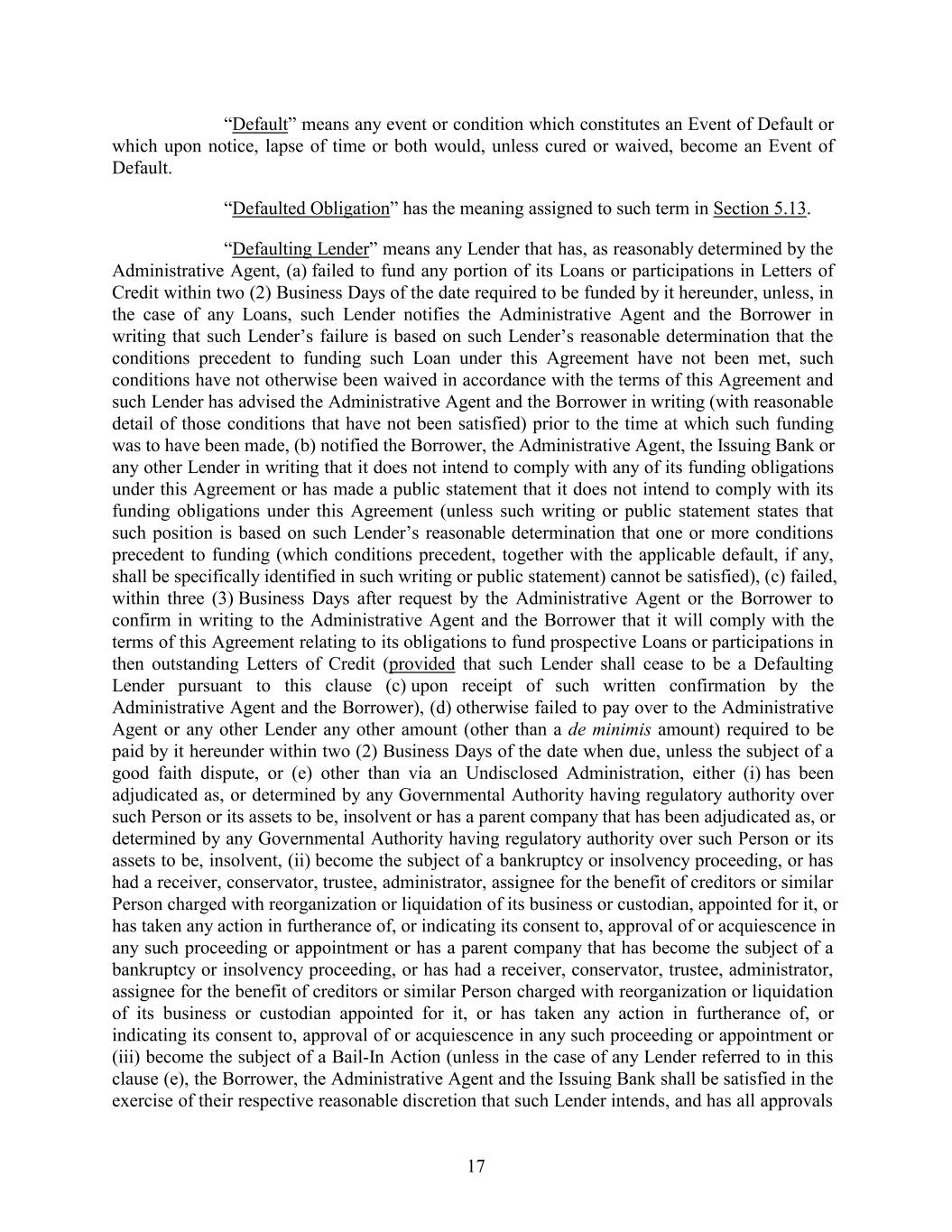 “Default” means any event or condition which constitutes an Event of Default or which upon notice, lapse of time or both would, unless cured or waived, become an Event of Default. “Defaulted Obligation” has the meaning assigned to such term in Section 5.13. “Defaulting Lender” means any Lender that has, as reasonably determined by the Administrative Agent, (a) failed to fund any portion of its Loans or participations in Letters of Credit within two (2) Business Days of the date required to be funded by it hereunder, unless, in the case of any Loans, such Lender notifies the Administrative Agent and the Borrower in writing that such Lender’s failure is based on such Lender’s reasonable determination that the conditions precedent to funding such Loan under this Agreement have not been met, such conditions have not otherwise been waived in accordance with the terms of this Agreement and such Lender has advised the Administrative Agent and the Borrower in writing (with reasonable detail of those conditions that have not been satisfied) prior to the time at which such funding was to have been made, (b) notified the Borrower, the Administrative Agent, the Issuing Bank or any other Lender in writing that it does not intend to comply with any of its funding obligations under this Agreement or has made a public statement that it does not intend to comply with its funding obligations under this Agreement (unless such writing or public statement states that such position is based on such Lender’s reasonable determination that one or more conditions precedent to funding (which conditions precedent, together with the applicable default, if any, shall be specifically identified in such writing or public statement) cannot be satisfied), (c) failed, within three (3) Business Days after request by the Administrative Agent or the Borrower to confirm in writing to the Administrative Agent and the Borrower that it will comply with the terms of this Agreement relating to its obligations to fund prospective Loans or participations in then outstanding Letters of Credit (provided that such Lender shall cease to be a Defaulting Lender pursuant to this clause (c) upon receipt of such written confirmation by the Administrative Agent and the Borrower), (d) otherwise failed to pay over to the Administrative Agent or any other Lender any other amount (other than a de minimis amount) required to be paid by it hereunder within two (2) Business Days of the date when due, unless the subject of a good faith dispute, or (e) other than via an Undisclosed Administration, either (i) has been adjudicated as, or determined by any Governmental Authority having regulatory authority over such Person or its assets to be, insolvent or has a parent company that has been adjudicated as, or determined by any Governmental Authority having regulatory authority over such Person or its assets to be, insolvent, (ii) become the subject of a bankruptcy or insolvency proceeding, or has had a receiver, conservator, trustee, administrator, assignee for the benefit of creditors or similar Person charged with reorganization or liquidation of its business or custodian, appointed for it, or has taken any action in furtherance of, or indicating its consent to, approval of or acquiescence in any such proceeding or appointment or has a parent company that has become the subject of a bankruptcy or insolvency proceeding, or has had a receiver, conservator, trustee, administrator, assignee for the benefit of creditors or similar Person charged with reorganization or liquidation of its business or custodian appointed for it, or has taken any action in furtherance of, or indicating its consent to, approval of or acquiescence in any such proceeding or appointment or (iii) become the subject of a Bail-In Action (unless in the case of any Lender referred to in this clause (e), the Borrower, the Administrative Agent and the Issuing Bank shall be satisfied in the exercise of their respective reasonable discretion that such Lender intends, and has all approvals 17