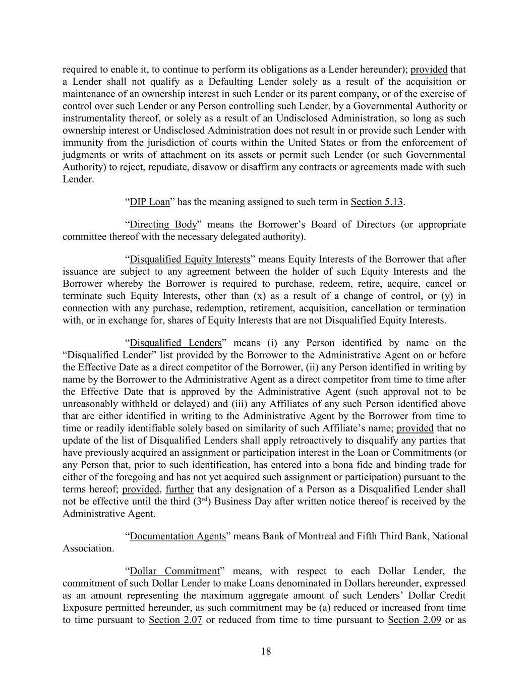 required to enable it, to continue to perform its obligations as a Lender hereunder); provided that a Lender shall not qualify as a Defaulting Lender solely as a result of the acquisition or maintenance of an ownership interest in such Lender or its parent company, or of the exercise of control over such Lender or any Person controlling such Lender, by a Governmental Authority or instrumentality thereof, or solely as a result of an Undisclosed Administration, so long as such ownership interest or Undisclosed Administration does not result in or provide such Lender with immunity from the jurisdiction of courts within the United States or from the enforcement of judgments or writs of attachment on its assets or permit such Lender (or such Governmental Authority) to reject, repudiate, disavow or disaffirm any contracts or agreements made with such Lender. “DIP Loan” has the meaning assigned to such term in Section 5.13. “Directing Body” means the Borrower’s Board of Directors (or appropriate committee thereof with the necessary delegated authority). “Disqualified Equity Interests” means Equity Interests of the Borrower that after issuance are subject to any agreement between the holder of such Equity Interests and the Borrower whereby the Borrower is required to purchase, redeem, retire, acquire, cancel or terminate such Equity Interests, other than (x) as a result of a change of control, or (y) in connection with any purchase, redemption, retirement, acquisition, cancellation or termination with, or in exchange for, shares of Equity Interests that are not Disqualified Equity Interests. “Disqualified Lenders” means (i) any Person identified by name on the “Disqualified Lender” list provided by the Borrower to the Administrative Agent on or before the Effective Date as a direct competitor of the Borrower, (ii) any Person identified in writing by name by the Borrower to the Administrative Agent as a direct competitor from time to time after the Effective Date that is approved by the Administrative Agent (such approval not to be unreasonably withheld or delayed) and (iii) any Affiliates of any such Person identified above that are either identified in writing to the Administrative Agent by the Borrower from time to time or readily identifiable solely based on similarity of such Affiliate’s name; provided that no update of the list of Disqualified Lenders shall apply retroactively to disqualify any parties that have previously acquired an assignment or participation interest in the Loan or Commitments (or any Person that, prior to such identification, has entered into a bona fide and binding trade for either of the foregoing and has not yet acquired such assignment or participation) pursuant to the terms hereof; provided, further that any designation of a Person as a Disqualified Lender shall not be effective until the third (3rd) Business Day after written notice thereof is received by the Administrative Agent. “Documentation Agents” means Bank of Montreal and Fifth Third Bank, National Association. “Dollar Commitment” means, with respect to each Dollar Lender, the commitment of such Dollar Lender to make Loans denominated in Dollars hereunder, expressed as an amount representing the maximum aggregate amount of such Lenders’ Dollar Credit Exposure permitted hereunder, as such commitment may be (a) reduced or increased from time to time pursuant to Section 2.07 or reduced from time to time pursuant to Section 2.09 or as 18