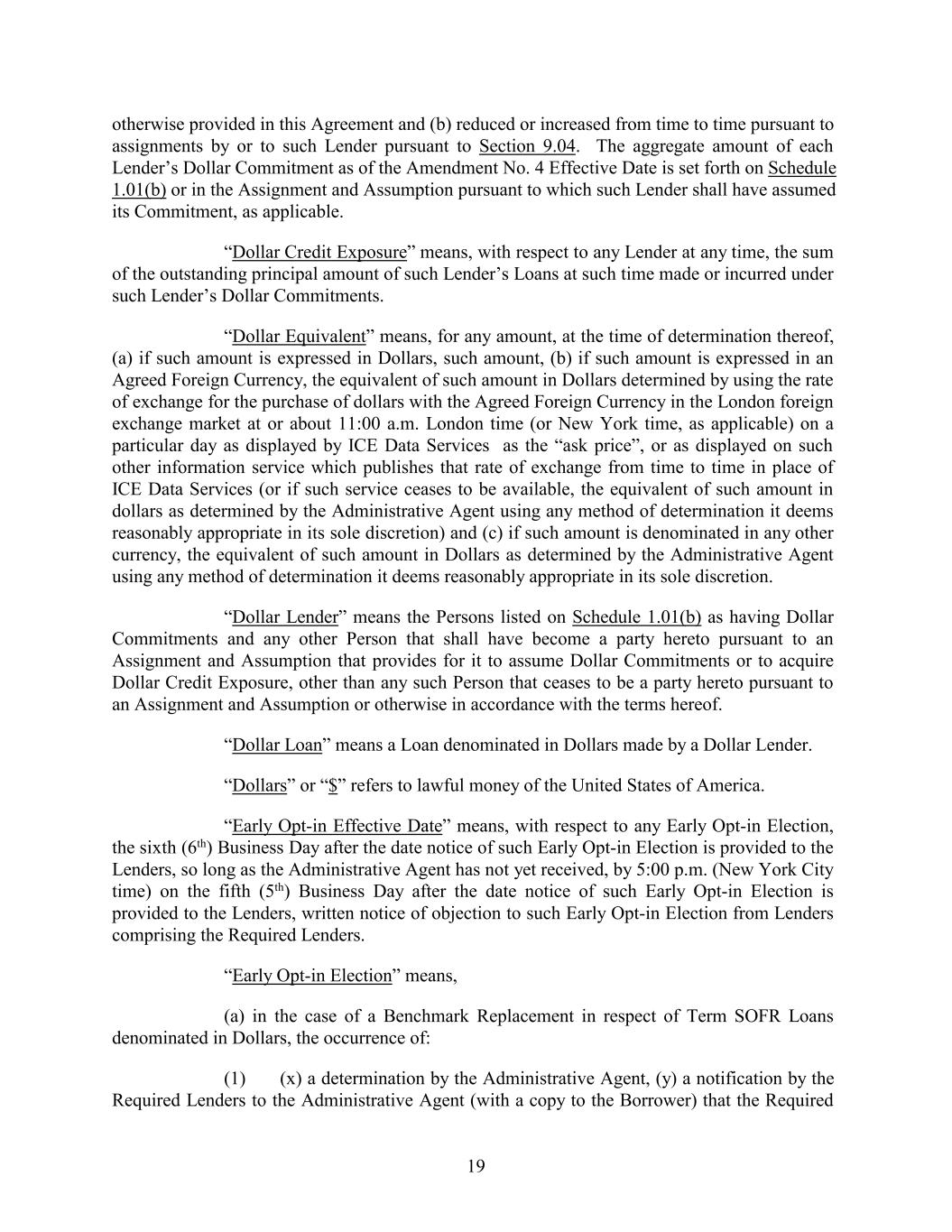 otherwise provided in this Agreement and (b) reduced or increased from time to time pursuant to assignments by or to such Lender pursuant to Section 9.04. The aggregate amount of each Lender’s Dollar Commitment as of the Amendment No. 4 Effective Date is set forth on Schedule 1.01(b) or in the Assignment and Assumption pursuant to which such Lender shall have assumed its Commitment, as applicable. “Dollar Credit Exposure” means, with respect to any Lender at any time, the sum of the outstanding principal amount of such Lender’s Loans at such time made or incurred under such Lender’s Dollar Commitments. “Dollar Equivalent” means, for any amount, at the time of determination thereof, (a) if such amount is expressed in Dollars, such amount, (b) if such amount is expressed in an Agreed Foreign Currency, the equivalent of such amount in Dollars determined by using the rate of exchange for the purchase of dollars with the Agreed Foreign Currency in the London foreign exchange market at or about 11:00 a.m. London time (or New York time, as applicable) on a particular day as displayed by ICE Data Services as the “ask price”, or as displayed on such other information service which publishes that rate of exchange from time to time in place of ICE Data Services (or if such service ceases to be available, the equivalent of such amount in dollars as determined by the Administrative Agent using any method of determination it deems reasonably appropriate in its sole discretion) and (c) if such amount is denominated in any other currency, the equivalent of such amount in Dollars as determined by the Administrative Agent using any method of determination it deems reasonably appropriate in its sole discretion. “Dollar Lender” means the Persons listed on Schedule 1.01(b) as having Dollar Commitments and any other Person that shall have become a party hereto pursuant to an Assignment and Assumption that provides for it to assume Dollar Commitments or to acquire Dollar Credit Exposure, other than any such Person that ceases to be a party hereto pursuant to an Assignment and Assumption or otherwise in accordance with the terms hereof. “Dollar Loan” means a Loan denominated in Dollars made by a Dollar Lender. “Dollars” or “$” refers to lawful money of the United States of America. “Early Opt-in Effective Date” means, with respect to any Early Opt-in Election, the sixth (6th) Business Day after the date notice of such Early Opt-in Election is provided to the Lenders, so long as the Administrative Agent has not yet received, by 5:00 p.m. (New York City time) on the fifth (5th) Business Day after the date notice of such Early Opt-in Election is provided to the Lenders, written notice of objection to such Early Opt-in Election from Lenders comprising the Required Lenders. “Early Opt-in Election” means, (a) in the case of a Benchmark Replacement in respect of Term SOFR Loans denominated in Dollars, the occurrence of: (1) (x) a determination by the Administrative Agent, (y) a notification by the Required Lenders to the Administrative Agent (with a copy to the Borrower) that the Required 19