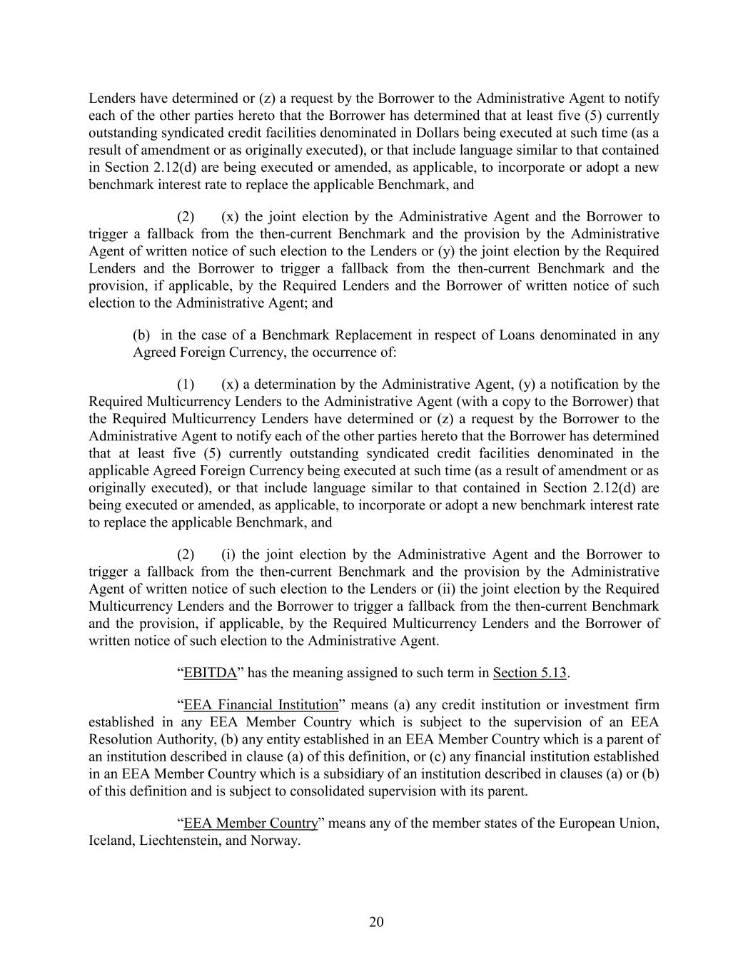 Lenders have determined or (z) a request by the Borrower to the Administrative Agent to notify each of the other parties hereto that the Borrower has determined that at least five (5) currently outstanding syndicated credit facilities denominated in Dollars being executed at such time (as a result of amendment or as originally executed), or that include language similar to that contained in Section 2.12(d) are being executed or amended, as applicable, to incorporate or adopt a new benchmark interest rate to replace the applicable Benchmark, and (2) (x) the joint election by the Administrative Agent and the Borrower to trigger a fallback from the then-current Benchmark and the provision by the Administrative Agent of written notice of such election to the Lenders or (y) the joint election by the Required Lenders and the Borrower to trigger a fallback from the then-current Benchmark and the provision, if applicable, by the Required Lenders and the Borrower of written notice of such election to the Administrative Agent; and (b) in the case of a Benchmark Replacement in respect of Loans denominated in any Agreed Foreign Currency, the occurrence of: (1) (x) a determination by the Administrative Agent, (y) a notification by the Required Multicurrency Lenders to the Administrative Agent (with a copy to the Borrower) that the Required Multicurrency Lenders have determined or (z) a request by the Borrower to the Administrative Agent to notify each of the other parties hereto that the Borrower has determined that at least five (5) currently outstanding syndicated credit facilities denominated in the applicable Agreed Foreign Currency being executed at such time (as a result of amendment or as originally executed), or that include language similar to that contained in Section 2.12(d) are being executed or amended, as applicable, to incorporate or adopt a new benchmark interest rate to replace the applicable Benchmark, and (2) (i) the joint election by the Administrative Agent and the Borrower to trigger a fallback from the then-current Benchmark and the provision by the Administrative Agent of written notice of such election to the Lenders or (ii) the joint election by the Required Multicurrency Lenders and the Borrower to trigger a fallback from the then-current Benchmark and the provision, if applicable, by the Required Multicurrency Lenders and the Borrower of written notice of such election to the Administrative Agent. “EBITDA” has the meaning assigned to such term in Section 5.13. “EEA Financial Institution” means (a) any credit institution or investment firm established in any EEA Member Country which is subject to the supervision of an EEA Resolution Authority, (b) any entity established in an EEA Member Country which is a parent of an institution described in clause (a) of this definition, or (c) any financial institution established in an EEA Member Country which is a subsidiary of an institution described in clauses (a) or (b) of this definition and is subject to consolidated supervision with its parent. “EEA Member Country” means any of the member states of the European Union, Iceland, Liechtenstein, and Norway. 20