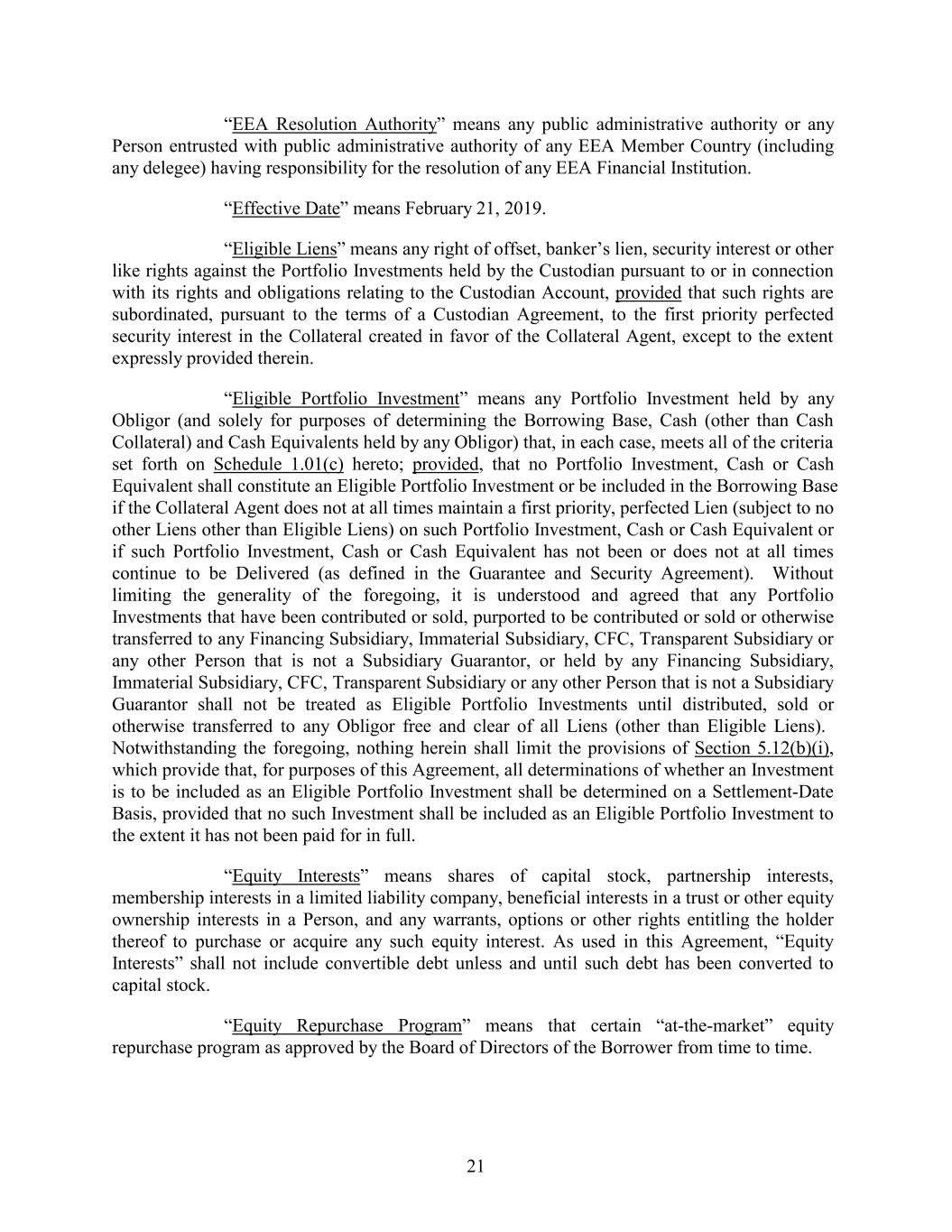 “EEA Resolution Authority” means any public administrative authority or any Person entrusted with public administrative authority of any EEA Member Country (including any delegee) having responsibility for the resolution of any EEA Financial Institution. “Effective Date” means February 21, 2019. “Eligible Liens” means any right of offset, banker’s lien, security interest or other like rights against the Portfolio Investments held by the Custodian pursuant to or in connection with its rights and obligations relating to the Custodian Account, provided that such rights are subordinated, pursuant to the terms of a Custodian Agreement, to the first priority perfected security interest in the Collateral created in favor of the Collateral Agent, except to the extent expressly provided therein. “Eligible Portfolio Investment” means any Portfolio Investment held by any Obligor (and solely for purposes of determining the Borrowing Base, Cash (other than Cash Collateral) and Cash Equivalents held by any Obligor) that, in each case, meets all of the criteria set forth on Schedule 1.01(c) hereto; provided, that no Portfolio Investment, Cash or Cash Equivalent shall constitute an Eligible Portfolio Investment or be included in the Borrowing Base if the Collateral Agent does not at all times maintain a first priority, perfected Lien (subject to no other Liens other than Eligible Liens) on such Portfolio Investment, Cash or Cash Equivalent or if such Portfolio Investment, Cash or Cash Equivalent has not been or does not at all times continue to be Delivered (as defined in the Guarantee and Security Agreement). Without limiting the generality of the foregoing, it is understood and agreed that any Portfolio Investments that have been contributed or sold, purported to be contributed or sold or otherwise transferred to any Financing Subsidiary, Immaterial Subsidiary, CFC, Transparent Subsidiary or any other Person that is not a Subsidiary Guarantor, or held by any Financing Subsidiary, Immaterial Subsidiary, CFC, Transparent Subsidiary or any other Person that is not a Subsidiary Guarantor shall not be treated as Eligible Portfolio Investments until distributed, sold or otherwise transferred to any Obligor free and clear of all Liens (other than Eligible Liens). Notwithstanding the foregoing, nothing herein shall limit the provisions of Section 5.12(b)(i), which provide that, for purposes of this Agreement, all determinations of whether an Investment is to be included as an Eligible Portfolio Investment shall be determined on a Settlement-Date Basis, provided that no such Investment shall be included as an Eligible Portfolio Investment to the extent it has not been paid for in full. “Equity Interests” means shares of capital stock, partnership interests, membership interests in a limited liability company, beneficial interests in a trust or other equity ownership interests in a Person, and any warrants, options or other rights entitling the holder thereof to purchase or acquire any such equity interest. As used in this Agreement, “Equity Interests” shall not include convertible debt unless and until such debt has been converted to capital stock. “Equity Repurchase Program” means that certain “at-the-market” equity repurchase program as approved by the Board of Directors of the Borrower from time to time. 21