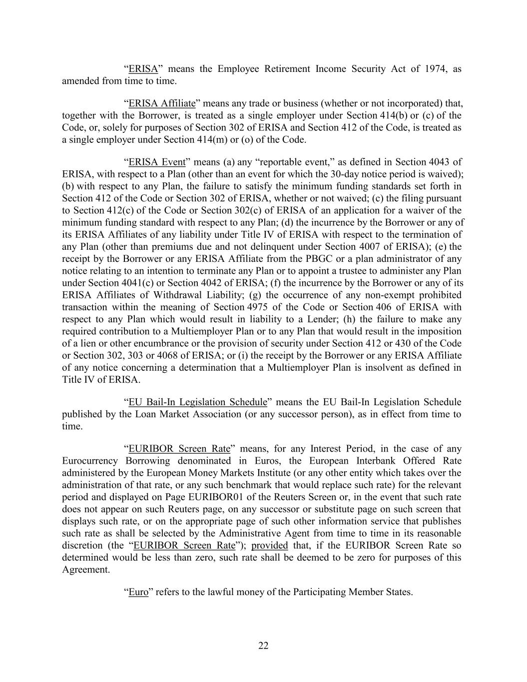 “ERISA” means the Employee Retirement Income Security Act of 1974, as amended from time to time. “ERISA Affiliate” means any trade or business (whether or not incorporated) that, together with the Borrower, is treated as a single employer under Section 414(b) or (c) of the Code, or, solely for purposes of Section 302 of ERISA and Section 412 of the Code, is treated as a single employer under Section 414(m) or (o) of the Code. “ERISA Event” means (a) any “reportable event,” as defined in Section 4043 of ERISA, with respect to a Plan (other than an event for which the 30-day notice period is waived); (b) with respect to any Plan, the failure to satisfy the minimum funding standards set forth in Section 412 of the Code or Section 302 of ERISA, whether or not waived; (c) the filing pursuant to Section 412(c) of the Code or Section 302(c) of ERISA of an application for a waiver of the minimum funding standard with respect to any Plan; (d) the incurrence by the Borrower or any of its ERISA Affiliates of any liability under Title IV of ERISA with respect to the termination of any Plan (other than premiums due and not delinquent under Section 4007 of ERISA); (e) the receipt by the Borrower or any ERISA Affiliate from the PBGC or a plan administrator of any notice relating to an intention to terminate any Plan or to appoint a trustee to administer any Plan under Section 4041(c) or Section 4042 of ERISA; (f) the incurrence by the Borrower or any of its ERISA Affiliates of Withdrawal Liability; (g) the occurrence of any non-exempt prohibited transaction within the meaning of Section 4975 of the Code or Section 406 of ERISA with respect to any Plan which would result in liability to a Lender; (h) the failure to make any required contribution to a Multiemployer Plan or to any Plan that would result in the imposition of a lien or other encumbrance or the provision of security under Section 412 or 430 of the Code or Section 302, 303 or 4068 of ERISA; or (i) the receipt by the Borrower or any ERISA Affiliate of any notice concerning a determination that a Multiemployer Plan is insolvent as defined in Title IV of ERISA. “EU Bail-In Legislation Schedule” means the EU Bail-In Legislation Schedule published by the Loan Market Association (or any successor person), as in effect from time to time. “EURIBOR Screen Rate” means, for any Interest Period, in the case of any Eurocurrency Borrowing denominated in Euros, the European Interbank Offered Rate administered by the European Money Markets Institute (or any other entity which takes over the administration of that rate, or any such benchmark that would replace such rate) for the relevant period and displayed on Page EURIBOR01 of the Reuters Screen or, in the event that such rate does not appear on such Reuters page, on any successor or substitute page on such screen that displays such rate, or on the appropriate page of such other information service that publishes such rate as shall be selected by the Administrative Agent from time to time in its reasonable discretion (the “EURIBOR Screen Rate”); provided that, if the EURIBOR Screen Rate so determined would be less than zero, such rate shall be deemed to be zero for purposes of this Agreement. “Euro” refers to the lawful money of the Participating Member States. 22