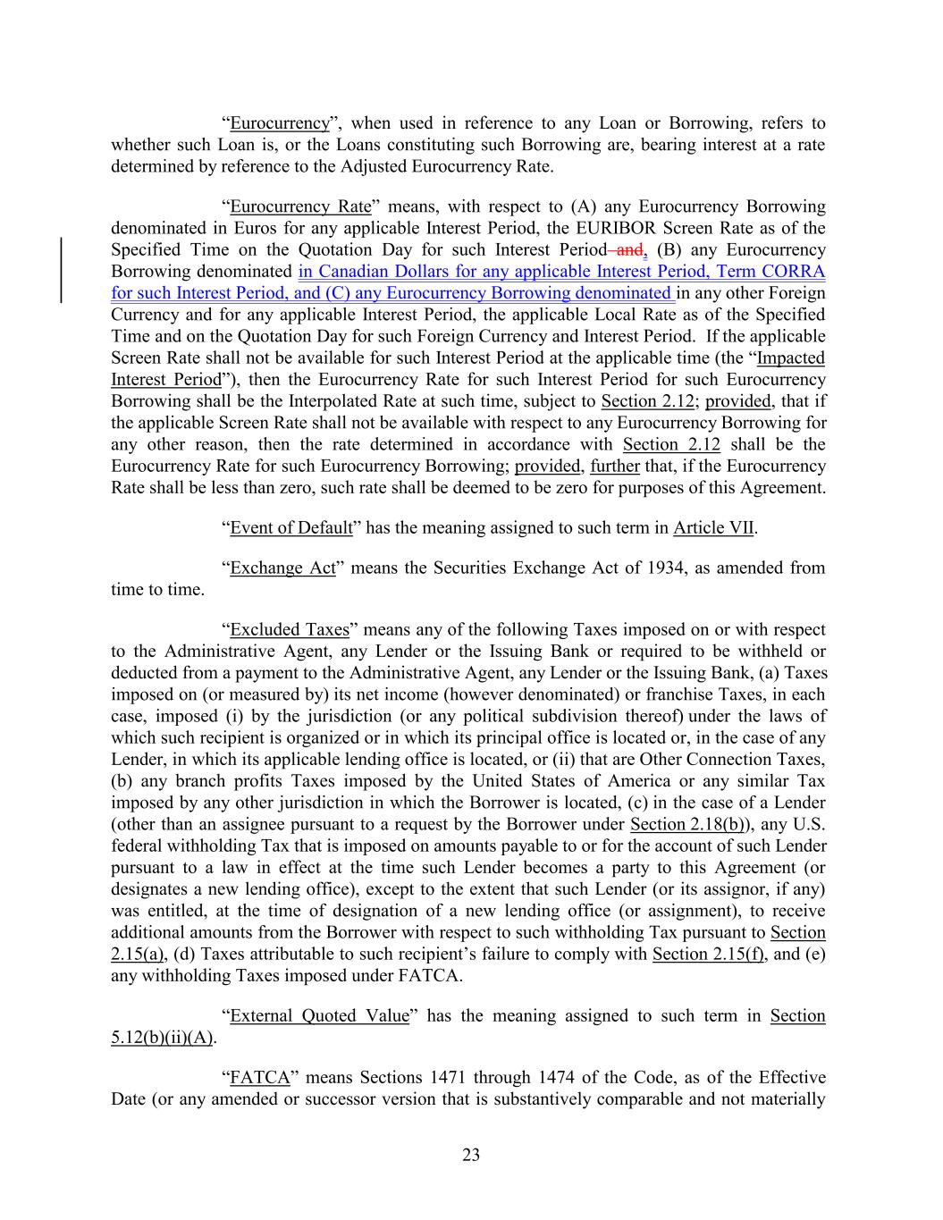 “Eurocurrency”, when used in reference to any Loan or Borrowing, refers to whether such Loan is, or the Loans constituting such Borrowing are, bearing interest at a rate determined by reference to the Adjusted Eurocurrency Rate. “Eurocurrency Rate” means, with respect to (A) any Eurocurrency Borrowing denominated in Euros for any applicable Interest Period, the EURIBOR Screen Rate as of the Specified Time on the Quotation Day for such Interest Period and, (B) any Eurocurrency Borrowing denominated in Canadian Dollars for any applicable Interest Period, Term CORRA for such Interest Period, and (C) any Eurocurrency Borrowing denominated in any other Foreign Currency and for any applicable Interest Period, the applicable Local Rate as of the Specified Time and on the Quotation Day for such Foreign Currency and Interest Period. If the applicable Screen Rate shall not be available for such Interest Period at the applicable time (the “Impacted Interest Period”), then the Eurocurrency Rate for such Interest Period for such Eurocurrency Borrowing shall be the Interpolated Rate at such time, subject to Section 2.12; provided, that if the applicable Screen Rate shall not be available with respect to any Eurocurrency Borrowing for any other reason, then the rate determined in accordance with Section 2.12 shall be the Eurocurrency Rate for such Eurocurrency Borrowing; provided, further that, if the Eurocurrency Rate shall be less than zero, such rate shall be deemed to be zero for purposes of this Agreement. “Event of Default” has the meaning assigned to such term in Article VII. “Exchange Act” means the Securities Exchange Act of 1934, as amended from time to time. “Excluded Taxes” means any of the following Taxes imposed on or with respect to the Administrative Agent, any Lender or the Issuing Bank or required to be withheld or deducted from a payment to the Administrative Agent, any Lender or the Issuing Bank, (a) Taxes imposed on (or measured by) its net income (however denominated) or franchise Taxes, in each case, imposed (i) by the jurisdiction (or any political subdivision thereof) under the laws of which such recipient is organized or in which its principal office is located or, in the case of any Lender, in which its applicable lending office is located, or (ii) that are Other Connection Taxes, (b) any branch profits Taxes imposed by the United States of America or any similar Tax imposed by any other jurisdiction in which the Borrower is located, (c) in the case of a Lender (other than an assignee pursuant to a request by the Borrower under Section 2.18(b)), any U.S. federal withholding Tax that is imposed on amounts payable to or for the account of such Lender pursuant to a law in effect at the time such Lender becomes a party to this Agreement (or designates a new lending office), except to the extent that such Lender (or its assignor, if any) was entitled, at the time of designation of a new lending office (or assignment), to receive additional amounts from the Borrower with respect to such withholding Tax pursuant to Section 2.15(a), (d) Taxes attributable to such recipient’s failure to comply with Section 2.15(f), and (e) any withholding Taxes imposed under FATCA. “External Quoted Value” has the meaning assigned to such term in Section 5.12(b)(ii)(A). “FATCA” means Sections 1471 through 1474 of the Code, as of the Effective Date (or any amended or successor version that is substantively comparable and not materially 23
