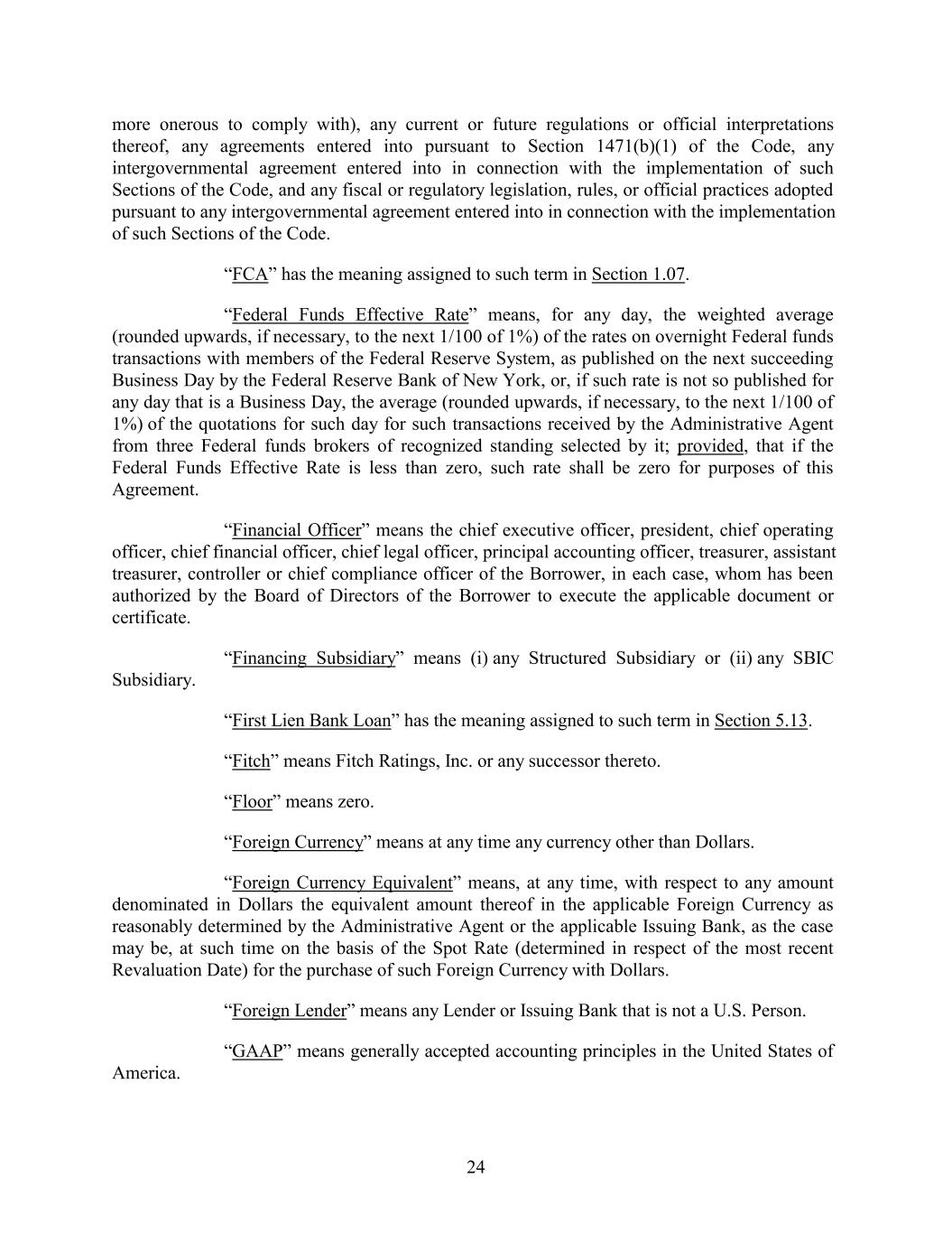 more onerous to comply with), any current or future regulations or official interpretations thereof, any agreements entered into pursuant to Section 1471(b)(1) of the Code, any intergovernmental agreement entered into in connection with the implementation of such Sections of the Code, and any fiscal or regulatory legislation, rules, or official practices adopted pursuant to any intergovernmental agreement entered into in connection with the implementation of such Sections of the Code. “FCA” has the meaning assigned to such term in Section 1.07. “Federal Funds Effective Rate” means, for any day, the weighted average (rounded upwards, if necessary, to the next 1/100 of 1%) of the rates on overnight Federal funds transactions with members of the Federal Reserve System, as published on the next succeeding Business Day by the Federal Reserve Bank of New York, or, if such rate is not so published for any day that is a Business Day, the average (rounded upwards, if necessary, to the next 1/100 of 1%) of the quotations for such day for such transactions received by the Administrative Agent from three Federal funds brokers of recognized standing selected by it; provided, that if the Federal Funds Effective Rate is less than zero, such rate shall be zero for purposes of this Agreement. “Financial Officer” means the chief executive officer, president, chief operating officer, chief financial officer, chief legal officer, principal accounting officer, treasurer, assistant treasurer, controller or chief compliance officer of the Borrower, in each case, whom has been authorized by the Board of Directors of the Borrower to execute the applicable document or certificate. “Financing Subsidiary” means (i) any Structured Subsidiary or (ii) any SBIC Subsidiary. “First Lien Bank Loan” has the meaning assigned to such term in Section 5.13. “Fitch” means Fitch Ratings, Inc. or any successor thereto. “Floor” means zero. “Foreign Currency” means at any time any currency other than Dollars. “Foreign Currency Equivalent” means, at any time, with respect to any amount denominated in Dollars the equivalent amount thereof in the applicable Foreign Currency as reasonably determined by the Administrative Agent or the applicable Issuing Bank, as the case may be, at such time on the basis of the Spot Rate (determined in respect of the most recent Revaluation Date) for the purchase of such Foreign Currency with Dollars. “Foreign Lender” means any Lender or Issuing Bank that is not a U.S. Person. “GAAP” means generally accepted accounting principles in the United States of America. 24