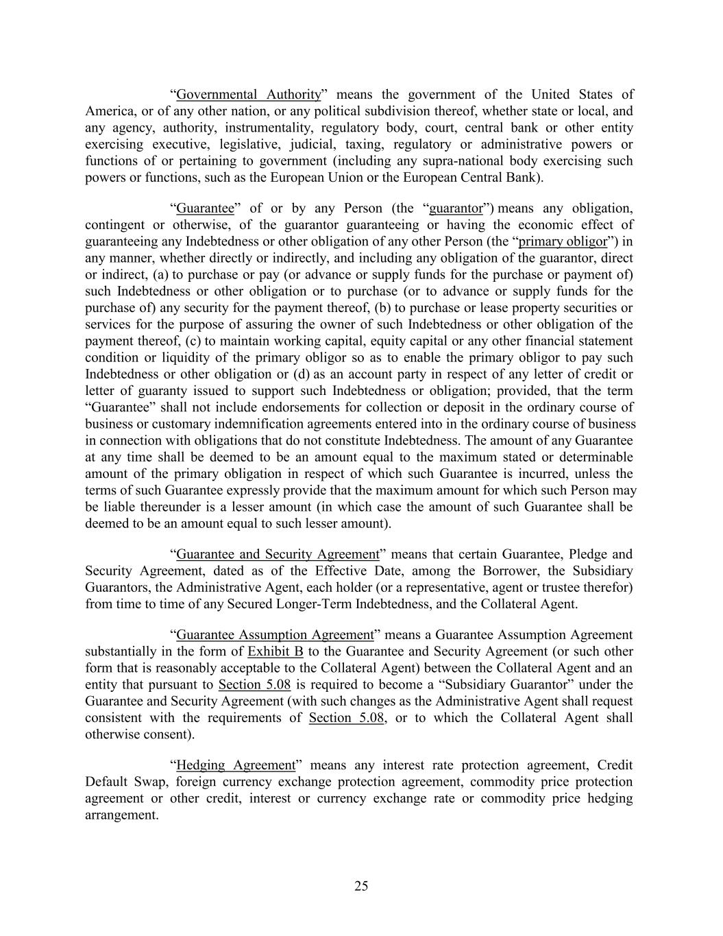 “Governmental Authority” means the government of the United States of America, or of any other nation, or any political subdivision thereof, whether state or local, and any agency, authority, instrumentality, regulatory body, court, central bank or other entity exercising executive, legislative, judicial, taxing, regulatory or administrative powers or functions of or pertaining to government (including any supra-national body exercising such powers or functions, such as the European Union or the European Central Bank). “Guarantee” of or by any Person (the “guarantor”) means any obligation, contingent or otherwise, of the guarantor guaranteeing or having the economic effect of guaranteeing any Indebtedness or other obligation of any other Person (the “primary obligor”) in any manner, whether directly or indirectly, and including any obligation of the guarantor, direct or indirect, (a) to purchase or pay (or advance or supply funds for the purchase or payment of) such Indebtedness or other obligation or to purchase (or to advance or supply funds for the purchase of) any security for the payment thereof, (b) to purchase or lease property securities or services for the purpose of assuring the owner of such Indebtedness or other obligation of the payment thereof, (c) to maintain working capital, equity capital or any other financial statement condition or liquidity of the primary obligor so as to enable the primary obligor to pay such Indebtedness or other obligation or (d) as an account party in respect of any letter of credit or letter of guaranty issued to support such Indebtedness or obligation; provided, that the term “Guarantee” shall not include endorsements for collection or deposit in the ordinary course of business or customary indemnification agreements entered into in the ordinary course of business in connection with obligations that do not constitute Indebtedness. The amount of any Guarantee at any time shall be deemed to be an amount equal to the maximum stated or determinable amount of the primary obligation in respect of which such Guarantee is incurred, unless the terms of such Guarantee expressly provide that the maximum amount for which such Person may be liable thereunder is a lesser amount (in which case the amount of such Guarantee shall be deemed to be an amount equal to such lesser amount). “Guarantee and Security Agreement” means that certain Guarantee, Pledge and Security Agreement, dated as of the Effective Date, among the Borrower, the Subsidiary Guarantors, the Administrative Agent, each holder (or a representative, agent or trustee therefor) from time to time of any Secured Longer-Term Indebtedness, and the Collateral Agent. “Guarantee Assumption Agreement” means a Guarantee Assumption Agreement substantially in the form of Exhibit B to the Guarantee and Security Agreement (or such other form that is reasonably acceptable to the Collateral Agent) between the Collateral Agent and an entity that pursuant to Section 5.08 is required to become a “Subsidiary Guarantor” under the Guarantee and Security Agreement (with such changes as the Administrative Agent shall request consistent with the requirements of Section 5.08, or to which the Collateral Agent shall otherwise consent). “Hedging Agreement” means any interest rate protection agreement, Credit Default Swap, foreign currency exchange protection agreement, commodity price protection agreement or other credit, interest or currency exchange rate or commodity price hedging arrangement. 25