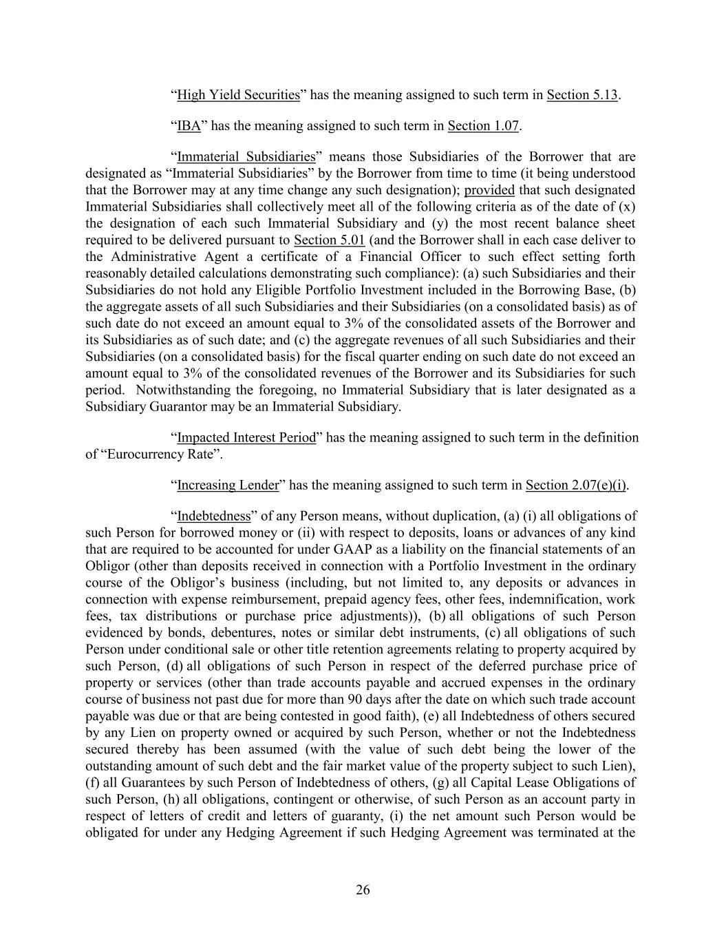 “High Yield Securities” has the meaning assigned to such term in Section 5.13. “IBA” has the meaning assigned to such term in Section 1.07. “Immaterial Subsidiaries” means those Subsidiaries of the Borrower that are designated as “Immaterial Subsidiaries” by the Borrower from time to time (it being understood that the Borrower may at any time change any such designation); provided that such designated Immaterial Subsidiaries shall collectively meet all of the following criteria as of the date of (x) the designation of each such Immaterial Subsidiary and (y) the most recent balance sheet required to be delivered pursuant to Section 5.01 (and the Borrower shall in each case deliver to the Administrative Agent a certificate of a Financial Officer to such effect setting forth reasonably detailed calculations demonstrating such compliance): (a) such Subsidiaries and their Subsidiaries do not hold any Eligible Portfolio Investment included in the Borrowing Base, (b) the aggregate assets of all such Subsidiaries and their Subsidiaries (on a consolidated basis) as of such date do not exceed an amount equal to 3% of the consolidated assets of the Borrower and its Subsidiaries as of such date; and (c) the aggregate revenues of all such Subsidiaries and their Subsidiaries (on a consolidated basis) for the fiscal quarter ending on such date do not exceed an amount equal to 3% of the consolidated revenues of the Borrower and its Subsidiaries for such period. Notwithstanding the foregoing, no Immaterial Subsidiary that is later designated as a Subsidiary Guarantor may be an Immaterial Subsidiary. “Impacted Interest Period” has the meaning assigned to such term in the definition of “Eurocurrency Rate”. “Increasing Lender” has the meaning assigned to such term in Section 2.07(e)(i). “Indebtedness” of any Person means, without duplication, (a) (i) all obligations of such Person for borrowed money or (ii) with respect to deposits, loans or advances of any kind that are required to be accounted for under GAAP as a liability on the financial statements of an Obligor (other than deposits received in connection with a Portfolio Investment in the ordinary course of the Obligor’s business (including, but not limited to, any deposits or advances in connection with expense reimbursement, prepaid agency fees, other fees, indemnification, work fees, tax distributions or purchase price adjustments)), (b) all obligations of such Person evidenced by bonds, debentures, notes or similar debt instruments, (c) all obligations of such Person under conditional sale or other title retention agreements relating to property acquired by such Person, (d) all obligations of such Person in respect of the deferred purchase price of property or services (other than trade accounts payable and accrued expenses in the ordinary course of business not past due for more than 90 days after the date on which such trade account payable was due or that are being contested in good faith), (e) all Indebtedness of others secured by any Lien on property owned or acquired by such Person, whether or not the Indebtedness secured thereby has been assumed (with the value of such debt being the lower of the outstanding amount of such debt and the fair market value of the property subject to such Lien), (f) all Guarantees by such Person of Indebtedness of others, (g) all Capital Lease Obligations of such Person, (h) all obligations, contingent or otherwise, of such Person as an account party in respect of letters of credit and letters of guaranty, (i) the net amount such Person would be obligated for under any Hedging Agreement if such Hedging Agreement was terminated at the 26