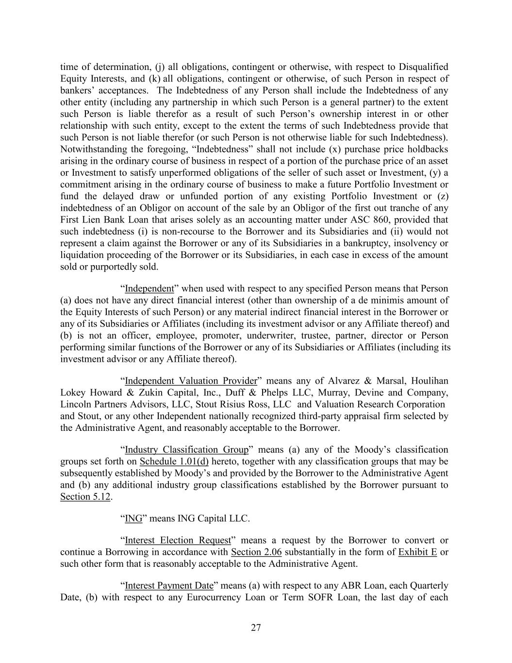 time of determination, (j) all obligations, contingent or otherwise, with respect to Disqualified Equity Interests, and (k) all obligations, contingent or otherwise, of such Person in respect of bankers’ acceptances. The Indebtedness of any Person shall include the Indebtedness of any other entity (including any partnership in which such Person is a general partner) to the extent such Person is liable therefor as a result of such Person’s ownership interest in or other relationship with such entity, except to the extent the terms of such Indebtedness provide that such Person is not liable therefor (or such Person is not otherwise liable for such Indebtedness). Notwithstanding the foregoing, “Indebtedness” shall not include (x) purchase price holdbacks arising in the ordinary course of business in respect of a portion of the purchase price of an asset or Investment to satisfy unperformed obligations of the seller of such asset or Investment, (y) a commitment arising in the ordinary course of business to make a future Portfolio Investment or fund the delayed draw or unfunded portion of any existing Portfolio Investment or (z) indebtedness of an Obligor on account of the sale by an Obligor of the first out tranche of any First Lien Bank Loan that arises solely as an accounting matter under ASC 860, provided that such indebtedness (i) is non-recourse to the Borrower and its Subsidiaries and (ii) would not represent a claim against the Borrower or any of its Subsidiaries in a bankruptcy, insolvency or liquidation proceeding of the Borrower or its Subsidiaries, in each case in excess of the amount sold or purportedly sold. “Independent” when used with respect to any specified Person means that Person (a) does not have any direct financial interest (other than ownership of a de minimis amount of the Equity Interests of such Person) or any material indirect financial interest in the Borrower or any of its Subsidiaries or Affiliates (including its investment advisor or any Affiliate thereof) and (b) is not an officer, employee, promoter, underwriter, trustee, partner, director or Person performing similar functions of the Borrower or any of its Subsidiaries or Affiliates (including its investment advisor or any Affiliate thereof). “Independent Valuation Provider” means any of Alvarez & Marsal, Houlihan Lokey Howard & Zukin Capital, Inc., Duff & Phelps LLC, Murray, Devine and Company, Lincoln Partners Advisors, LLC, Stout Risius Ross, LLC and Valuation Research Corporation and Stout, or any other Independent nationally recognized third-party appraisal firm selected by the Administrative Agent, and reasonably acceptable to the Borrower. “Industry Classification Group” means (a) any of the Moody’s classification groups set forth on Schedule 1.01(d) hereto, together with any classification groups that may be subsequently established by Moody’s and provided by the Borrower to the Administrative Agent and (b) any additional industry group classifications established by the Borrower pursuant to Section 5.12. “ING” means ING Capital LLC. “Interest Election Request” means a request by the Borrower to convert or continue a Borrowing in accordance with Section 2.06 substantially in the form of Exhibit E or such other form that is reasonably acceptable to the Administrative Agent. “Interest Payment Date” means (a) with respect to any ABR Loan, each Quarterly Date, (b) with respect to any Eurocurrency Loan or Term SOFR Loan, the last day of each 27